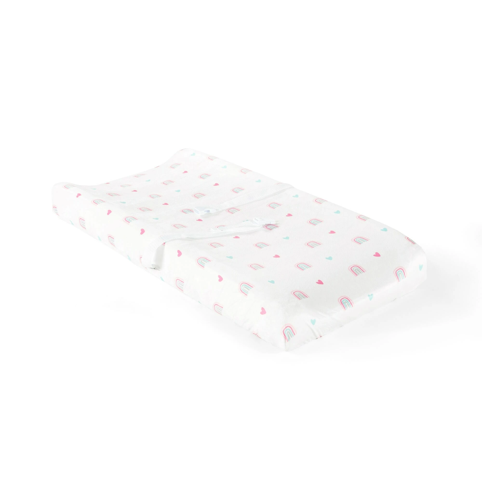 Decorate your baby’s nursery with the sweetest hand designed accessories. This changing pad cover is adorned with adorable illustrations of hearts and rainbows. It is soft to the touch for your little one’s comfort and wellbeing. Add this cover to almost any nursery theme. This changing pad cover measures 16 inches by 32 inches and has a height of 5 inches. This product is STANDARD 100 by OEKO-TEX® certified, which means the fabric, dye and all components have been tested in an independent laboratory and certified against a list of more than 350 harmful substances. Please refer to label for full care instructions.