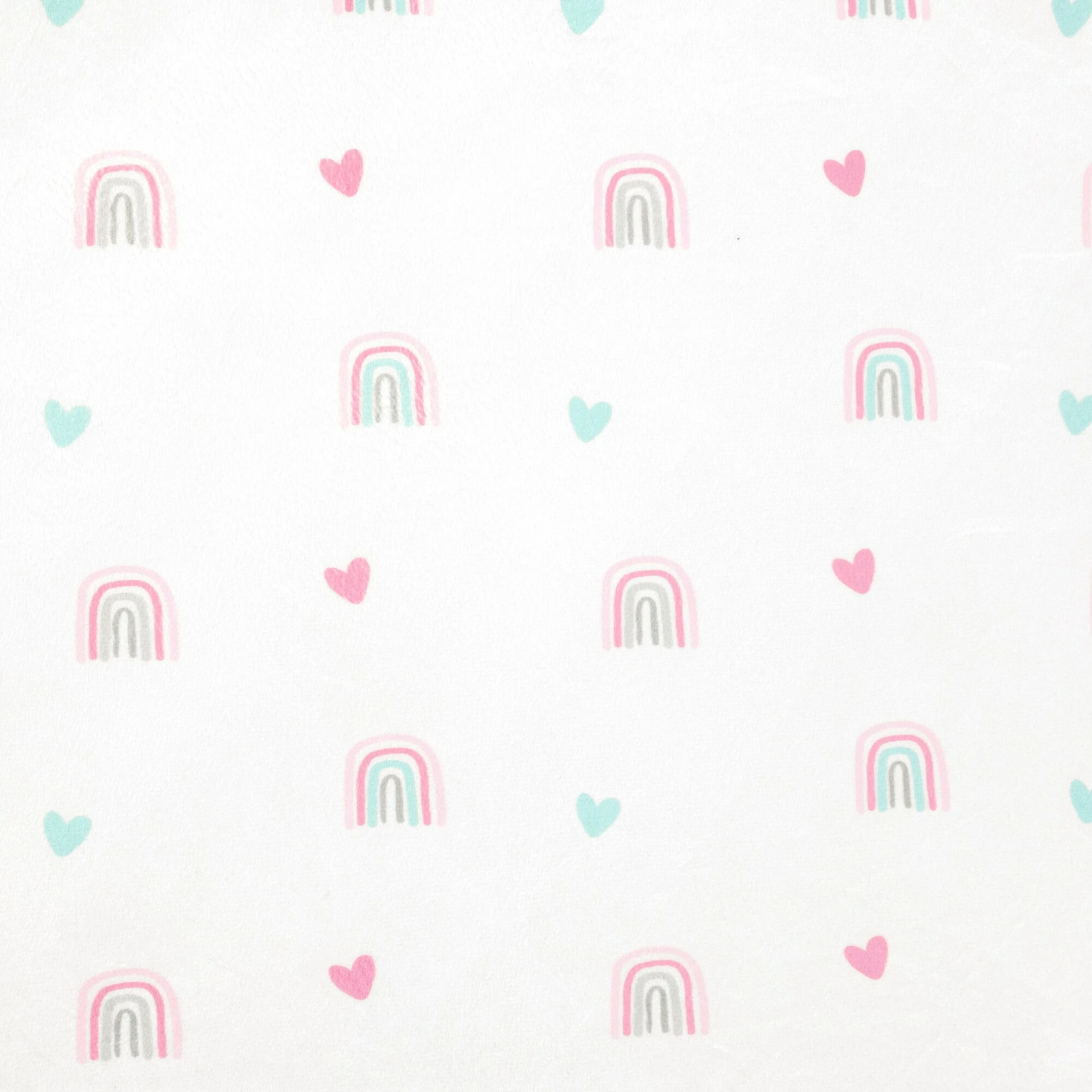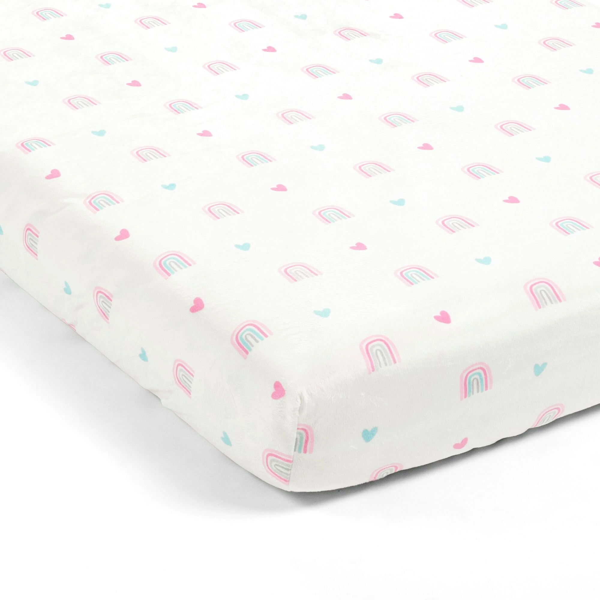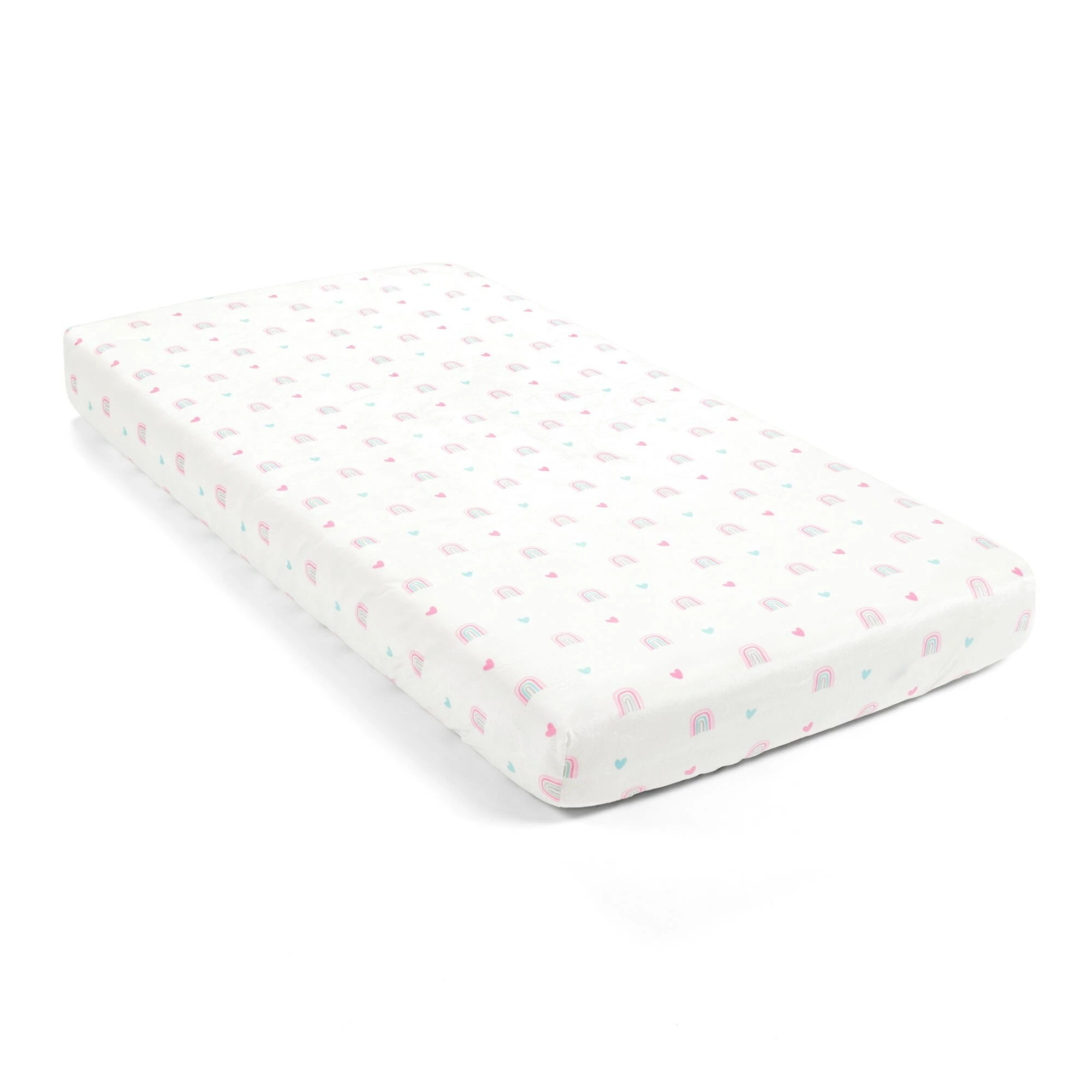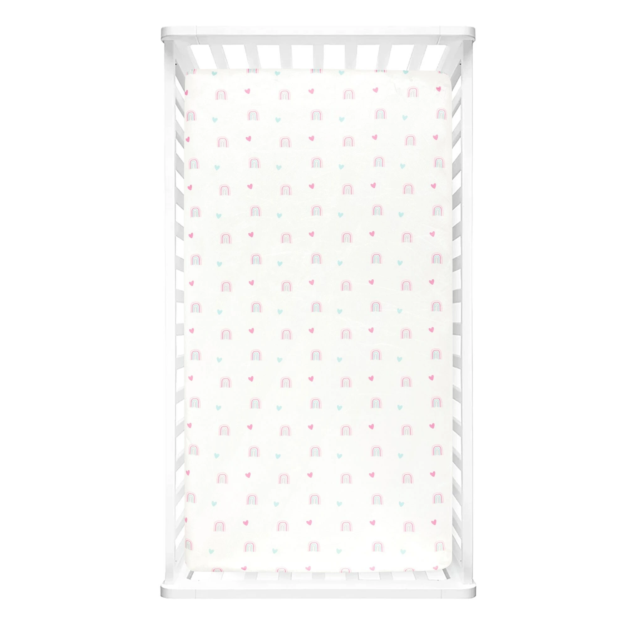 Dress your crib with this lovely colorful themed fitted crib sheet. This sheet is covered in little hand drawn hearts and rainbows. It is soft to the touch for your baby’s comfort and wellbeing. This timeless pattern fits into many different nursery décor themes. The crib sheet measures 28 inches by 52 inches with a height of 9 inches. This product is STANDARD 100 by OEKO-TEX® certified, which means the fabric, dye and all components have been tested in an independent laboratory and certified against a list of more than 350 harmful substances. Please refer to label for full care instructions.