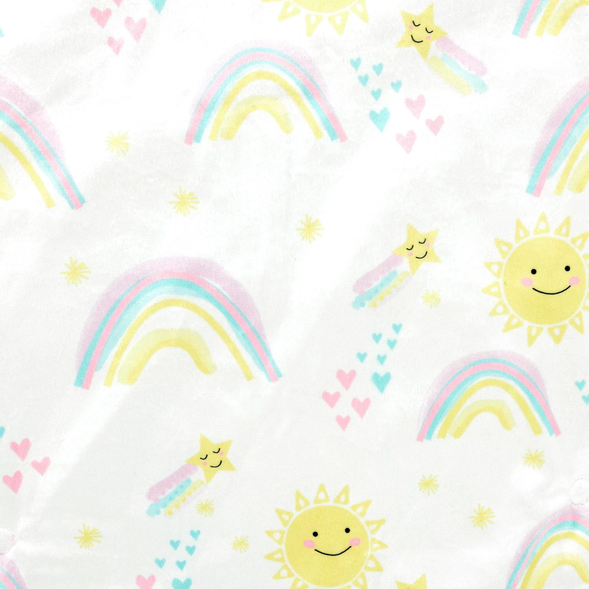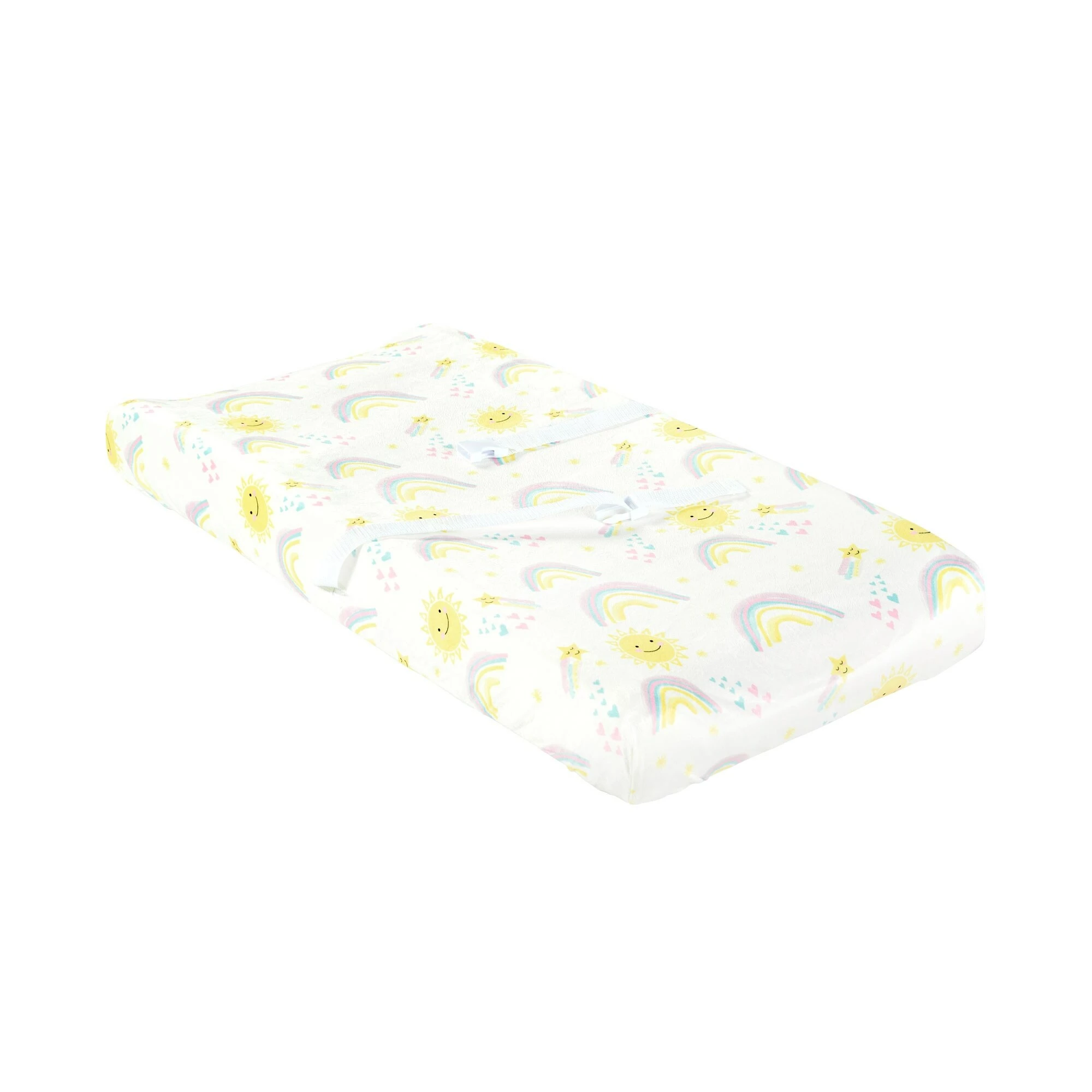 Decorate your nursery with this adorable sunshine and rainbow pattern. Each hand drawn illustration shines bright with a smiling sun and cartoon-like rainbow. The beautiful color palette gives you freedom to expand and decorate your nursery theme with bursts of pinks, purples, blues and yellows. This changing pad cover measures 16 inches by 32 inches and has a height of 5 inches. This product is STANDARD 100 by OEKO-TEX® certified, which means the fabric, dye and all components have been tested in an independent laboratory and certified against a list of more than 350 harmful substances. Please refer to label for full care instructions.