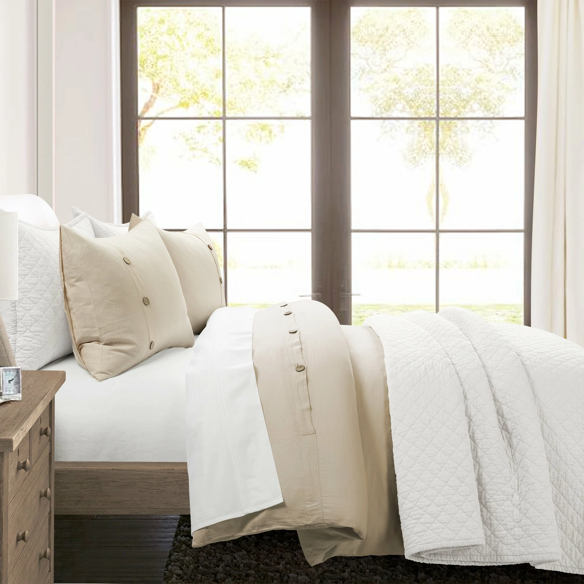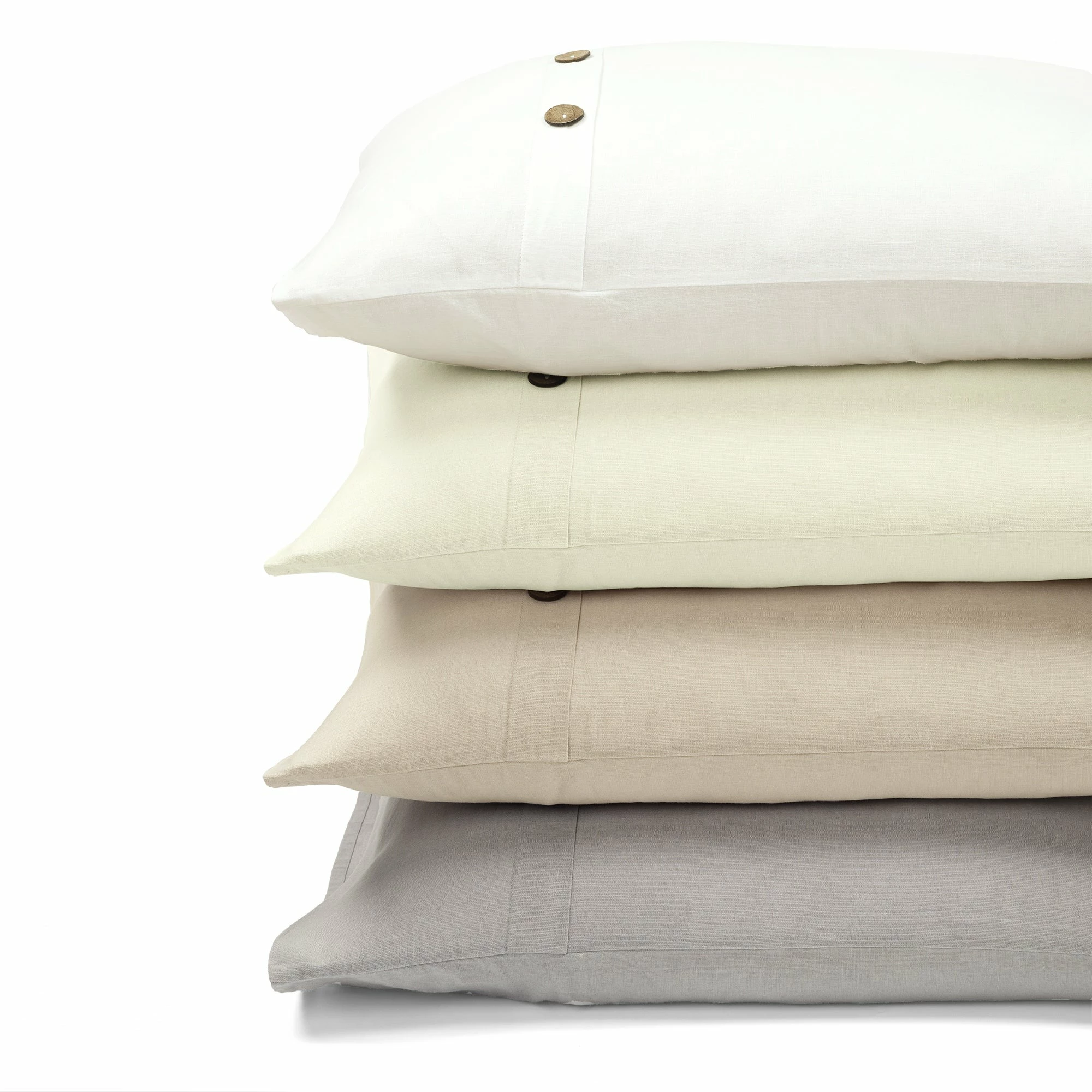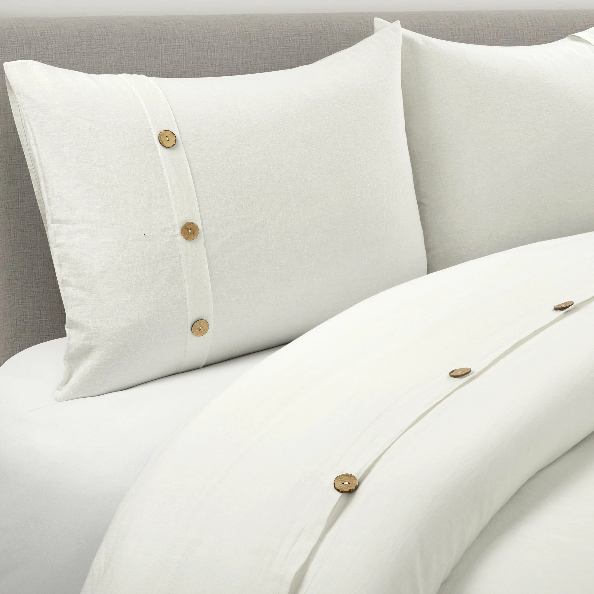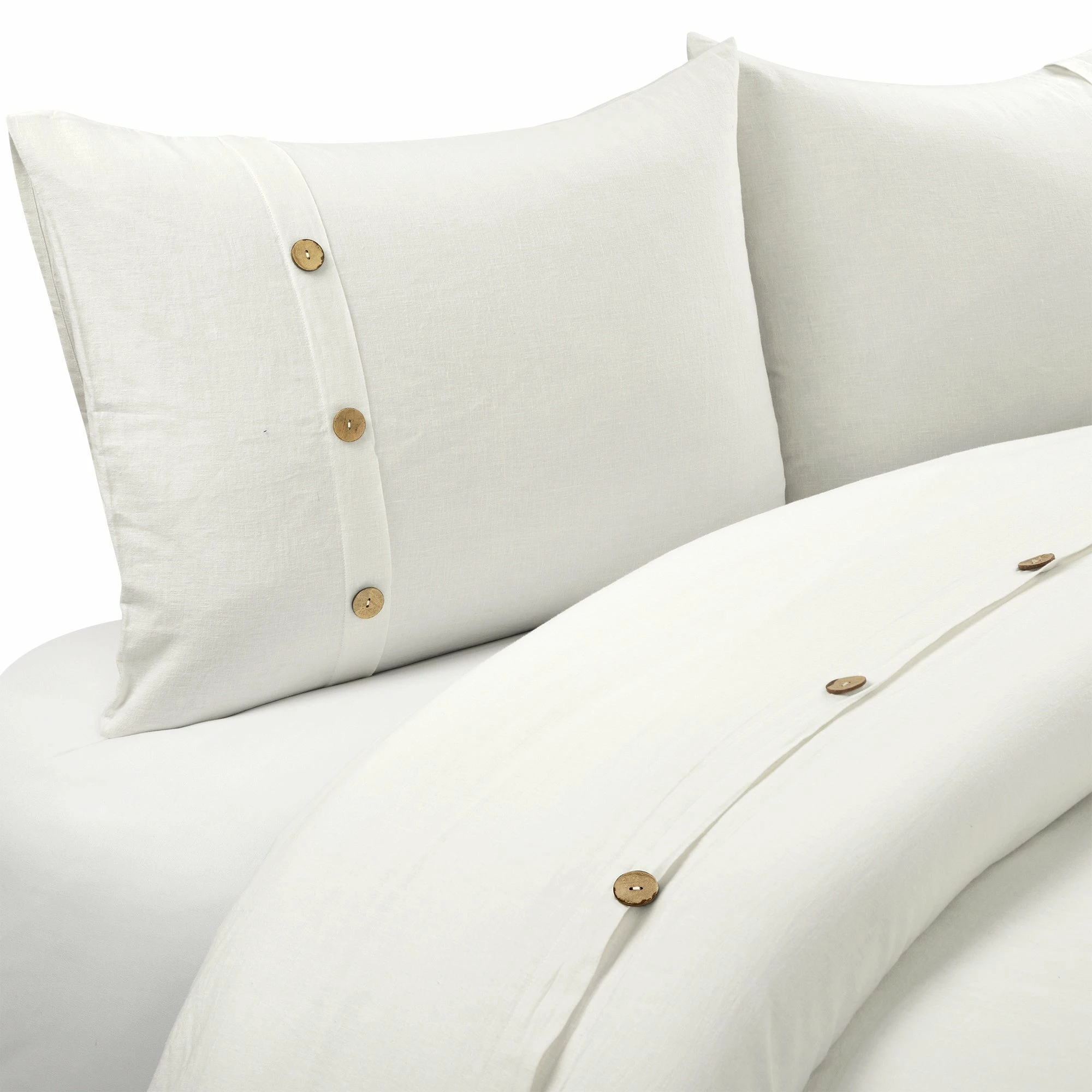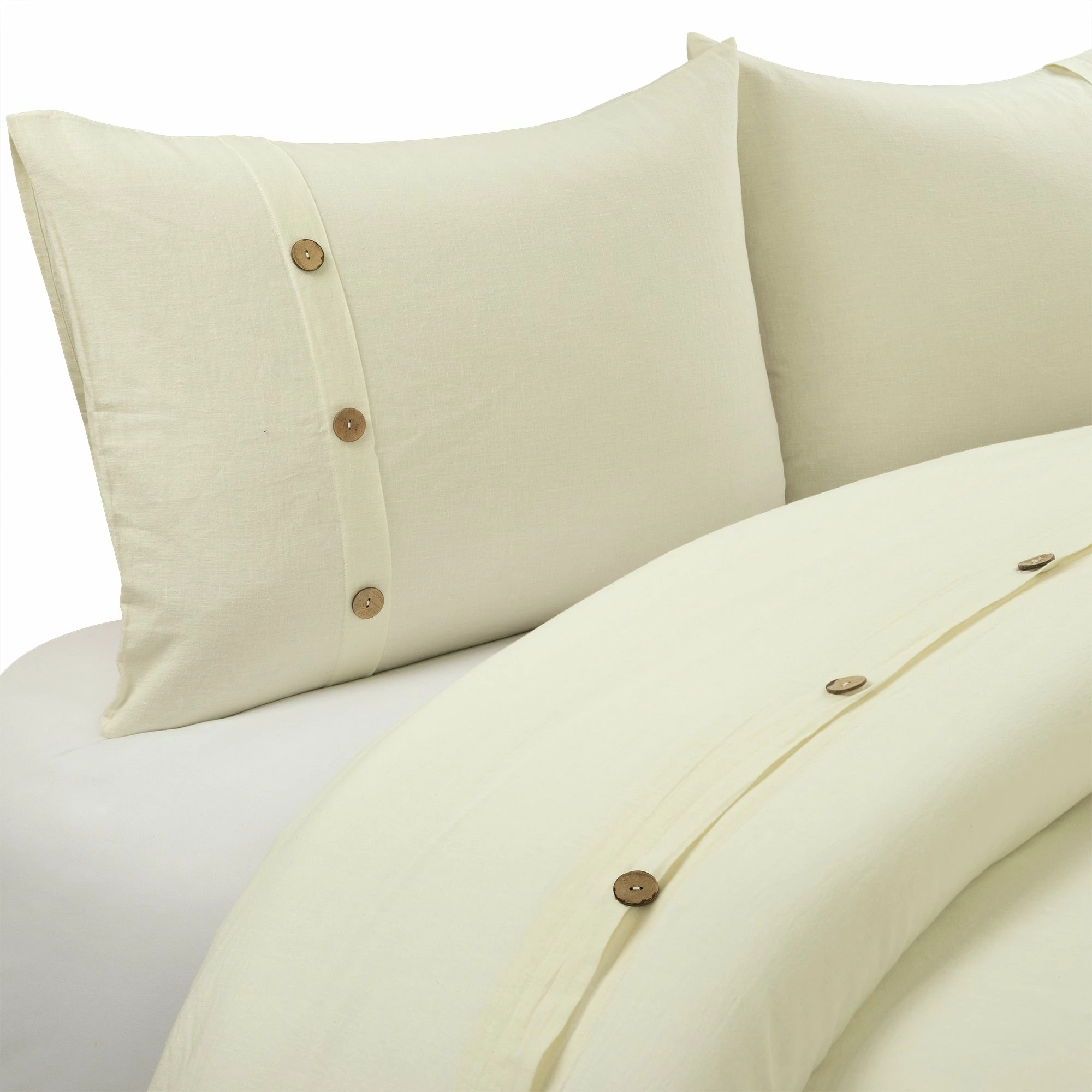Luxury and comfort find a harmonious balance with this duvet cover set. Thermal regulation and durability are just a few of the superior benefits of this fabric Belgian flax cotton blend. Garment washed for appearance and comfort, this duvet cover and matching shams are embellished with coconut shaded buttons for a casual yet elegant look. Textured and lightweight, this duvet cover set is woven together with an exceptional Belgian flax linen blend. Unmatched by comfort, the soft fabric receives its luxurious feel from a thoughtful combination of linen and cotton. The fibers of Belgian flax linen are highly sustainable, making this a very eco-friendly option. Simply secure your duvet cover using the button closures and use the four internal corner ties to keep your comforter in place. This set includes one duvet cover and two matching shams. Please refer to label for full care instructions.