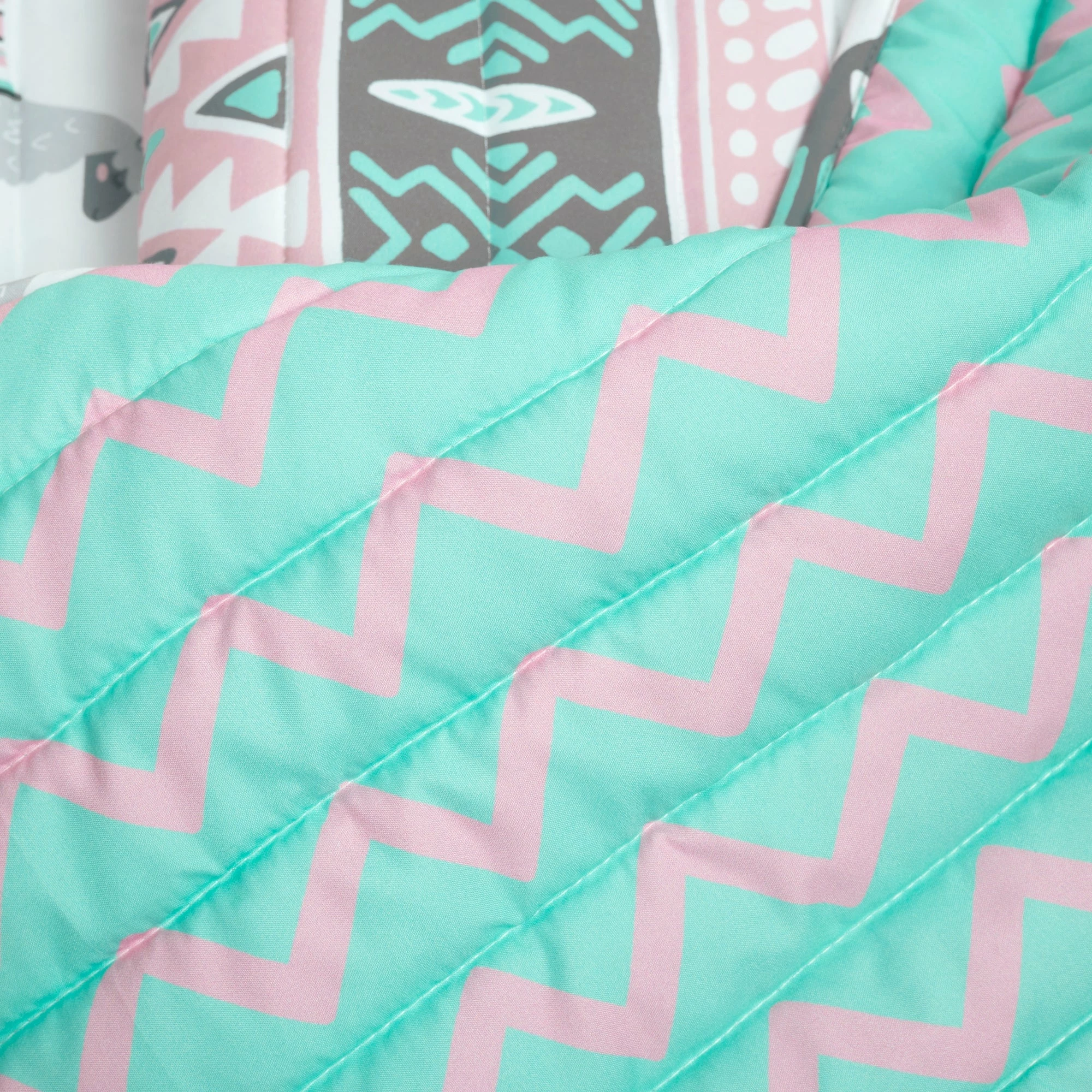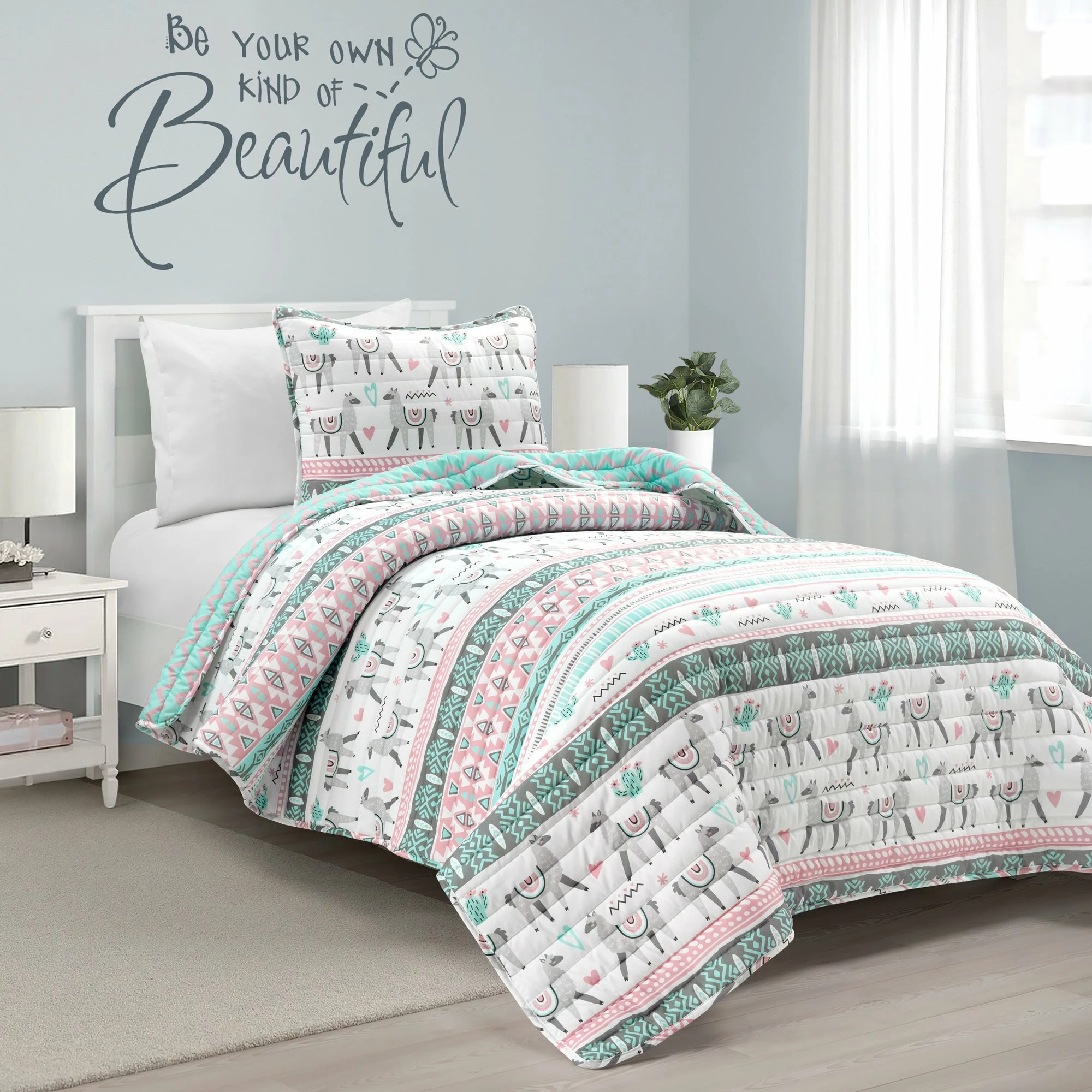 This boho llama pattern mixes a chic southwest design with eclectic graphics for a bright and fun look. There are so many motivating colors and details in this bedding to inspire a colorful and cheery bohemian bedroom. Don’t forget to utilize the chevron reverse pattern for endless bed styling options. With this generously sized quilt, you can be cozy in this set all year round. This set includes 1 quilt and 1 matching sham. Please refer to label for full care instructions.