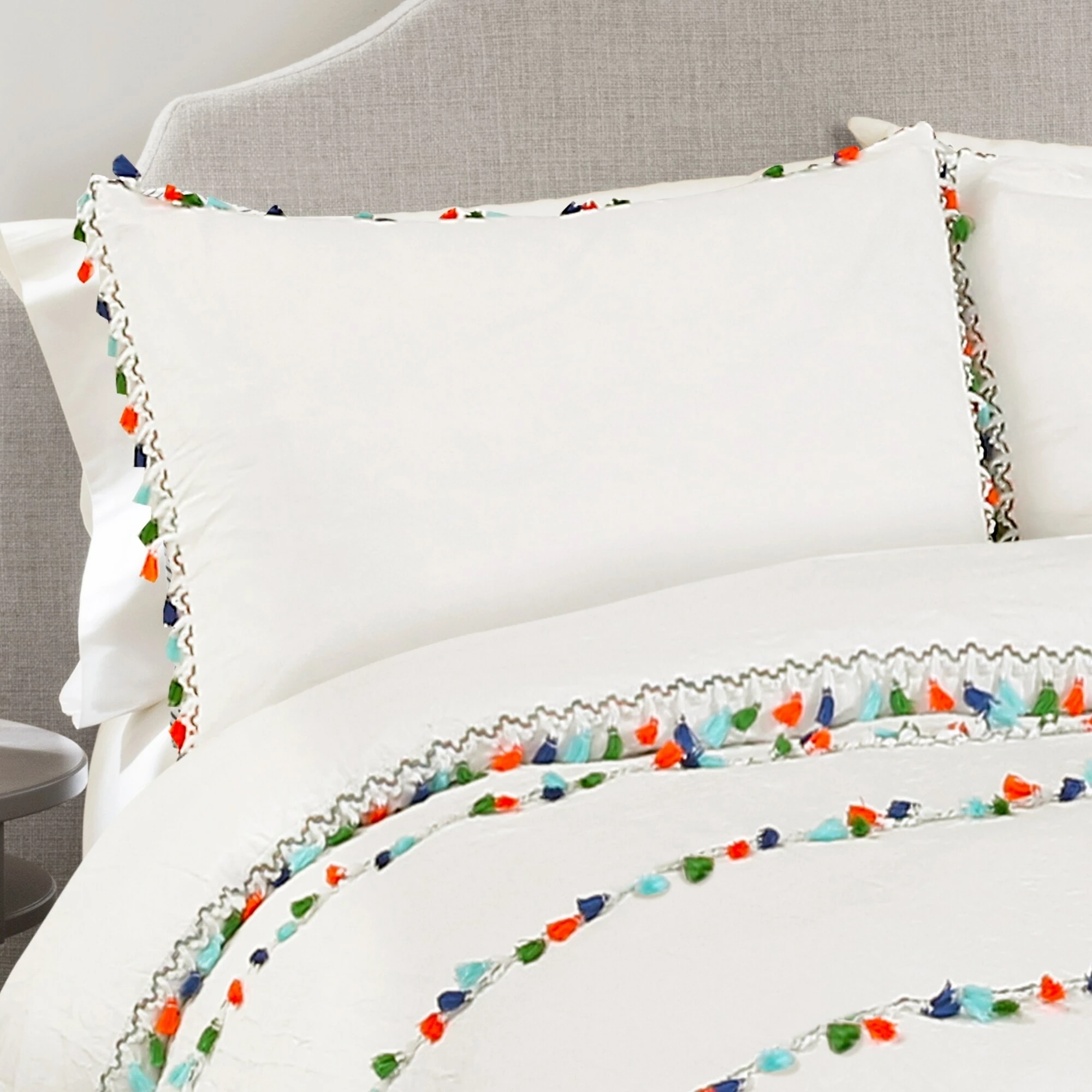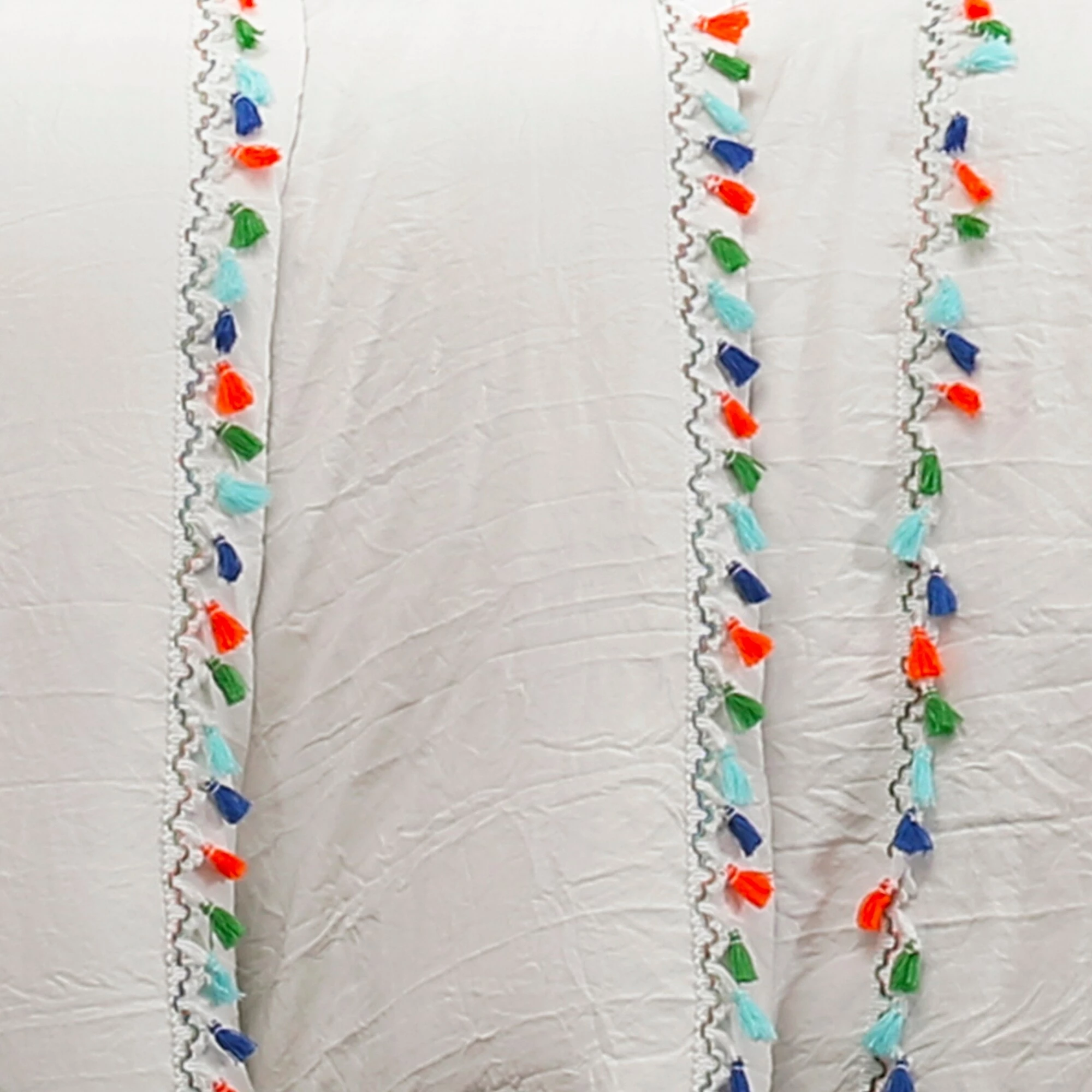 This fun and eclectic bohemian style comforter set features rows of colorful tassels on the comforter and a border of colorful tassels on the pillow shams. It creates the look of a rainbow in the bedroom without being too garish.Β