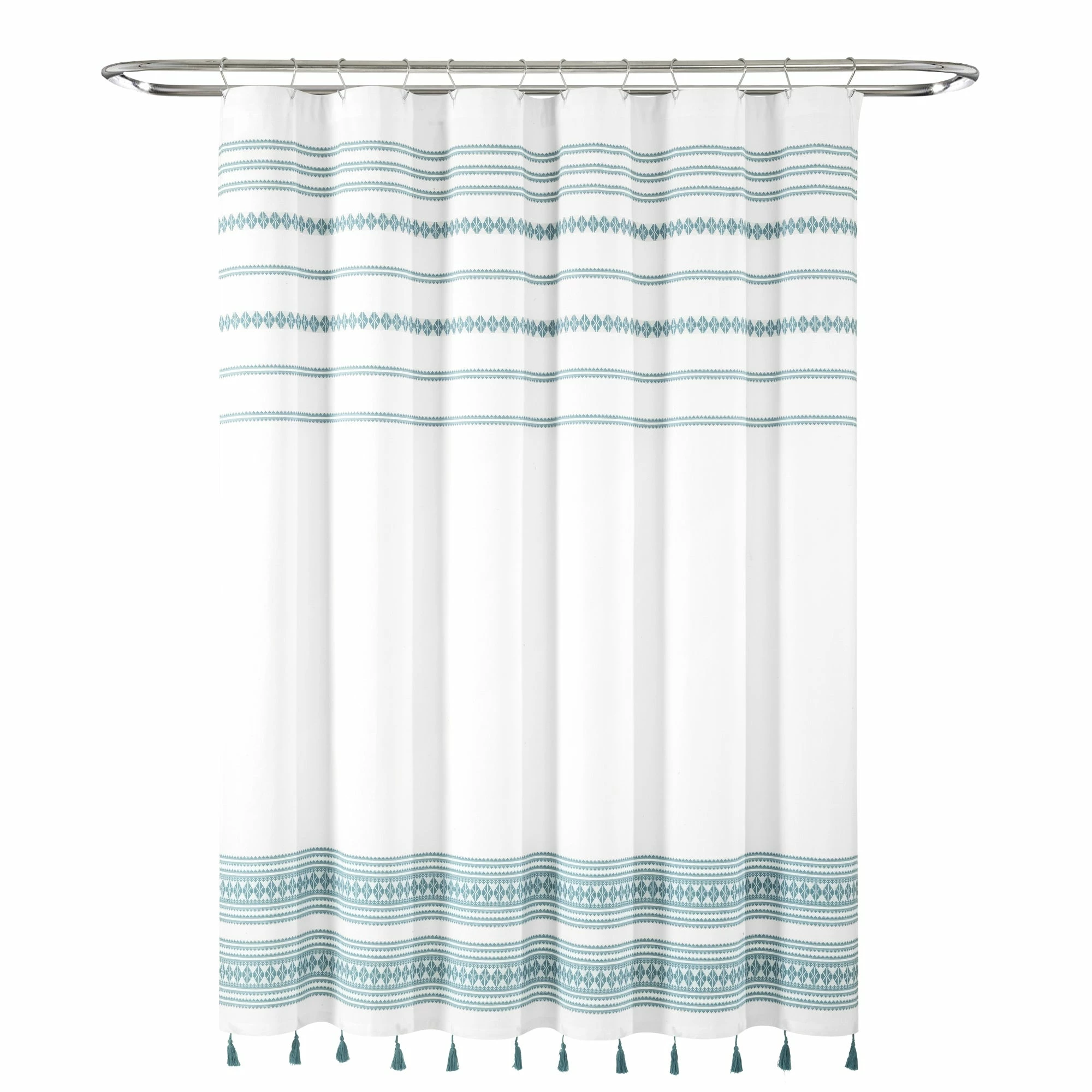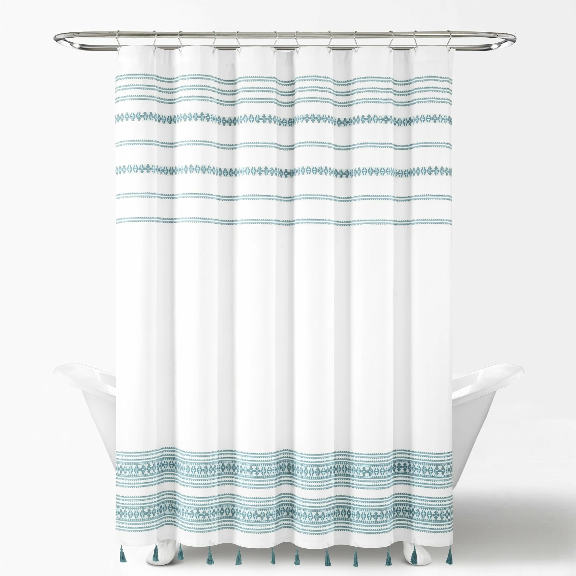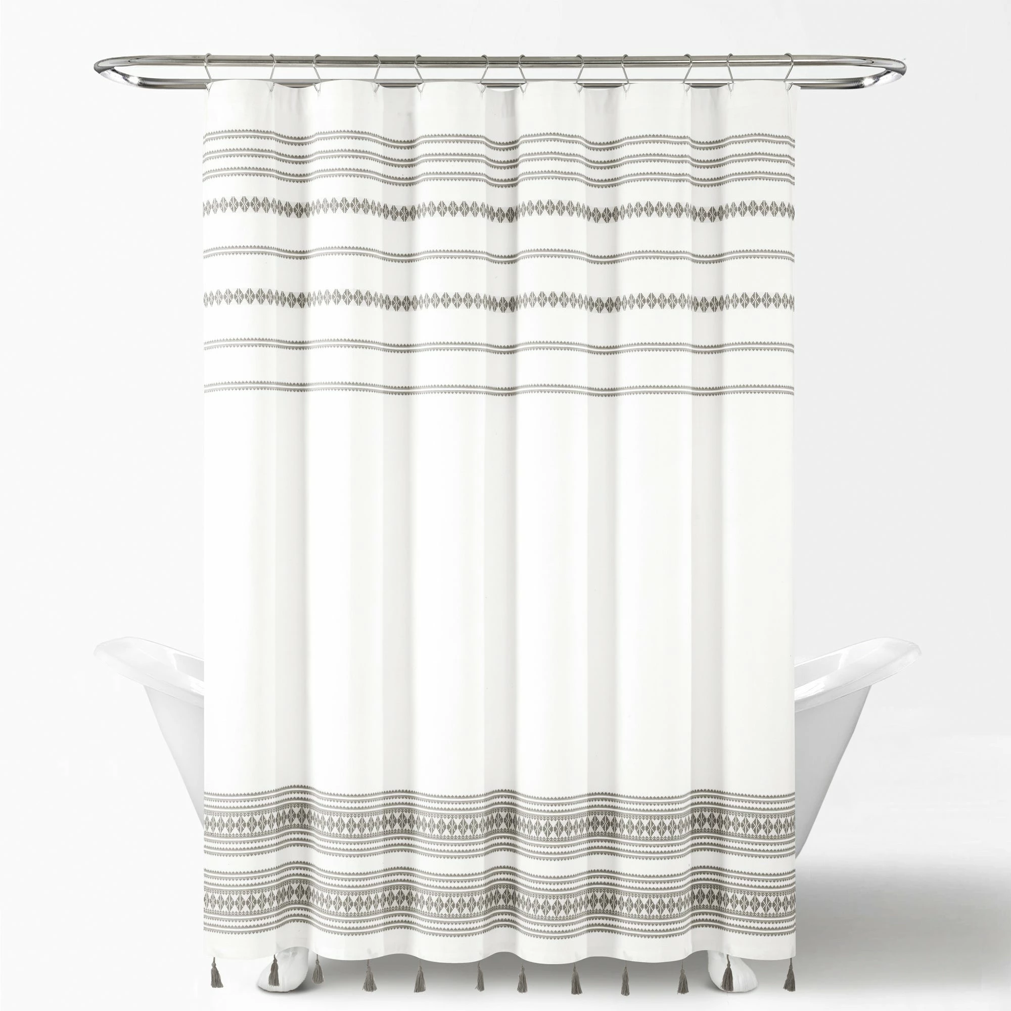 Add this chic Aztec inspired shower curtain to your primary, guest, or teen’s bathroom. This curtain has a white base with a neutral colored intricate woven jacquard pattern that displays different geometric stripes accented with matching colored tassels at the bottom. The textured design and charming tassel detail will give your space new life. The eco-friendly recycled cotton makes this a purchase you can feel good about. The shower curtain measures 72 inches by 72 inches. It will hang easily with any standard shower curtain rings or hooks (sold separately). This product contains 100% GRS certified recycled material, certified by GSCI. Please refer to the care label for full instructions before washing.