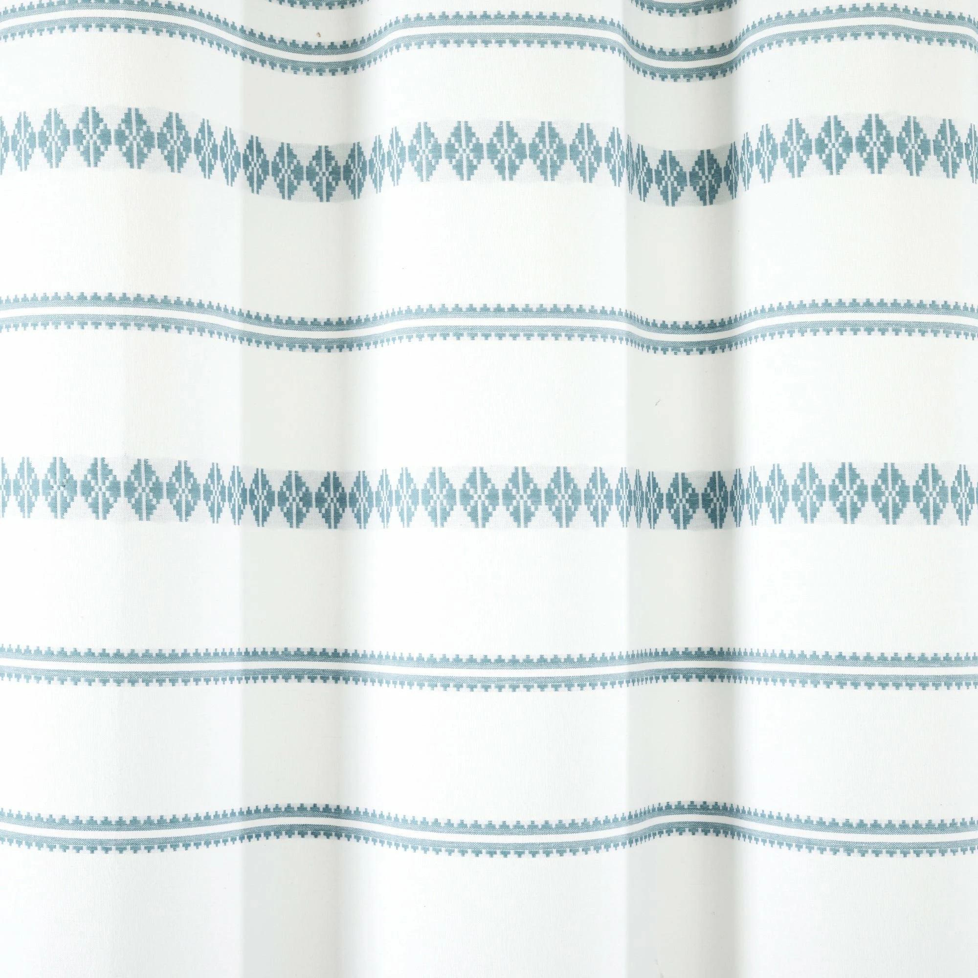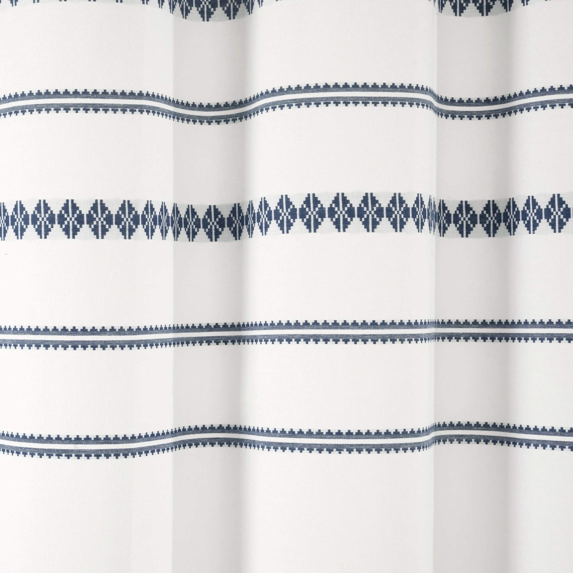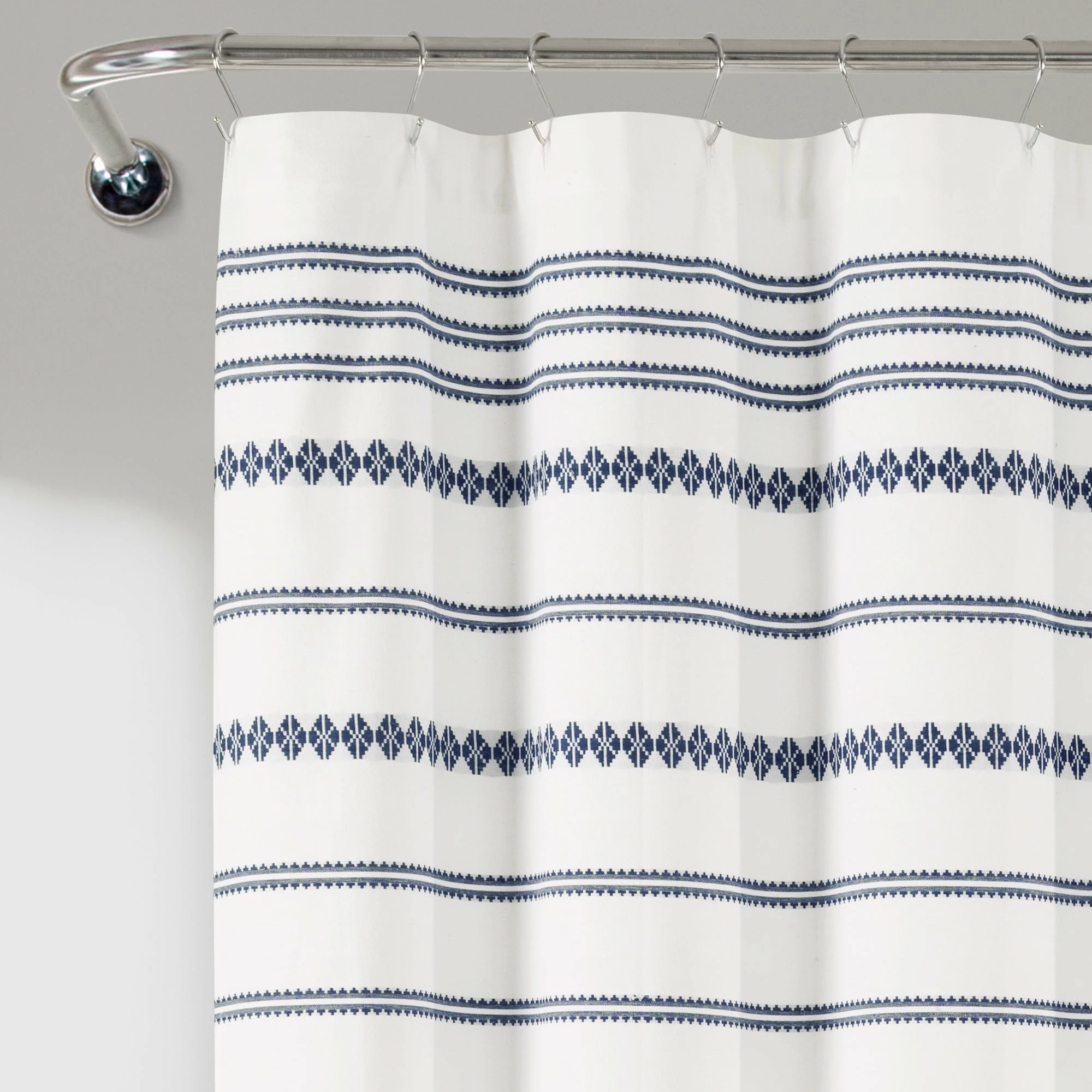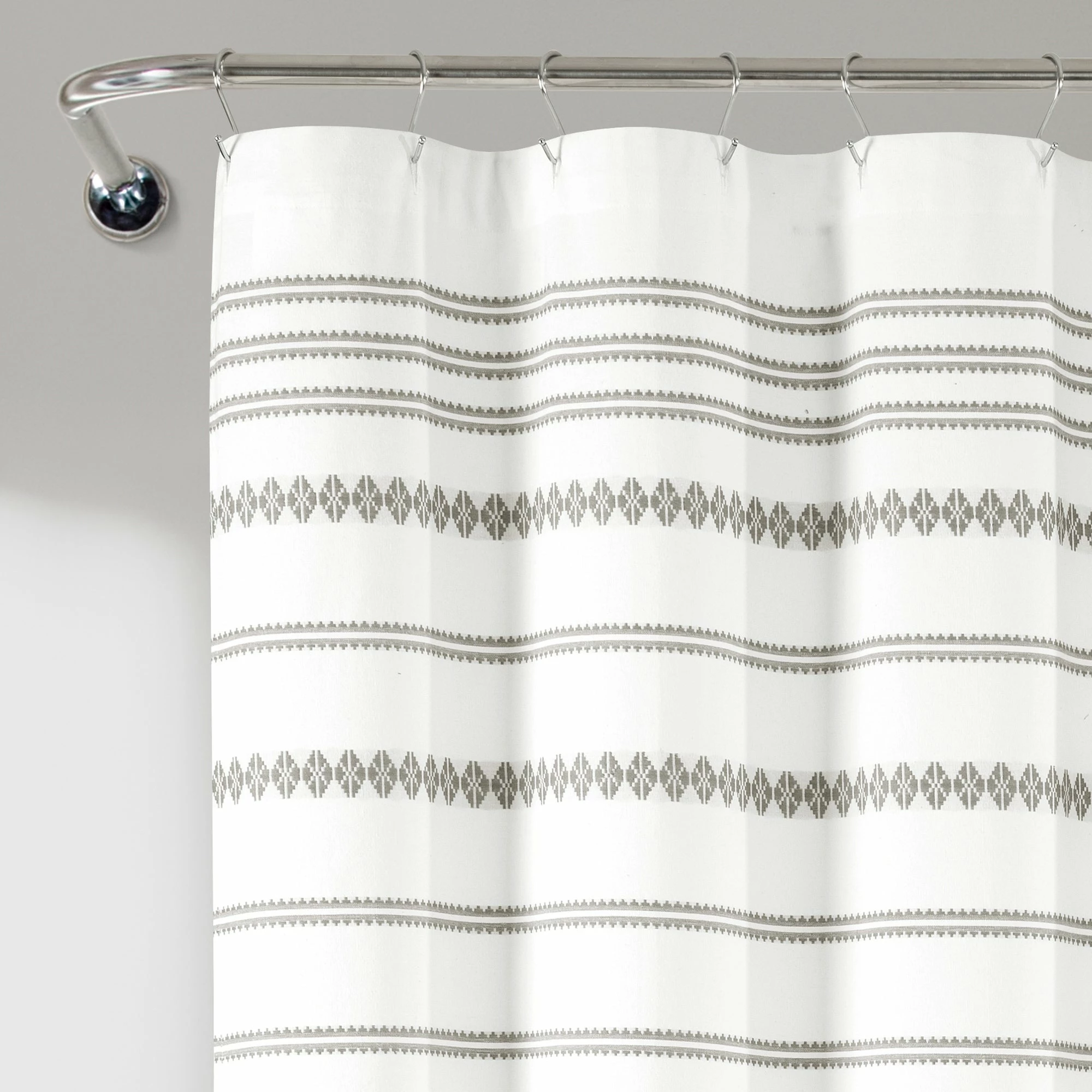 Add this chic Aztec inspired shower curtain to your primary, guest, or teen’s bathroom. This curtain has a white base with a neutral colored intricate woven jacquard pattern that displays different geometric stripes accented with matching colored tassels at the bottom. The textured design and charming tassel detail will give your space new life. The eco-friendly recycled cotton makes this a purchase you can feel good about. The shower curtain measures 72 inches by 72 inches. It will hang easily with any standard shower curtain rings or hooks (sold separately). This product contains 100% GRS certified recycled material, certified by GSCI. Please refer to the care label for full instructions before washing.