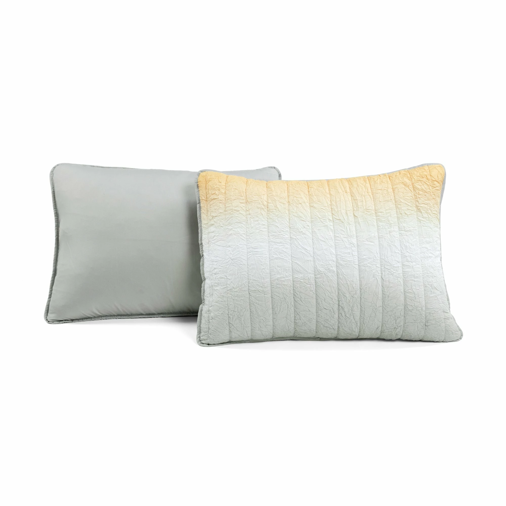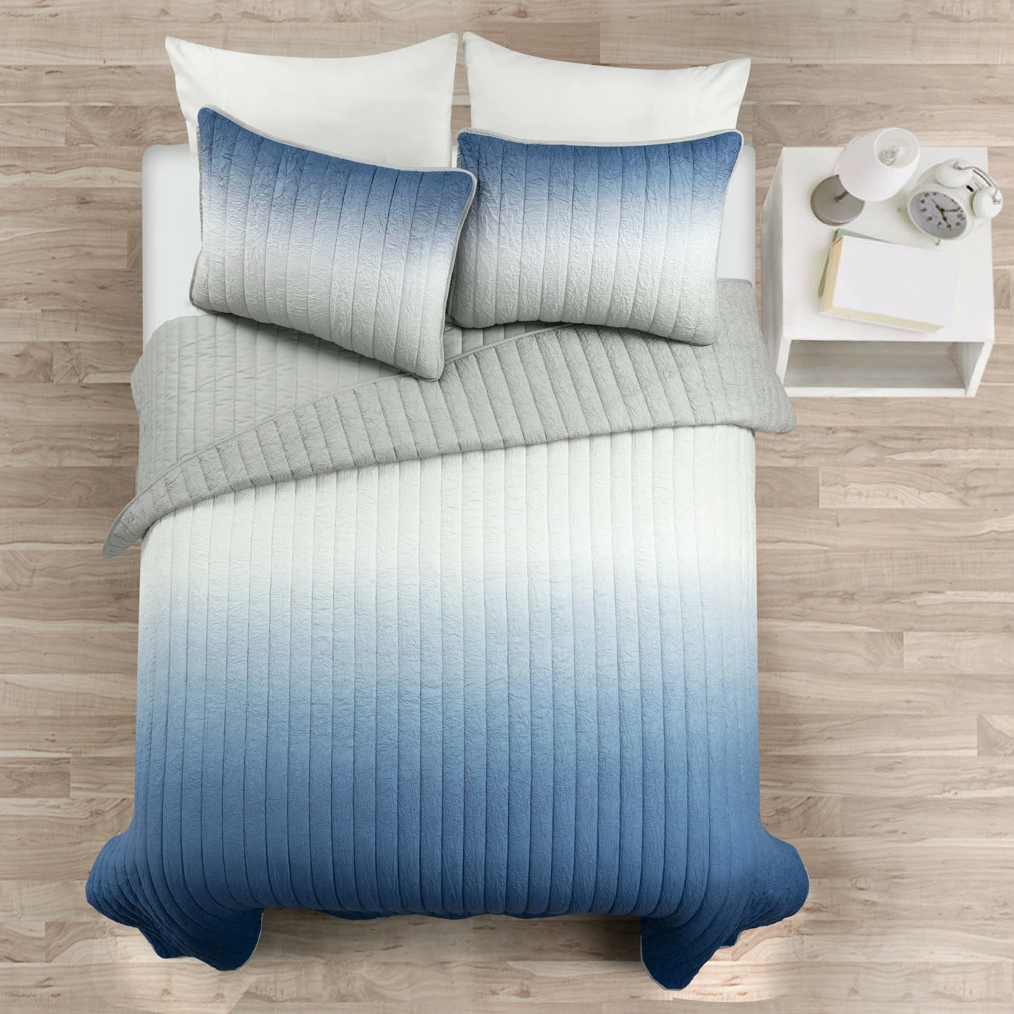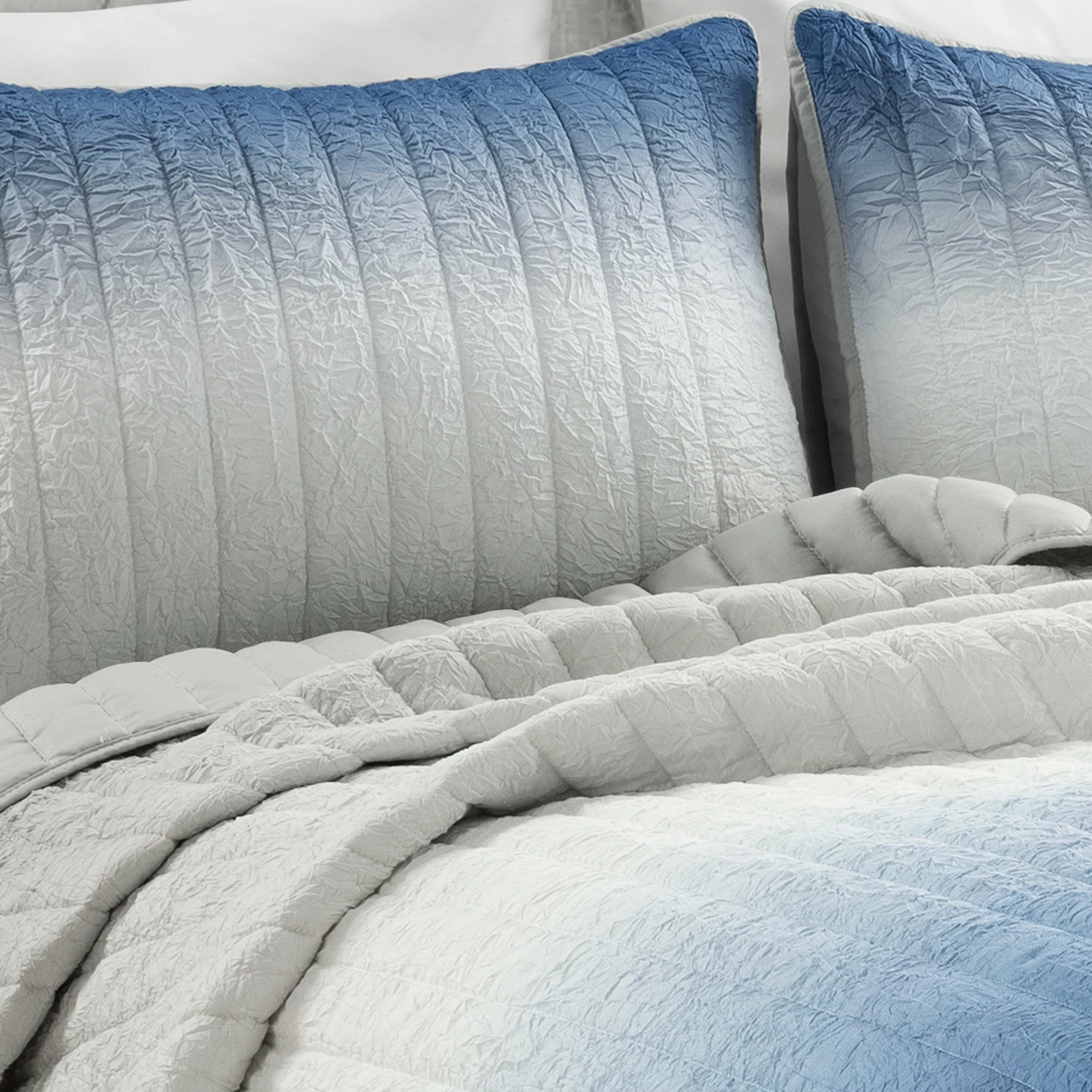 Bring fun and comfort to your bedroom with this three piece quilt set. The soft crinkles in the fabric along with the quilted detailing provide maximum comfort and a unique look. The trendy ombre pattern perfectly blends these complementary colors together making it easy to add your own home accessories to complete the look. This set includes one quilt and two shams. This quilt set is STANDARD 100 by OEKO-TEX® certified, which means the fabric, dyes and all components have been tested in an independent laboratory and certified against a list of more than 350 harmful substances. Please refer to label for full care instruction.