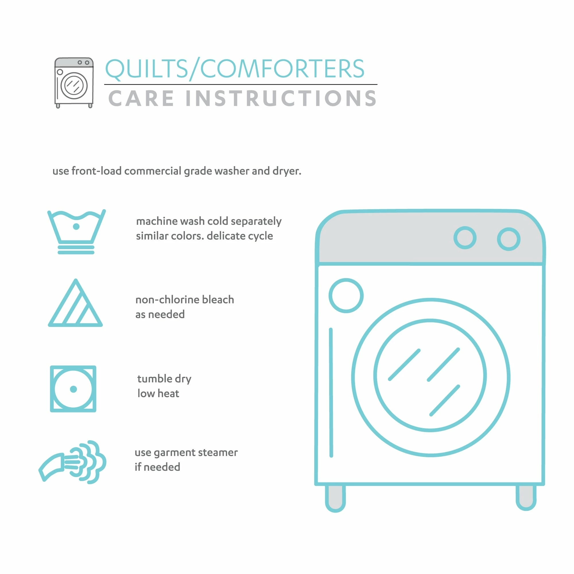 - Use Front-Load Commercial Grade Washer And Dryer. Machine Wash Cold Separately With Similar Colors. Delicate Cycle. Use Only Non-Chlorine Bleach If Needed.