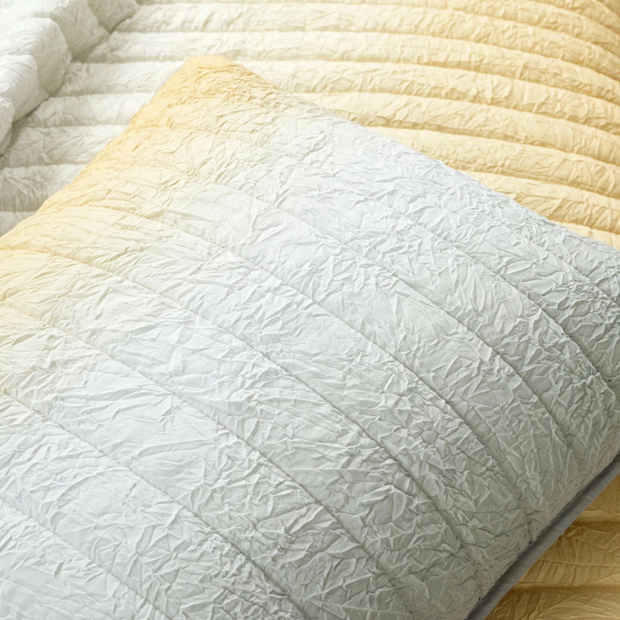 Style and texture find balance in this unique quilt set. The cozy crinkled fabric is detailed with a fun quilted pattern. This three piece set features a trendy ombre design showcasing the bold colors.