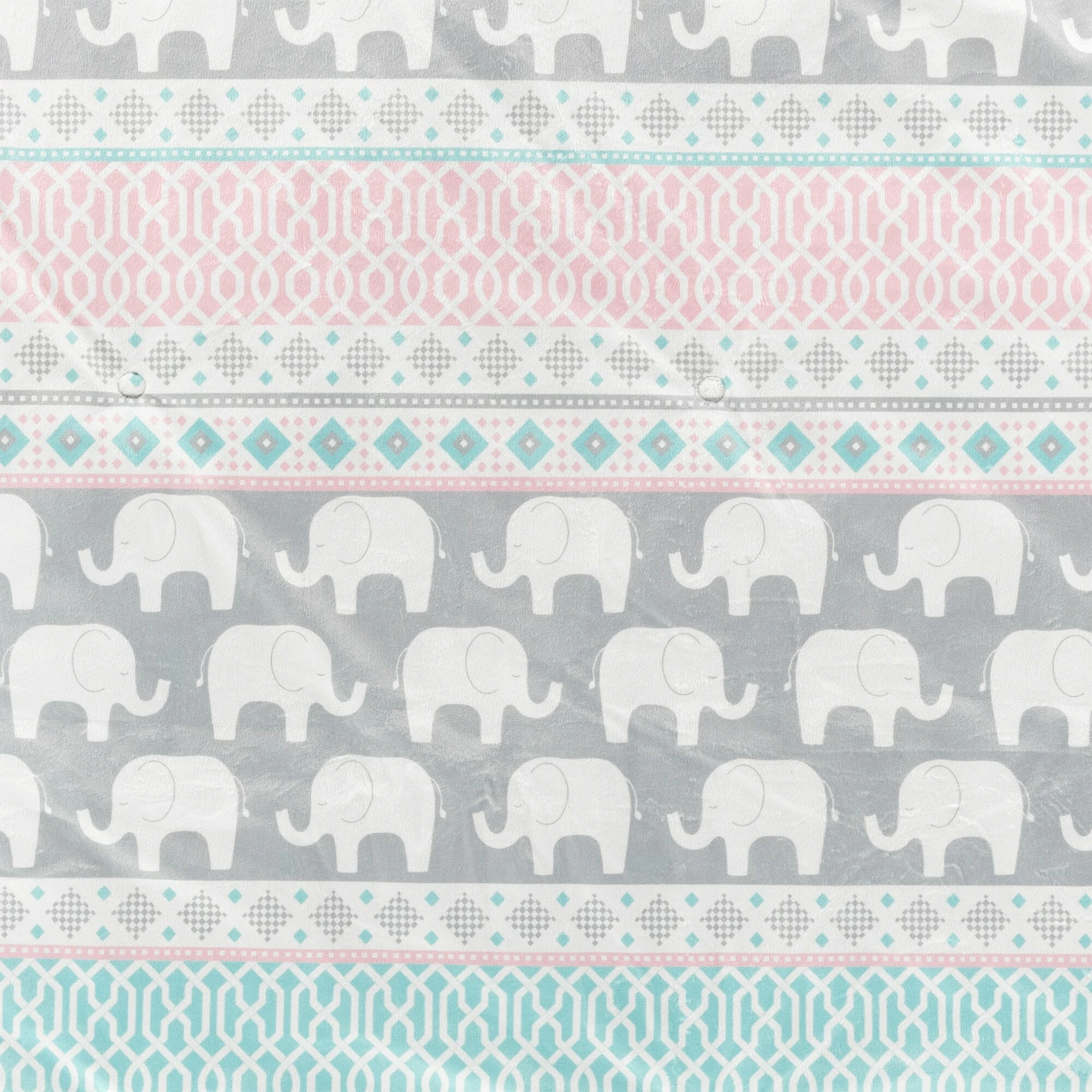 Style your little one’s nursery with this cozy oversized elephant print blanket. Decorated with rows of elephants on the front and a polka dot design on the back, this blanket gives you two looks in one. Easily style these soft shades with complementary colors for a complete look. Shop our elephant stripe collection and coordinate this baby blanket with the other pieces in the collection. This blanket measures 36 inches by 50 inches. Please refer to label for full care instructions.