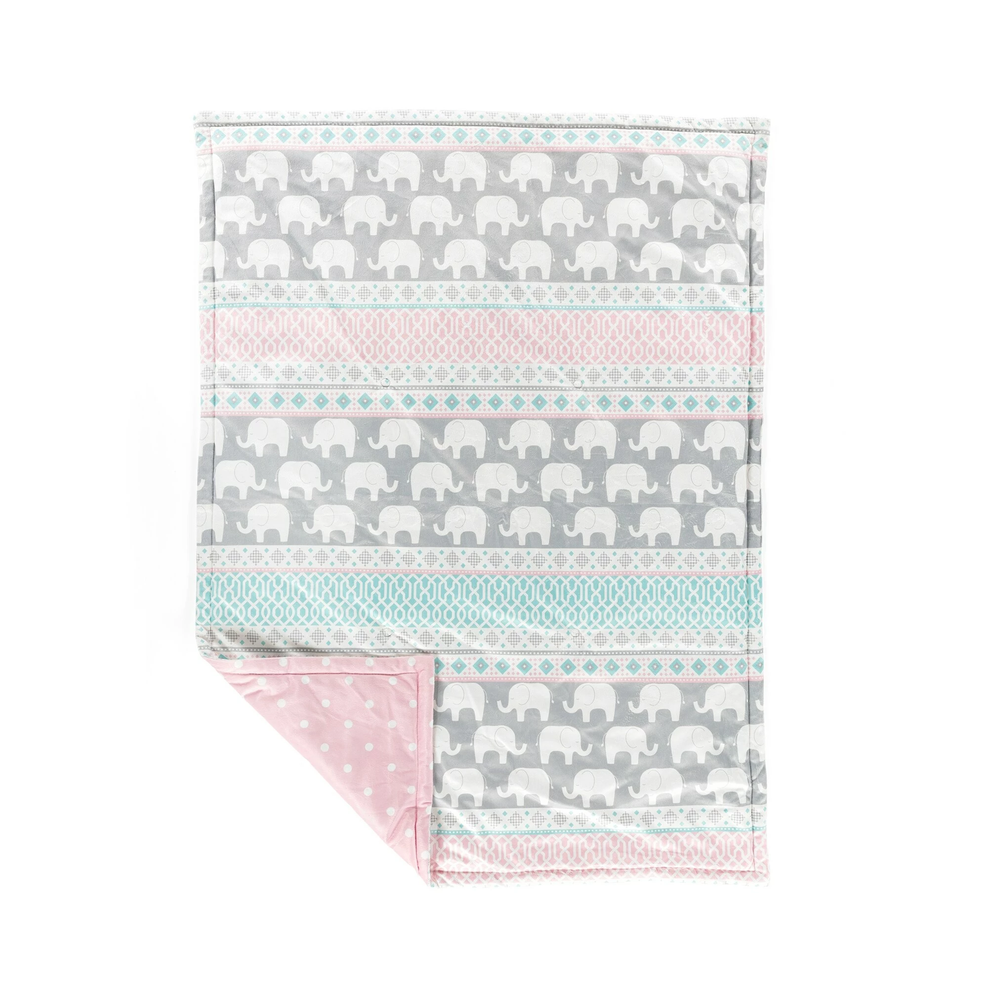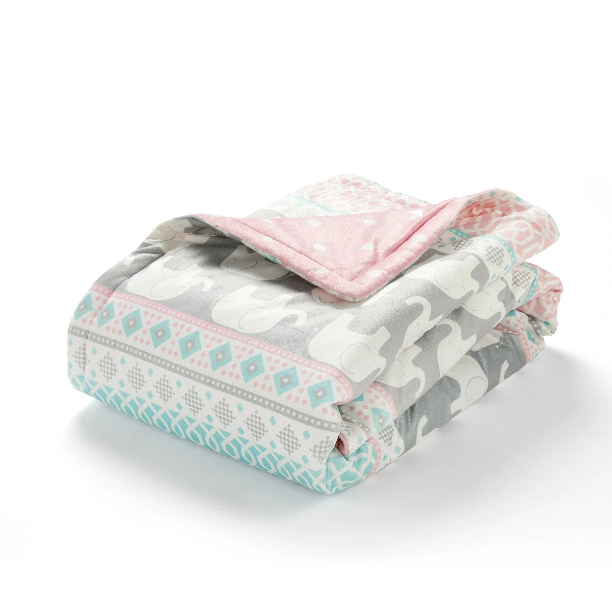 This cozy oversized blanket features two adorable designs for your little one! A stylish elephant stripe pattern and reverse polka dot print decorate this soft plush baby blanket. The soft colors make this the perfect accessory for your nursery.