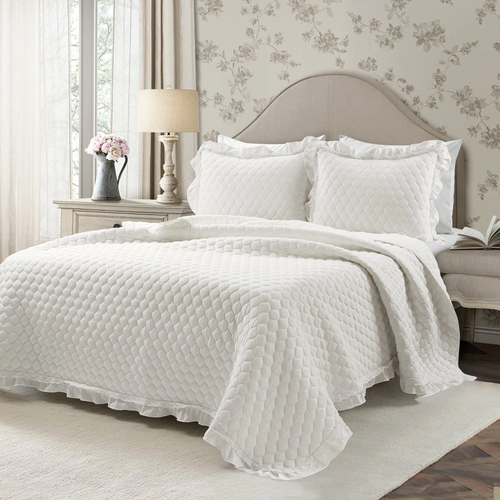 Bring a classic touch of femininity to your guest or master bedroom with this charming quilt set. The unique lace detailing lines the edges of each piece and extends into a ruffle accent. This 3 piece set is soft to the touch and is perfect all seasons.