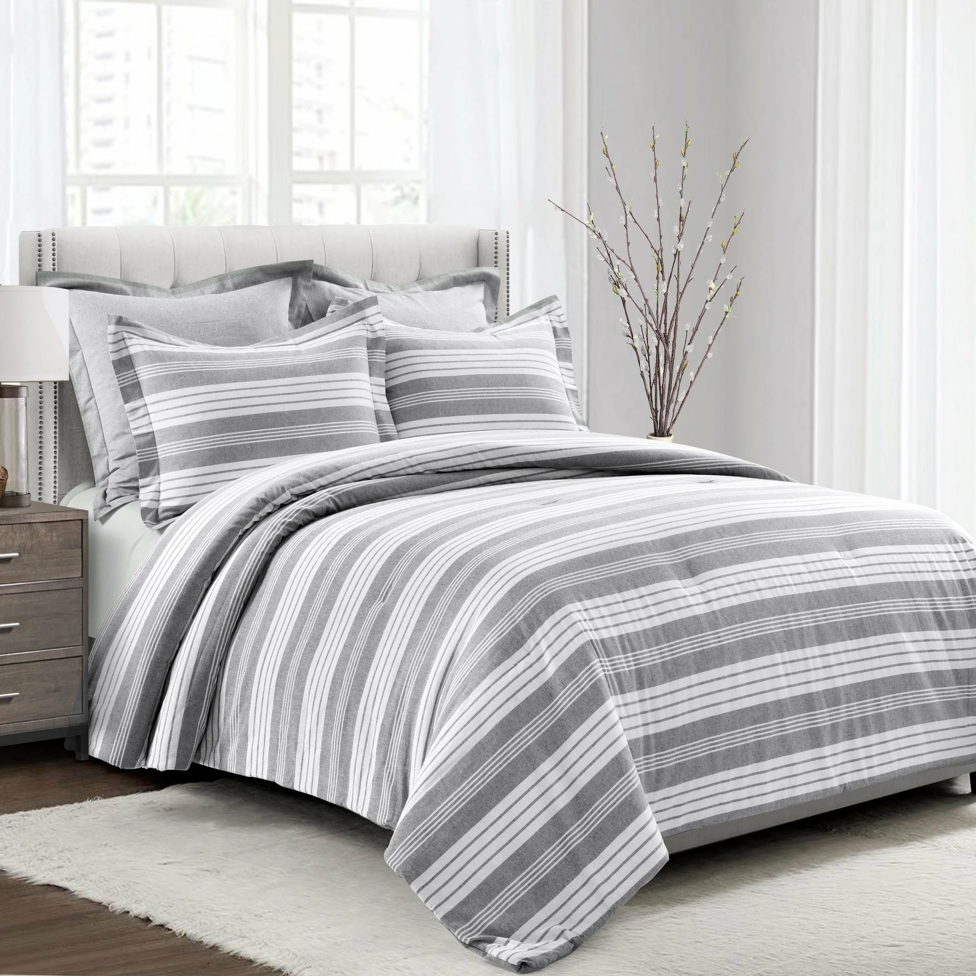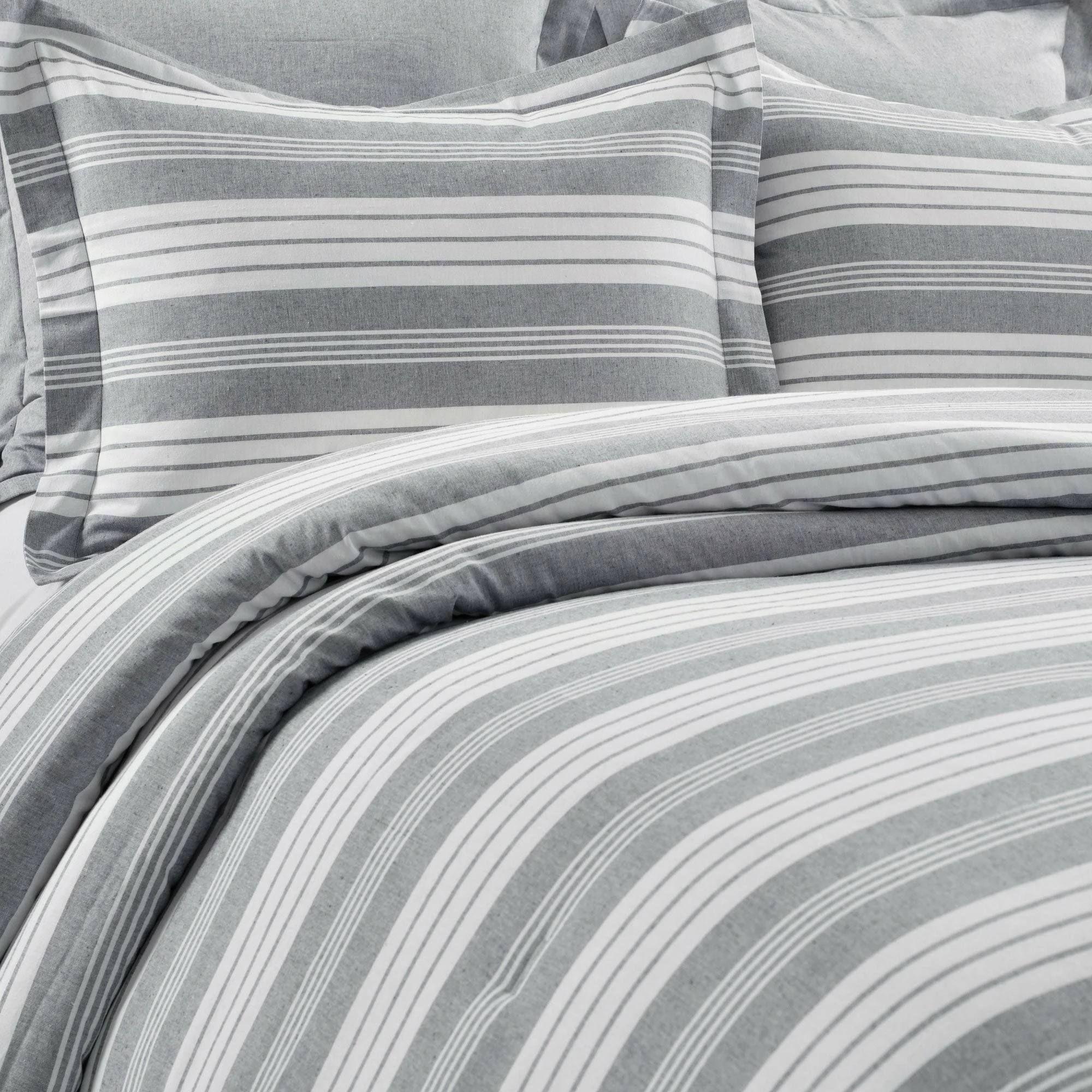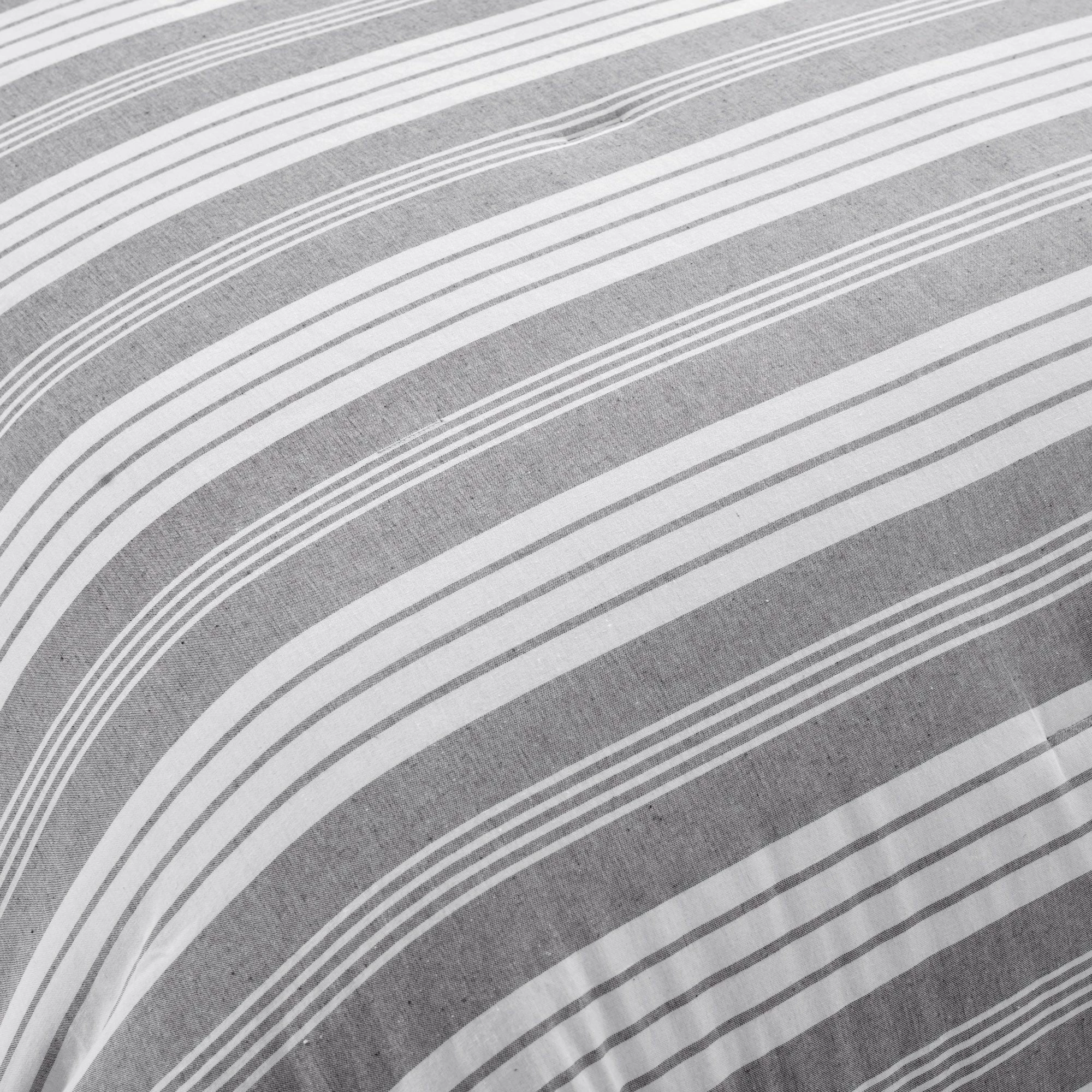 Redo the look of your tired guest room with this five-piece comforter set. Designed with grey and white stripes of varying widths, this bedding set brings a traditional look to any bedroom, and the colors meld with almost any color scheme. The bedding is made from 100-percent eco-friendly recycled cotton so you can feel good about lowering your carbon foot print while enjoying the long-lasting durability. This set includes two pillow shams and two Euro shams to create a finished look as soon as you open the package.