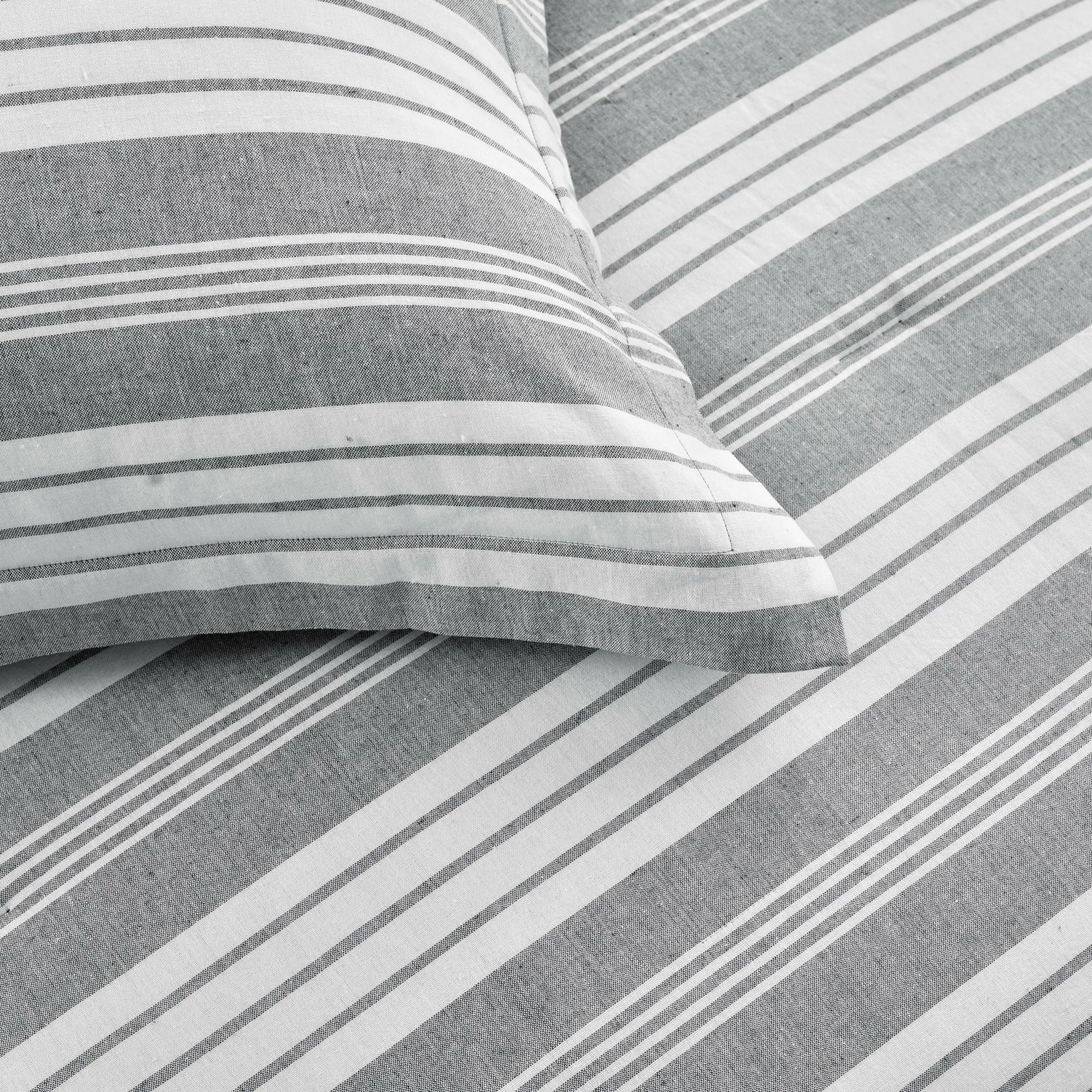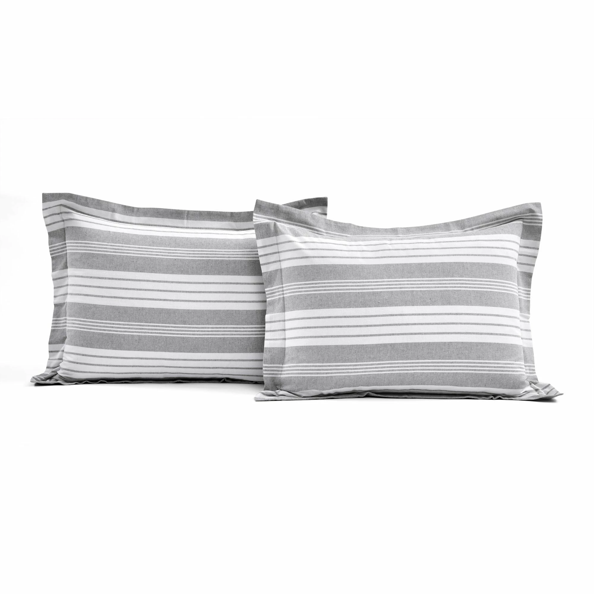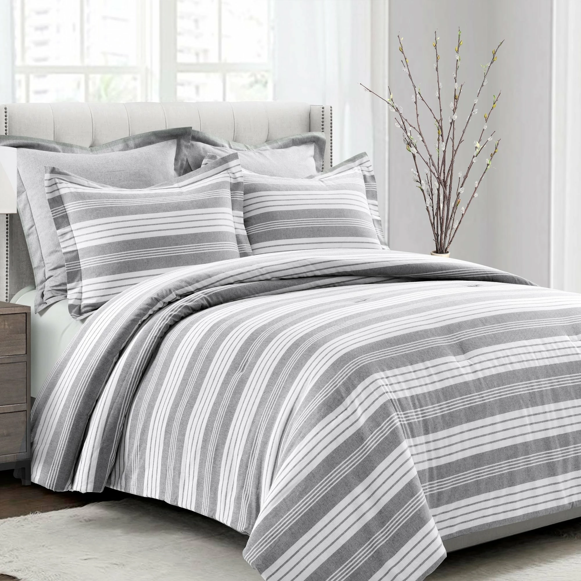 Redo the look of your tired guest room with this five-piece comforter set. Designed with grey and white stripes of varying widths, this bedding set brings a traditional look to any bedroom, and the colors meld with almost any color scheme. The bedding is made from 100-percent eco-friendly recycled cotton so you can feel good about lowering your carbon foot print while enjoying the long-lasting durability. This set includes two pillow shams and two Euro shams to create a finished look as soon as you open the package.