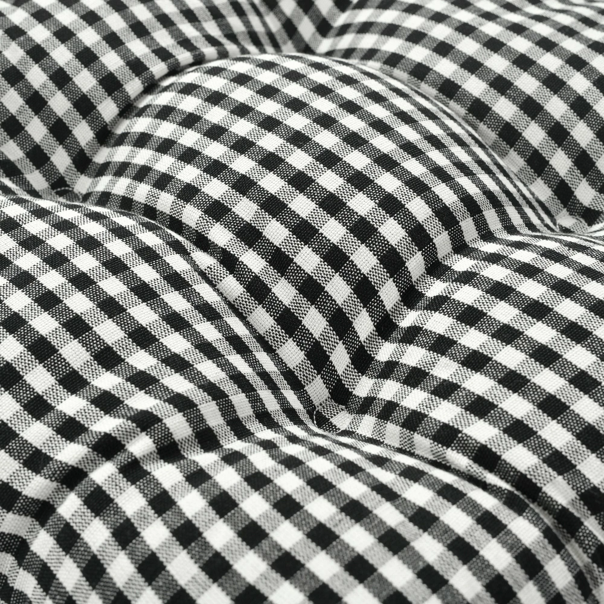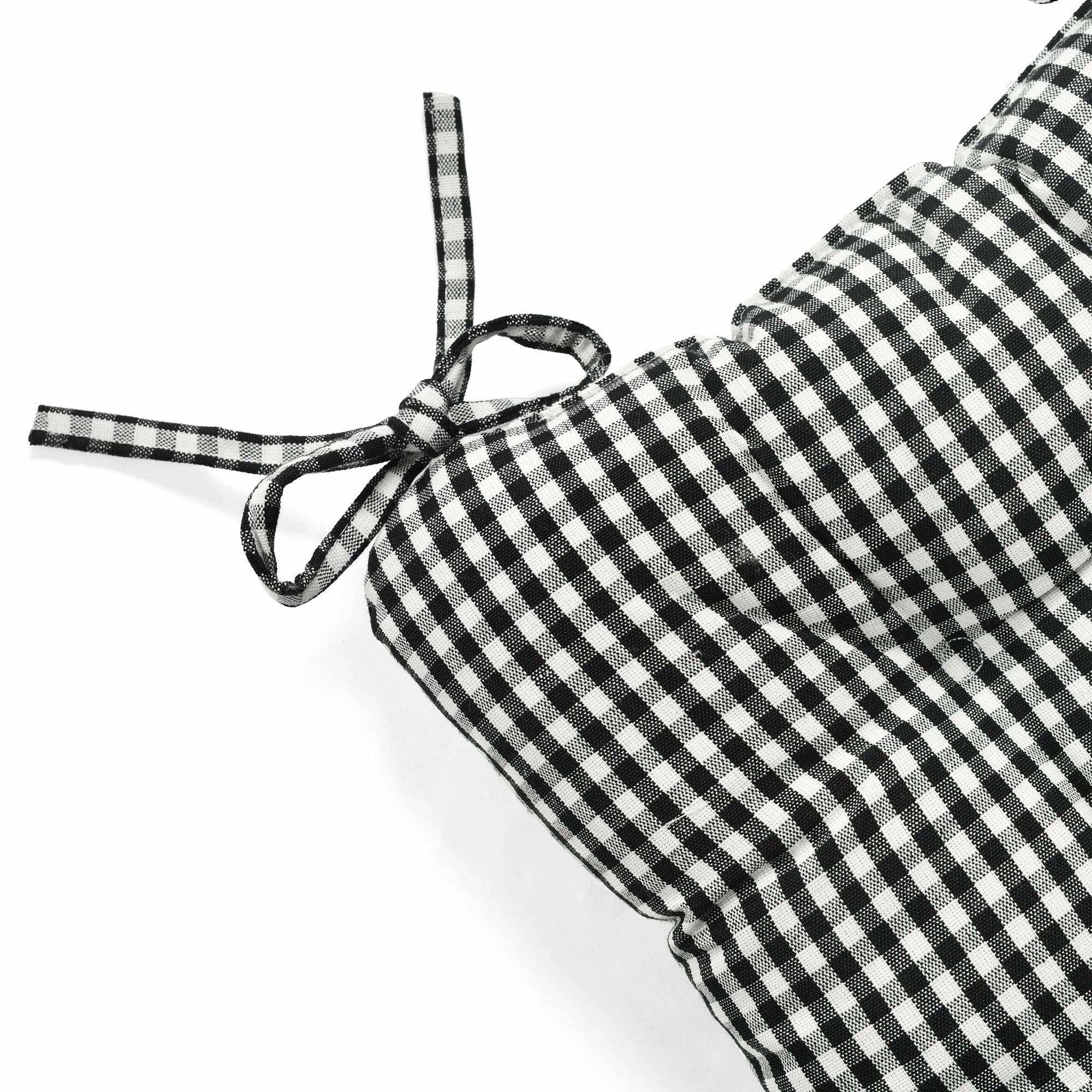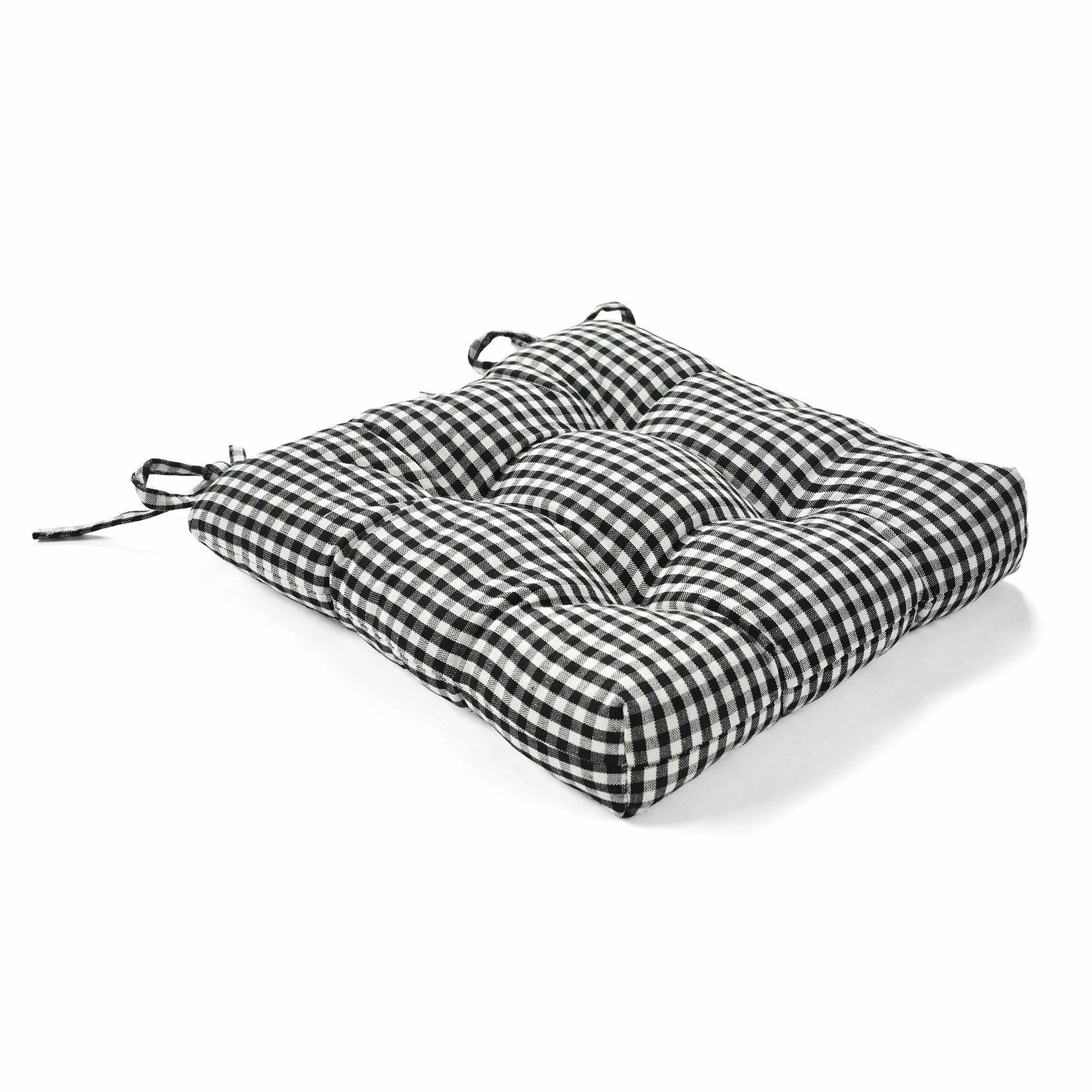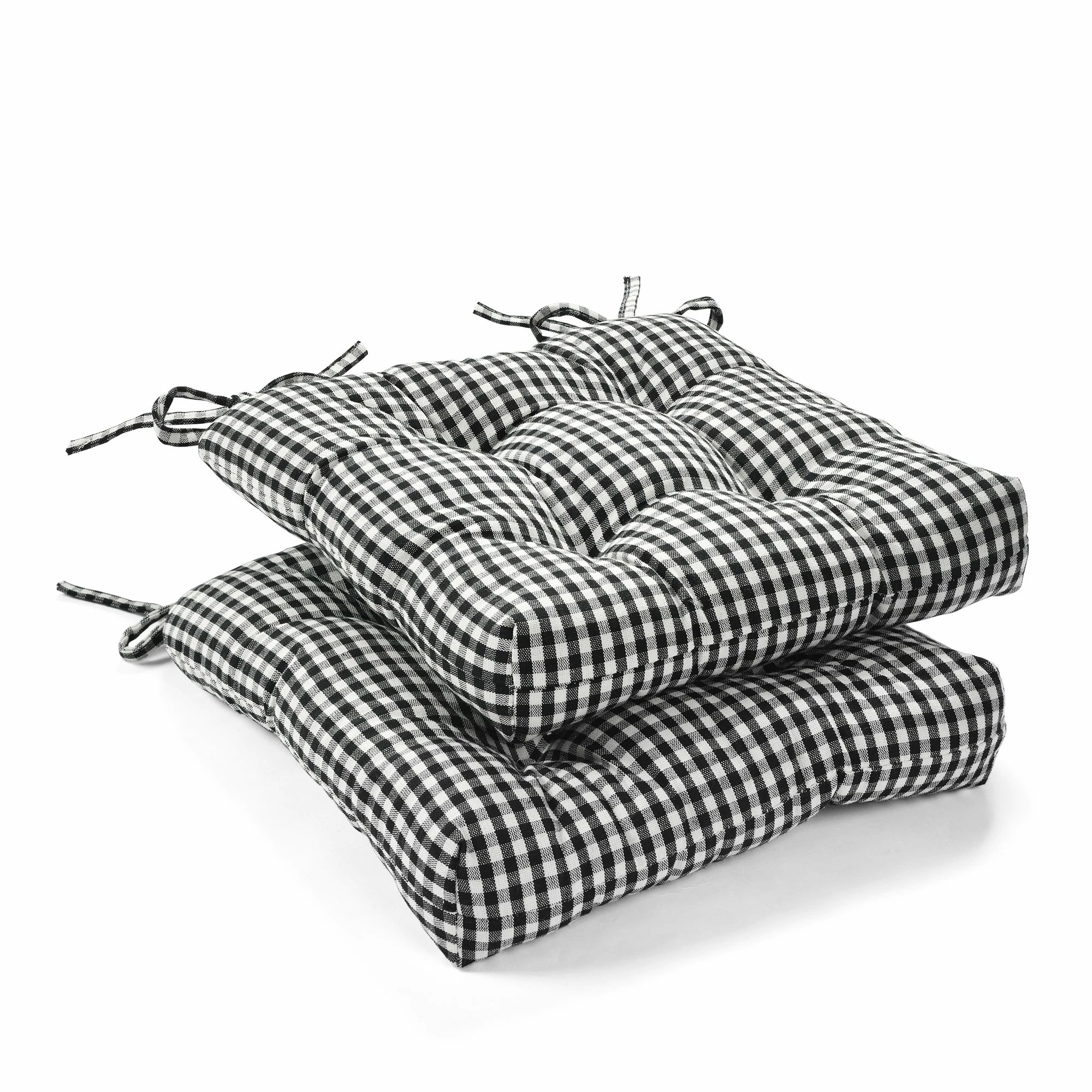 These chair pads add elevated style to your dining room or kitchen table chairs. The classic farmhouse pattern and comfy cushions beckon family and friends to sit and and stay a while. The black and off-white gingham checks can be a focal point or act as a neutral backdrop for the dining decor of your choice. These chair pads are sold in sets of two. Each cushion measures 14 inches by 13 inches and is 2.5 inches thick for extra comfort. Please refer to the care label for full instructions before cleaning.