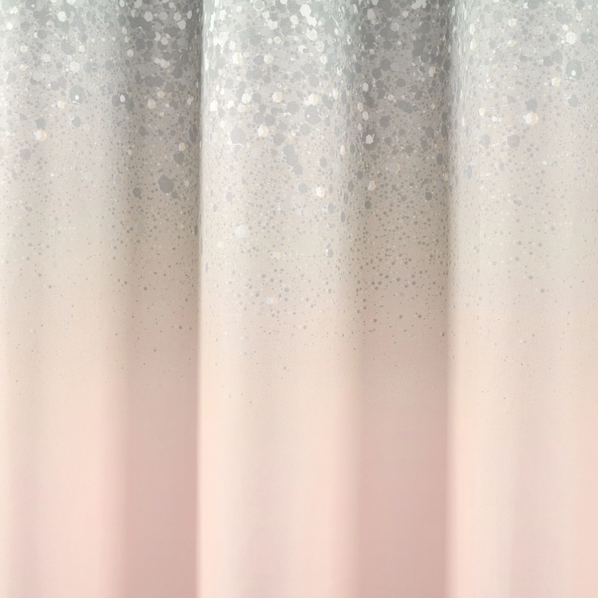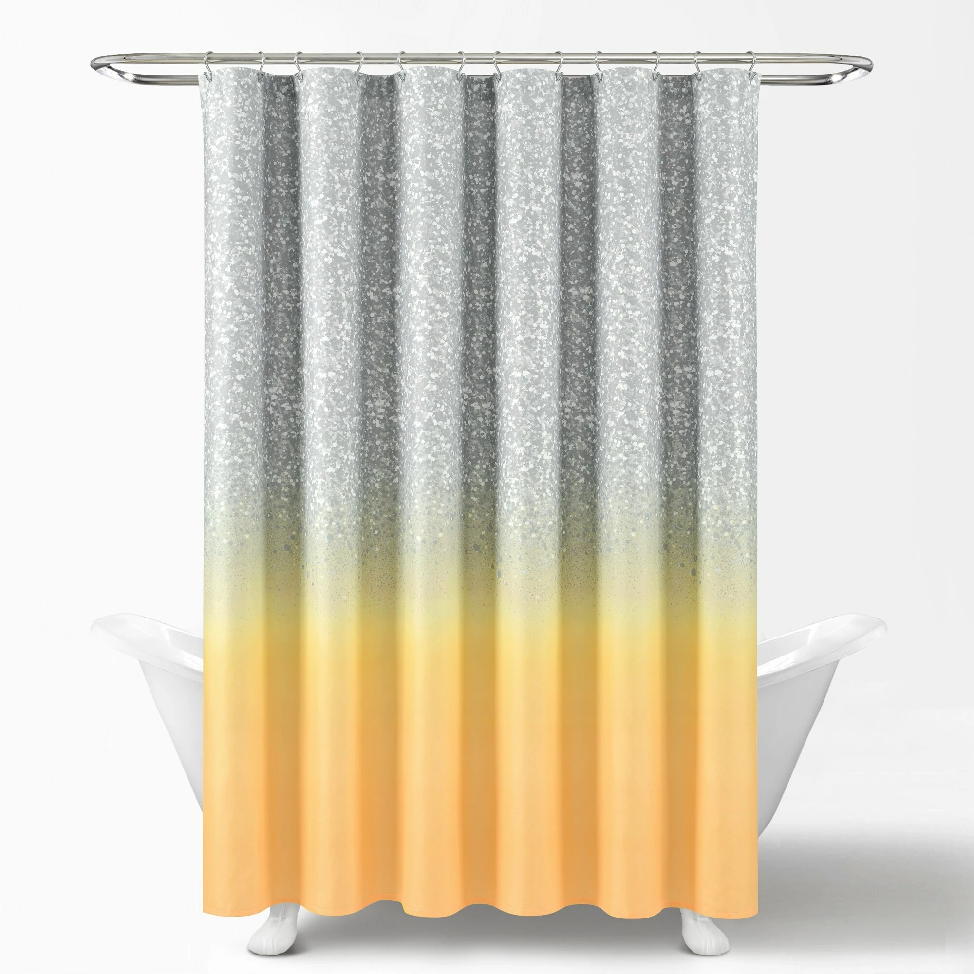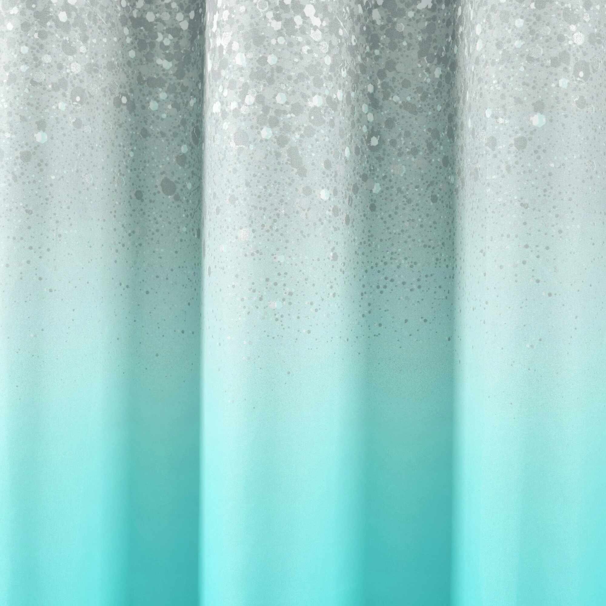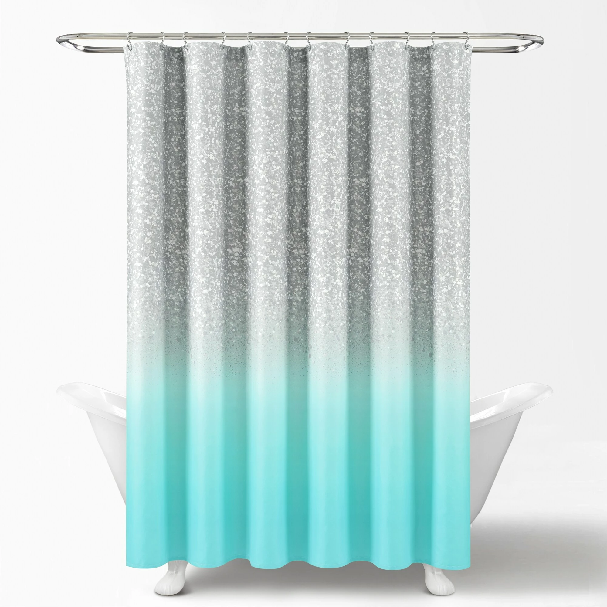 Glam up your bathroom with this sparkly shower curtain. This trendy curtain features an ombre style fade that blends together a silver printed glitter design into an eclectic color of you’re choice. This shower curtain would look great in your child’s bathroom for a fun piece of decor or your guest bathroom for you visitors to enjoy. Each side of this shower curtain measures 72 inches. This curtain is machine washable for your convenience. Please refer to label for care instructions.