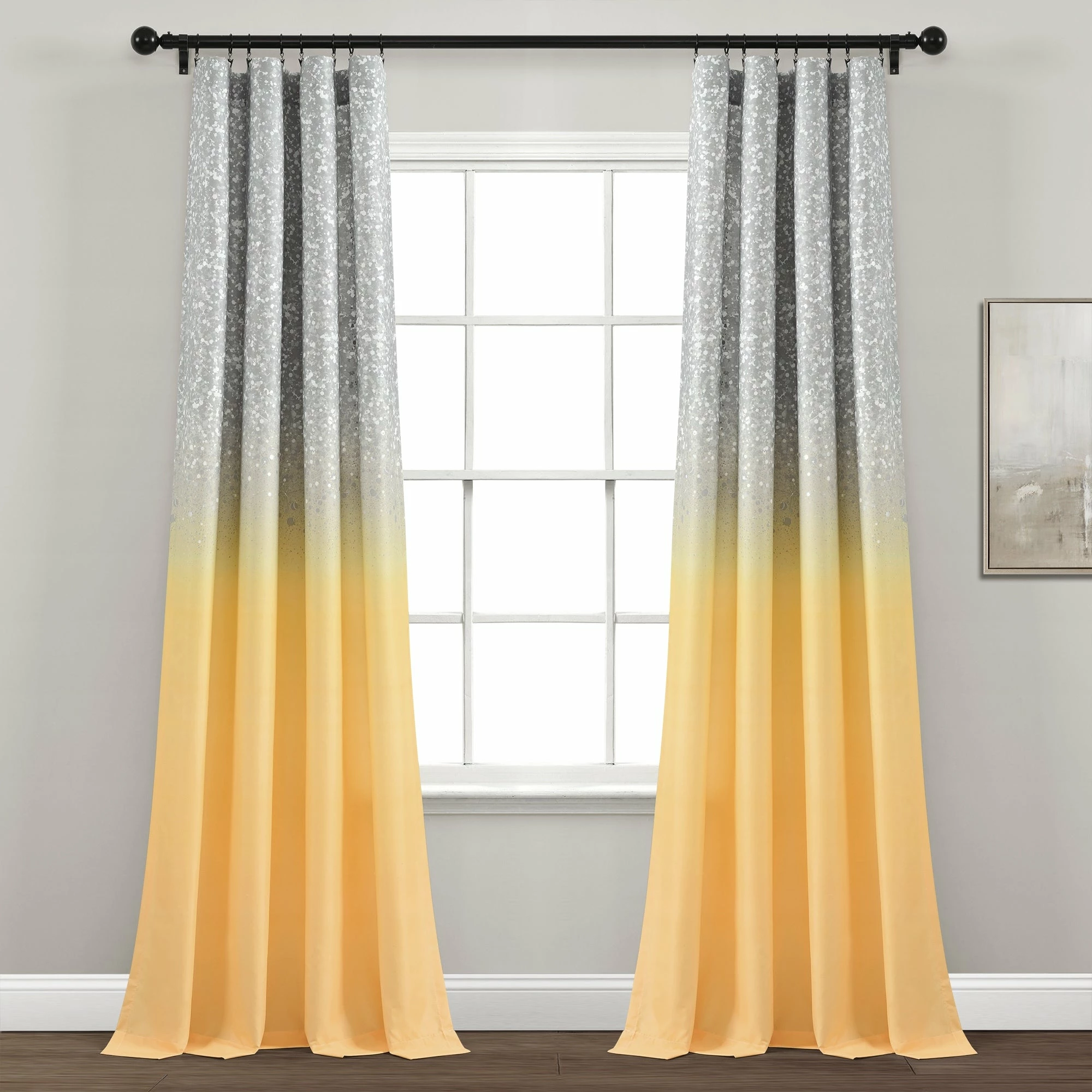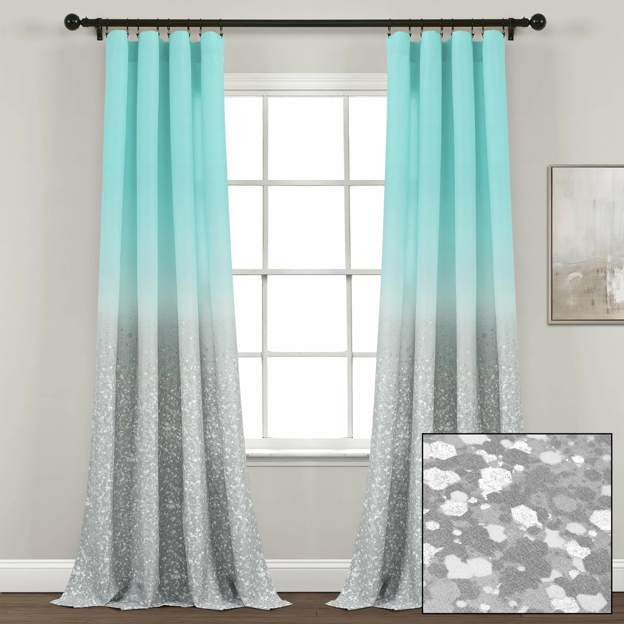 Bring a fun element into your home with these sparkly window curtains. The glitter begins at the top of the curtain and ombres down into an eclectic color of your choice. The glitter is printed on the fabric giving a perfectly even look. These curtains would look great in your child’s bedroom for a glamorous touch. Each panel measures 52 inches across and hangs 84 inches down, they are sold by the pair. Easily hang these panels by sliding a curtain rod through the rod pocket. This curtain set is machine washable for your convenience. Please refer to label for full care instructions.