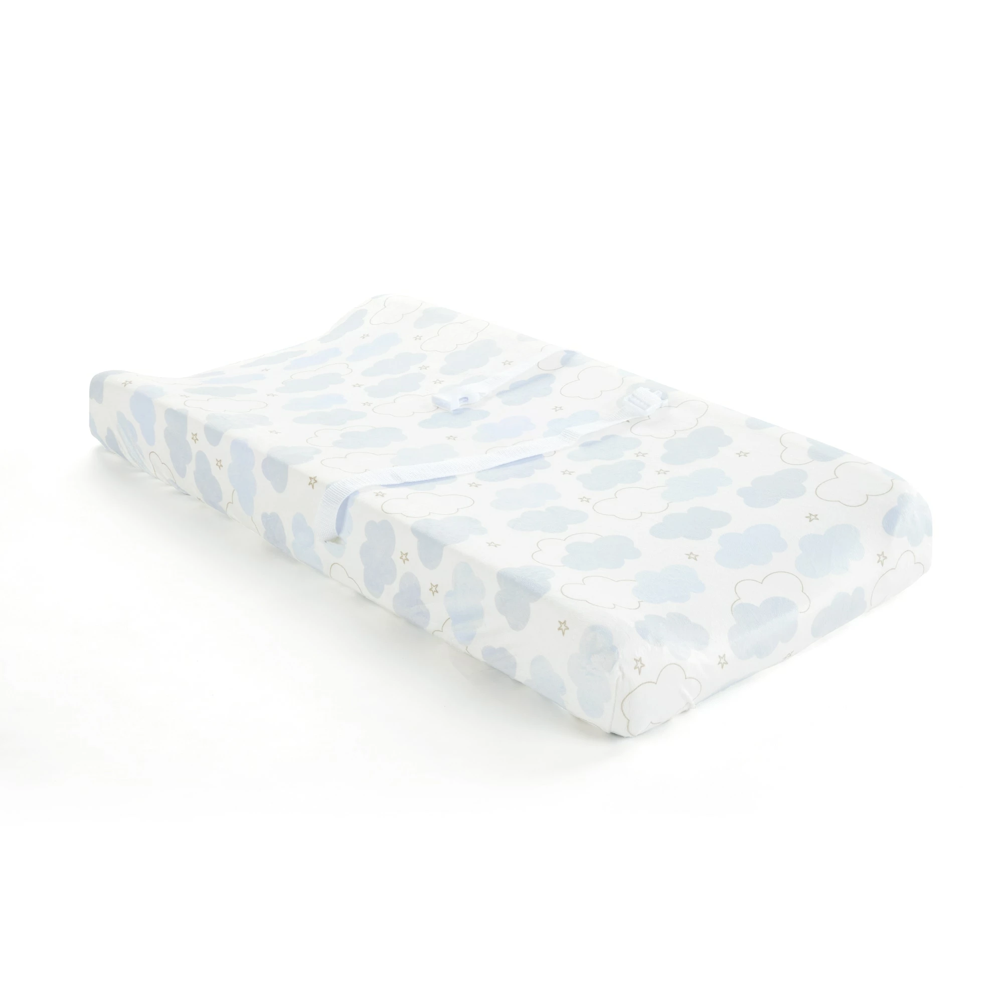 The night sky is a delightful decorative addition to your nursery. The calming colors and peaceful pattern emphasize a serene space for your babyβs rest. This changing pad cover was designed with your little one in mind. Soft plush fabric is combined with adorable printed drawings that fit well with numerous nursery themes. Complete your nighttime nursery design with the coordinating collection set. On each side of the cover is a buttonhole for the changing pad straps. This cover measures 16 inches by 32 inches with a 5-inch pocket. Please refer to the product label for full care instructions.