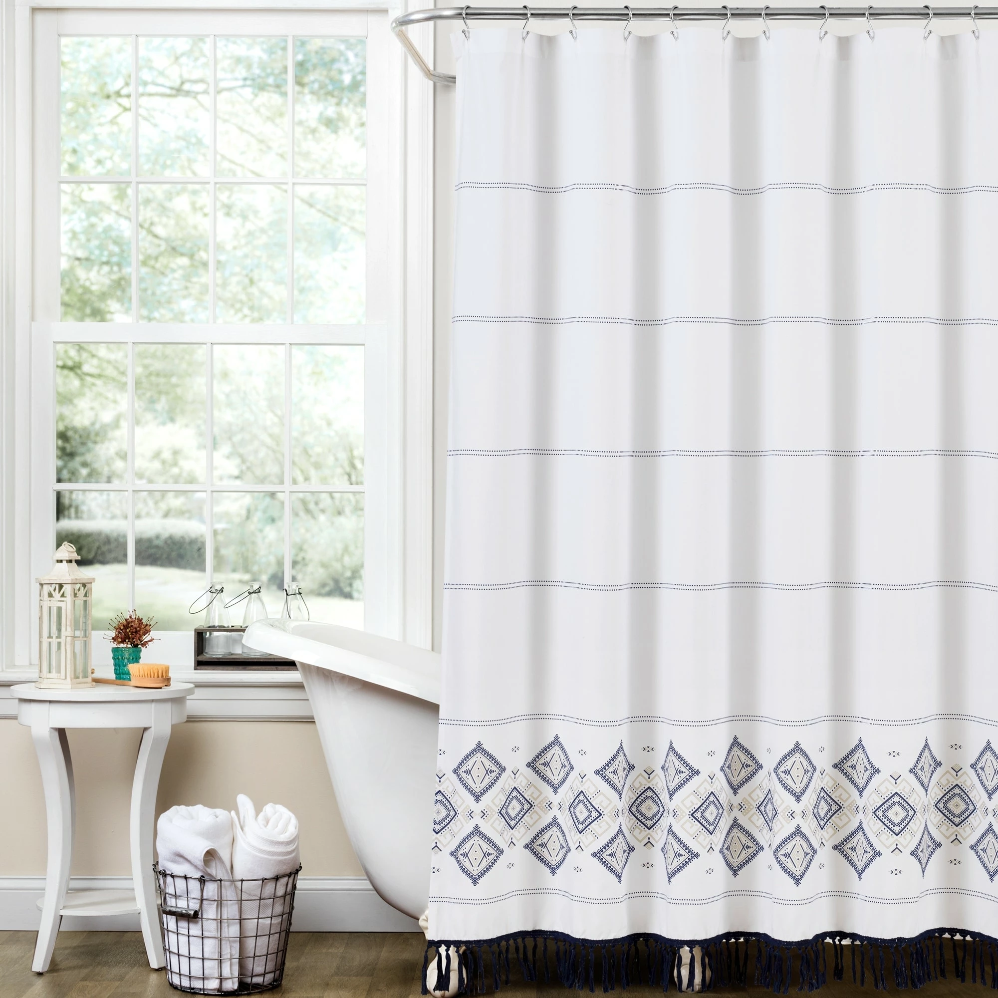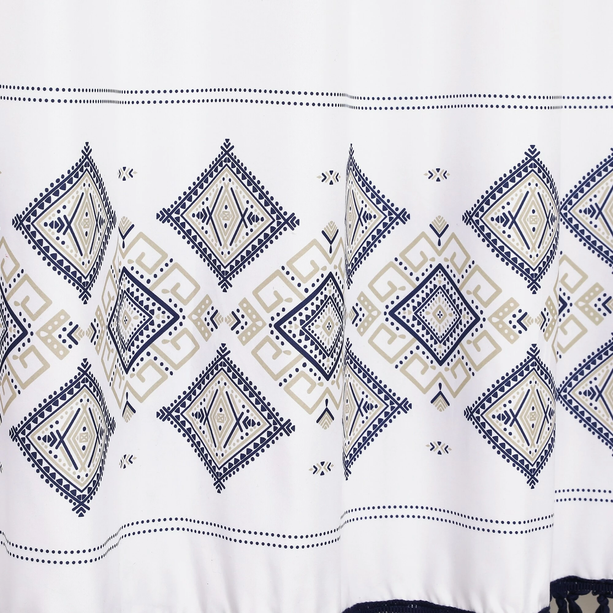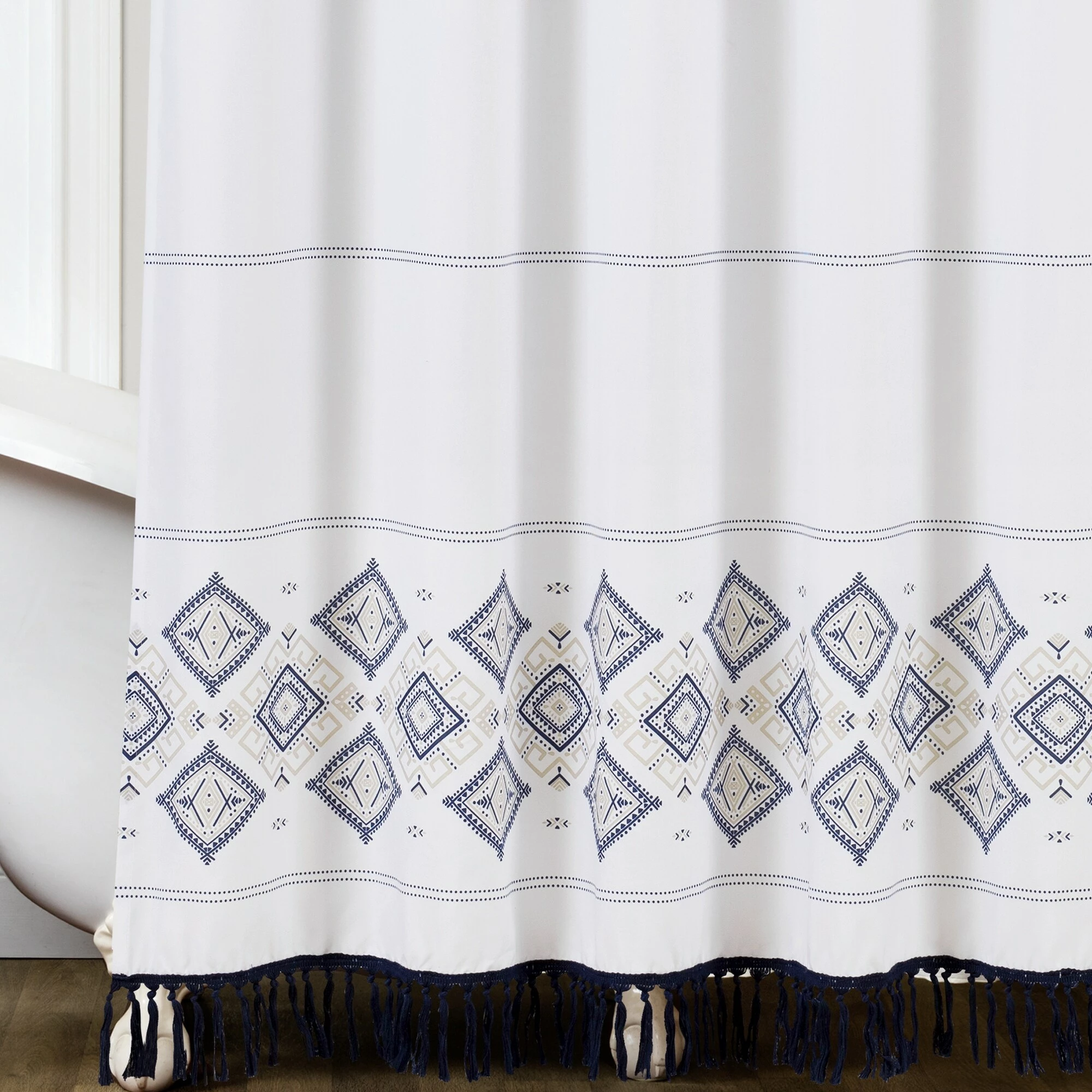 Stylize your bathroom with this unique shower curtain. The pattern at the bottom features an Aztec inspired design that creates the perfect calming vibe for your bathroom decor. Fringe detailing hangs from the bottom for added style.
