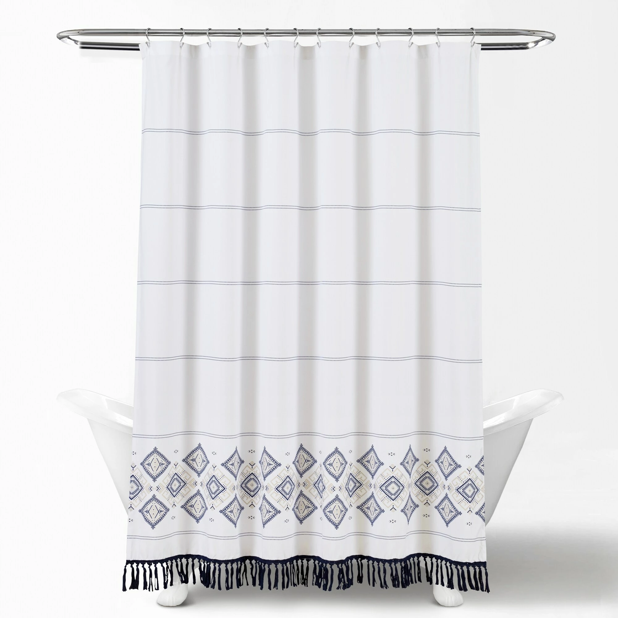 Create the perfect space in your bathroom with this calming shower curtain. The design at the bottom is inspired by Aztec art and displays unique shapes and intricate images. The hanging fringe at the bottom adds to the Aztec inspiration and provides extra dimension to the shower curtain style. This curtain measures 72 inches on each side and should fit most standard bathtubs. Please refer to label for full care instructions.