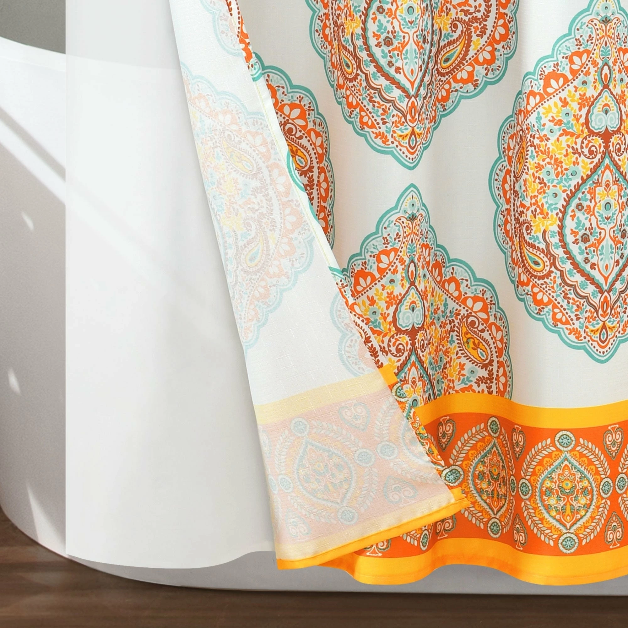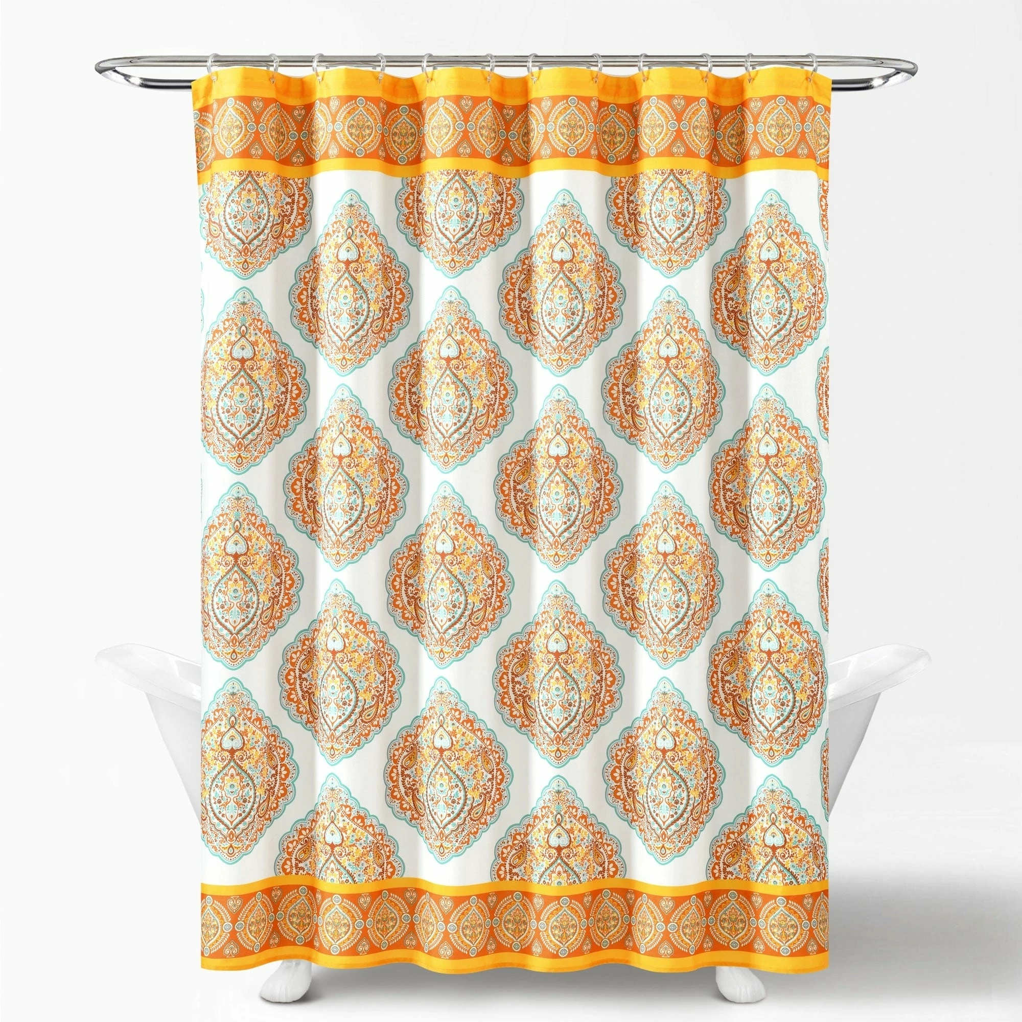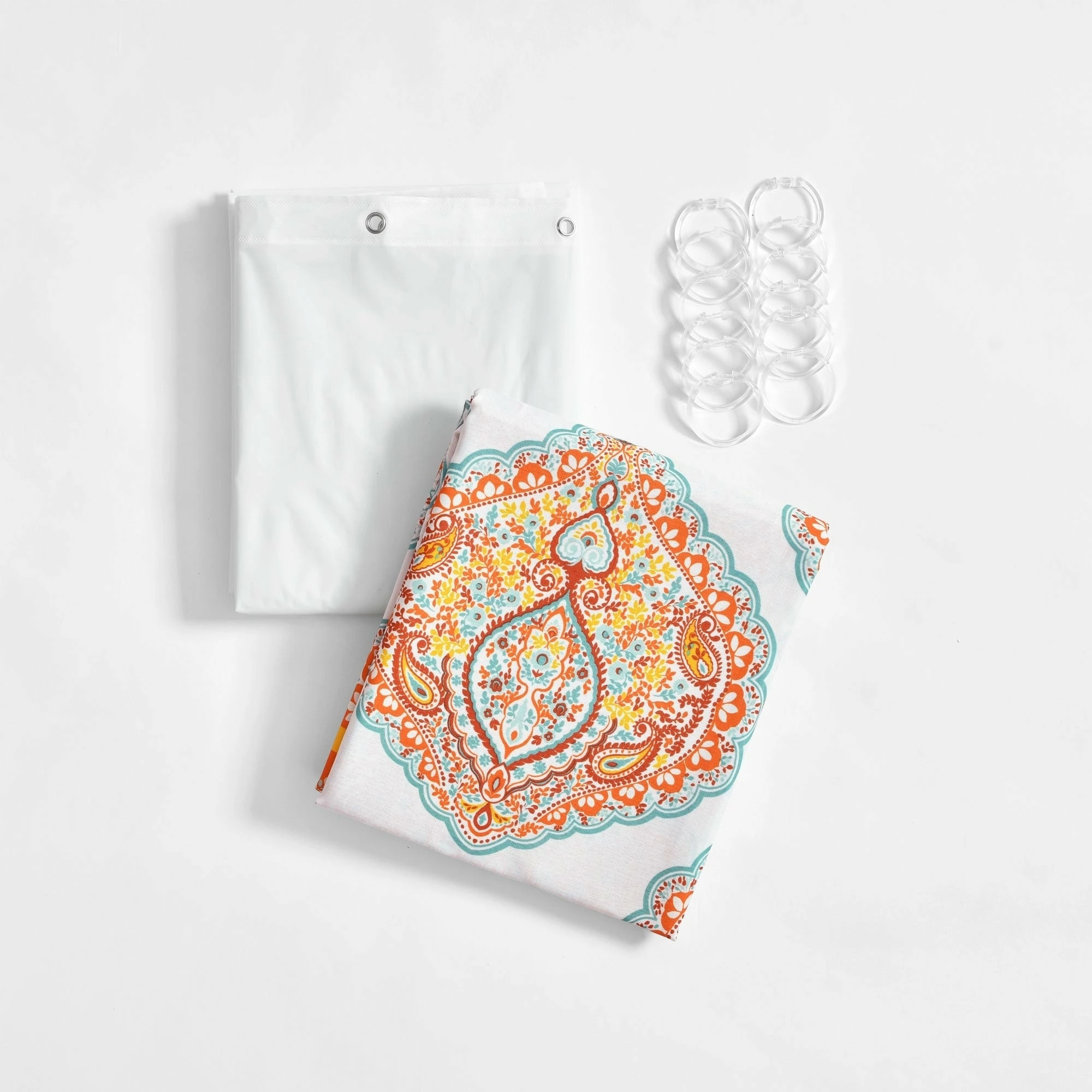 Enhance your master or guest bathroom with this uniquely styled 14-piece complete shower curtain set. It’s like adding another window to your bathroom! The bold damask pattern is sure to make a statement in your space. This set includes liner and rings.