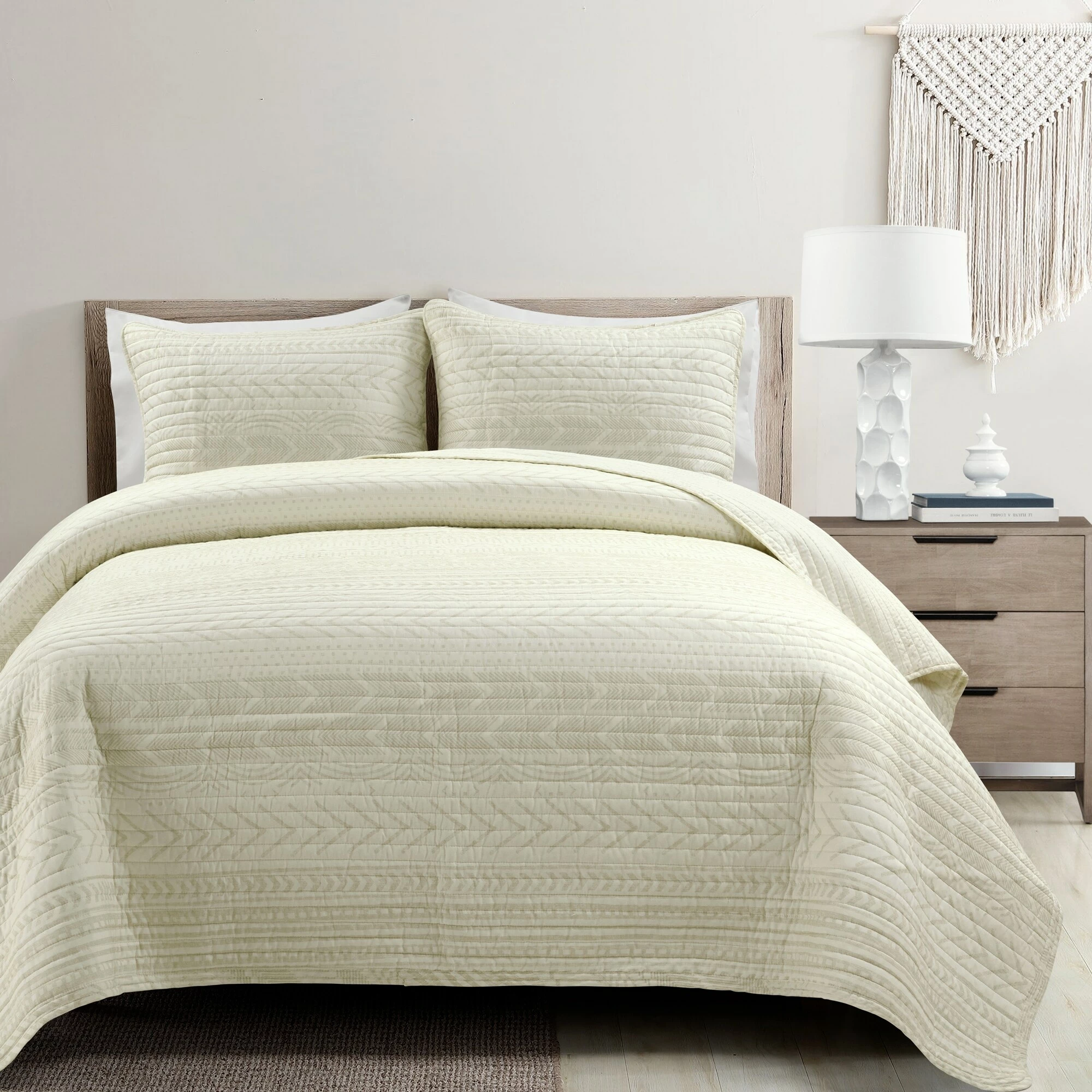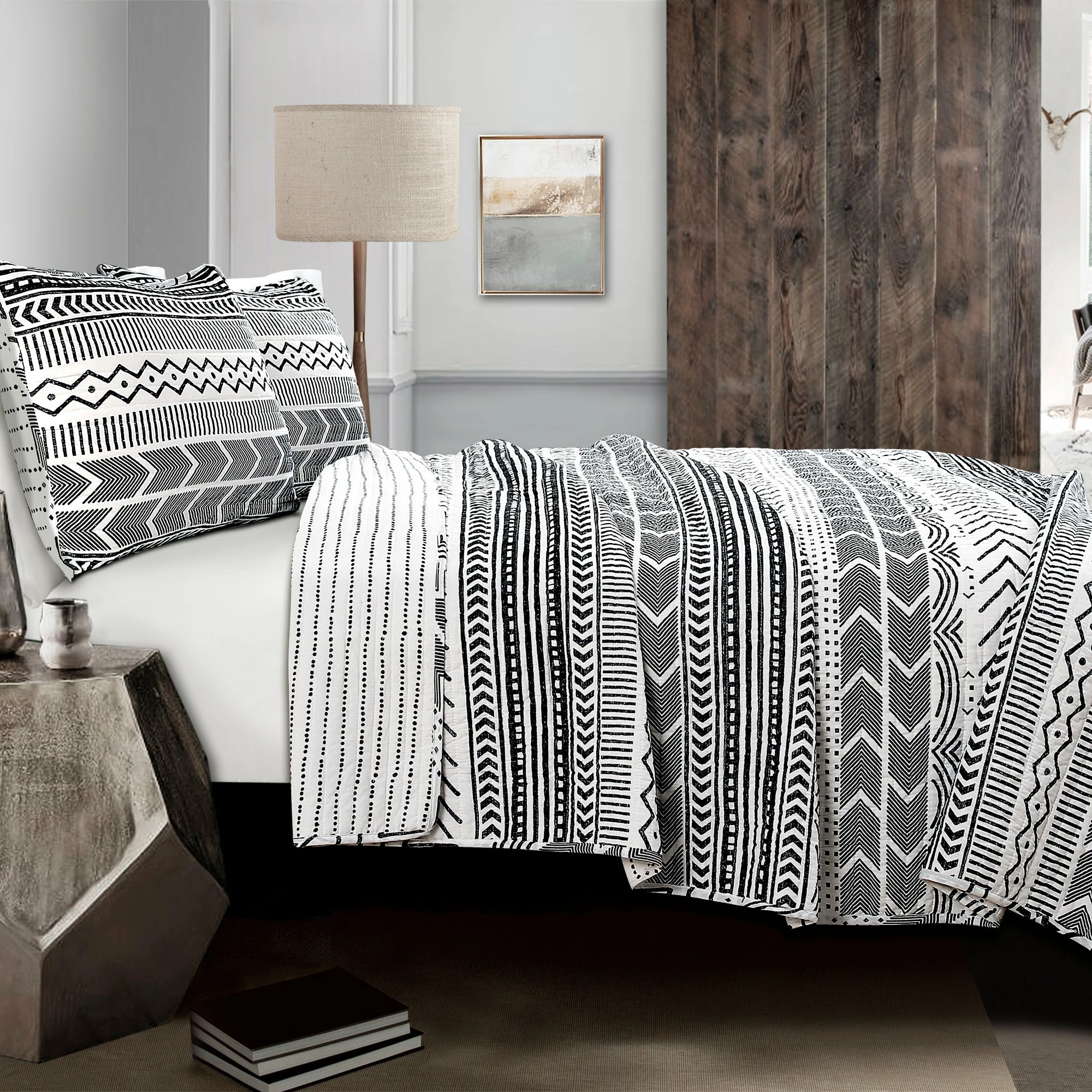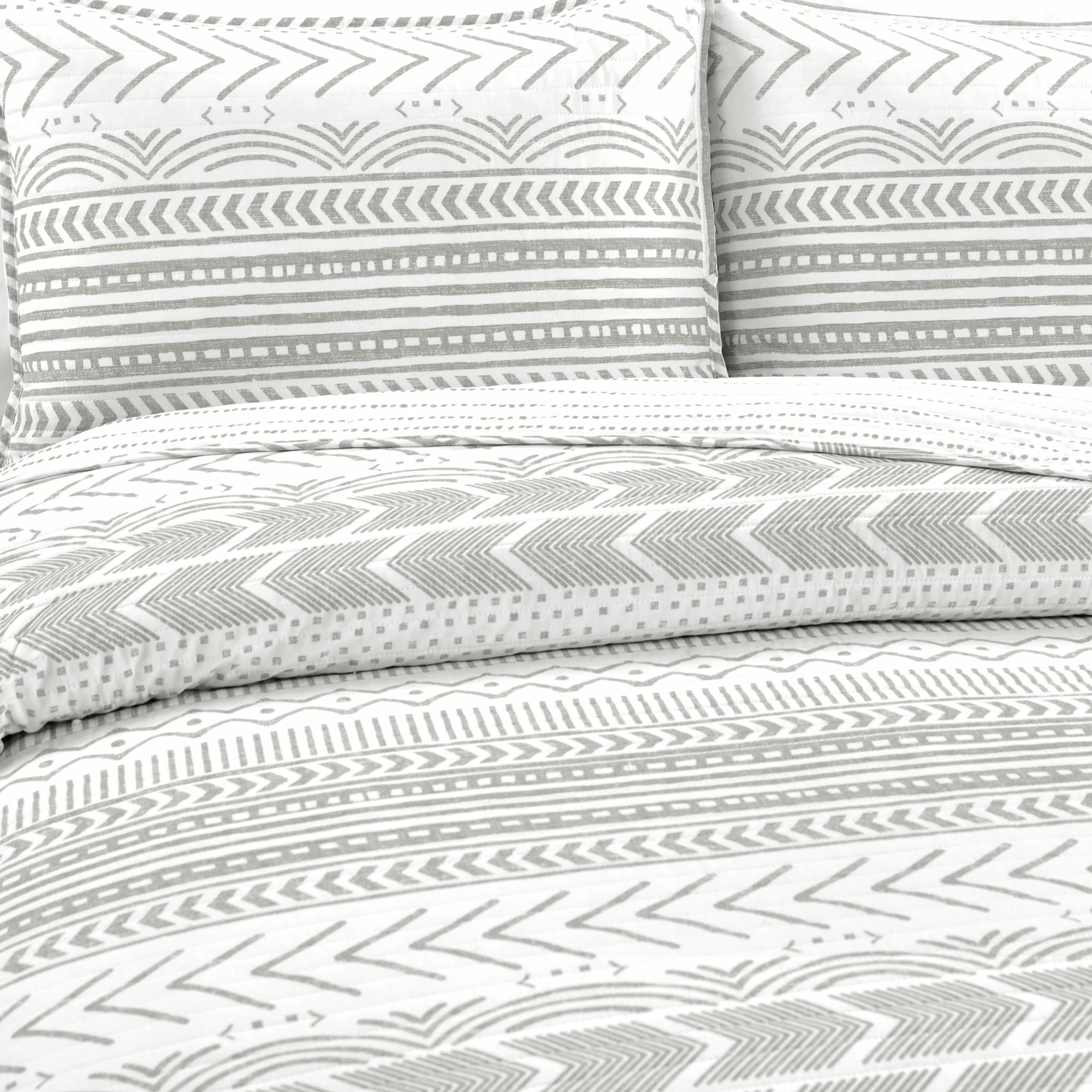 Customize your contemporary bedroom with the Hygge three-piece quilt set from Lush Decor. The cozy cotton set features stripes of varied geometric designs, and it is reversible to an alternate look. Choose from two sizes and various color combinations to match your existing decor.