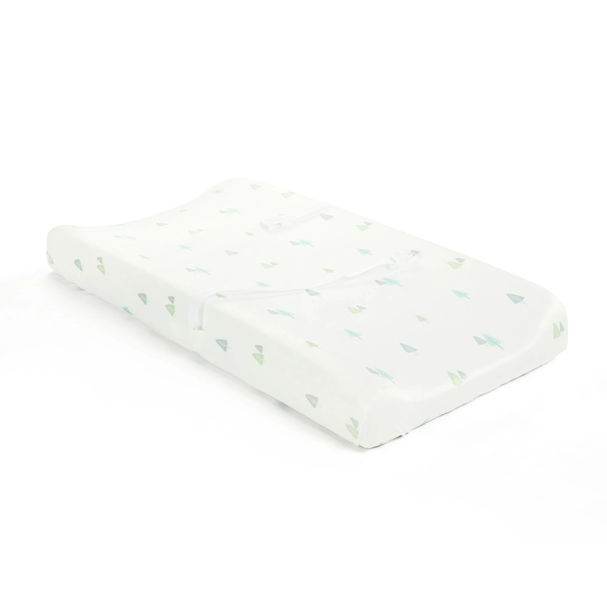 The rain forest is a delightful decorative addition to your nursery. The calming color shades and sweet pattern create a serene space. This changing pad cover was made with your little one in mind. It was designed with soft plush fabric with printed adorable drawings that fit well with numerous nursery themes. Complete your hygge nursery design with the coordinating collection set. On each side of the cover is a buttonhole for the changing pad straps. This cover measures 16 inches by 32 inches with a 5-inch pocket. Please refer to label for full care instructions.