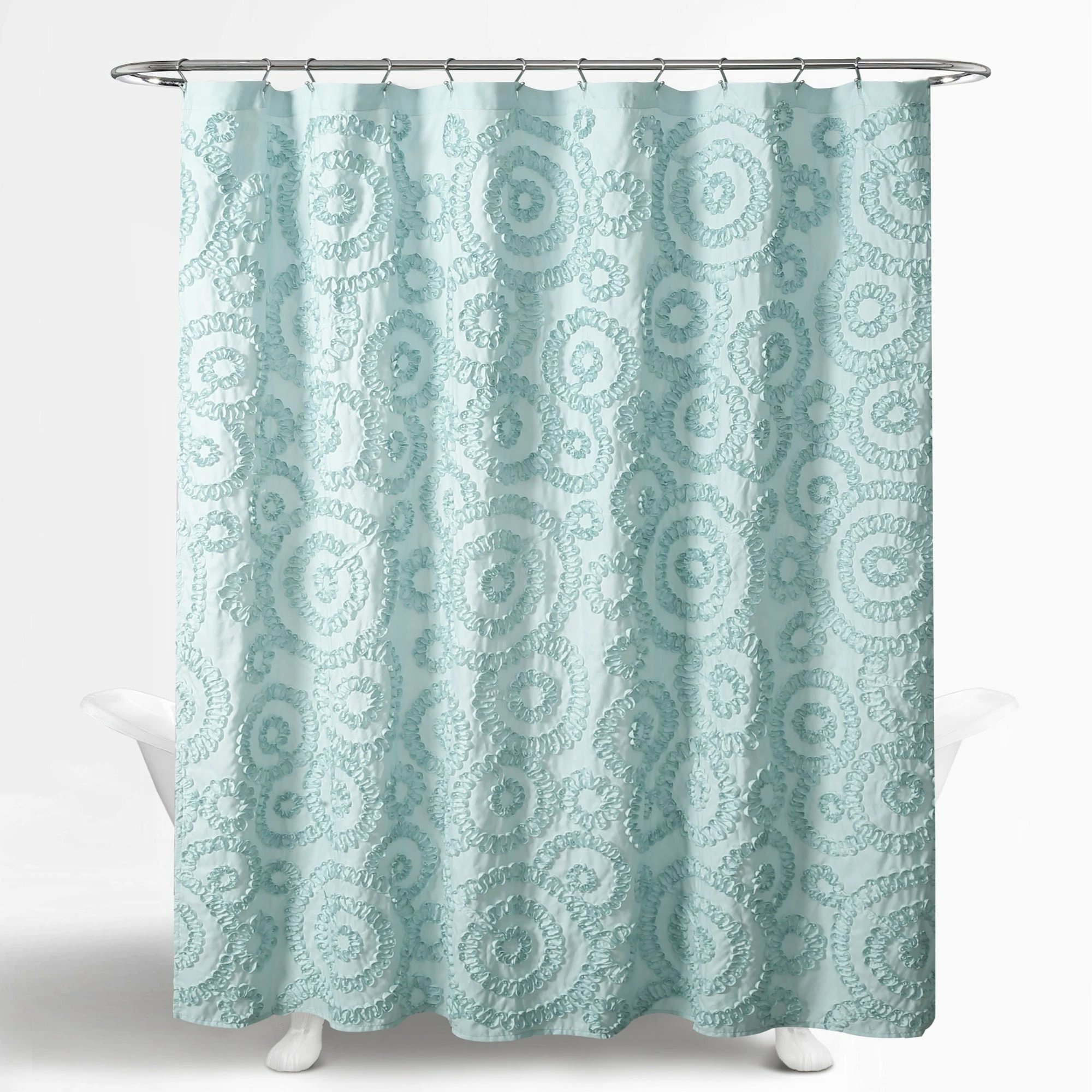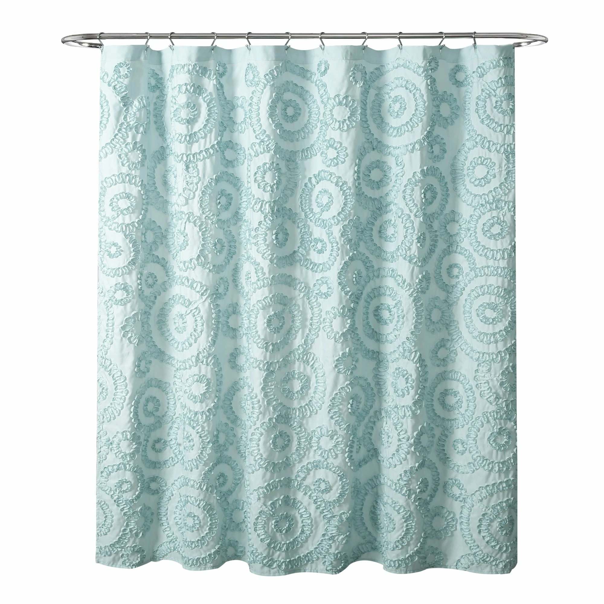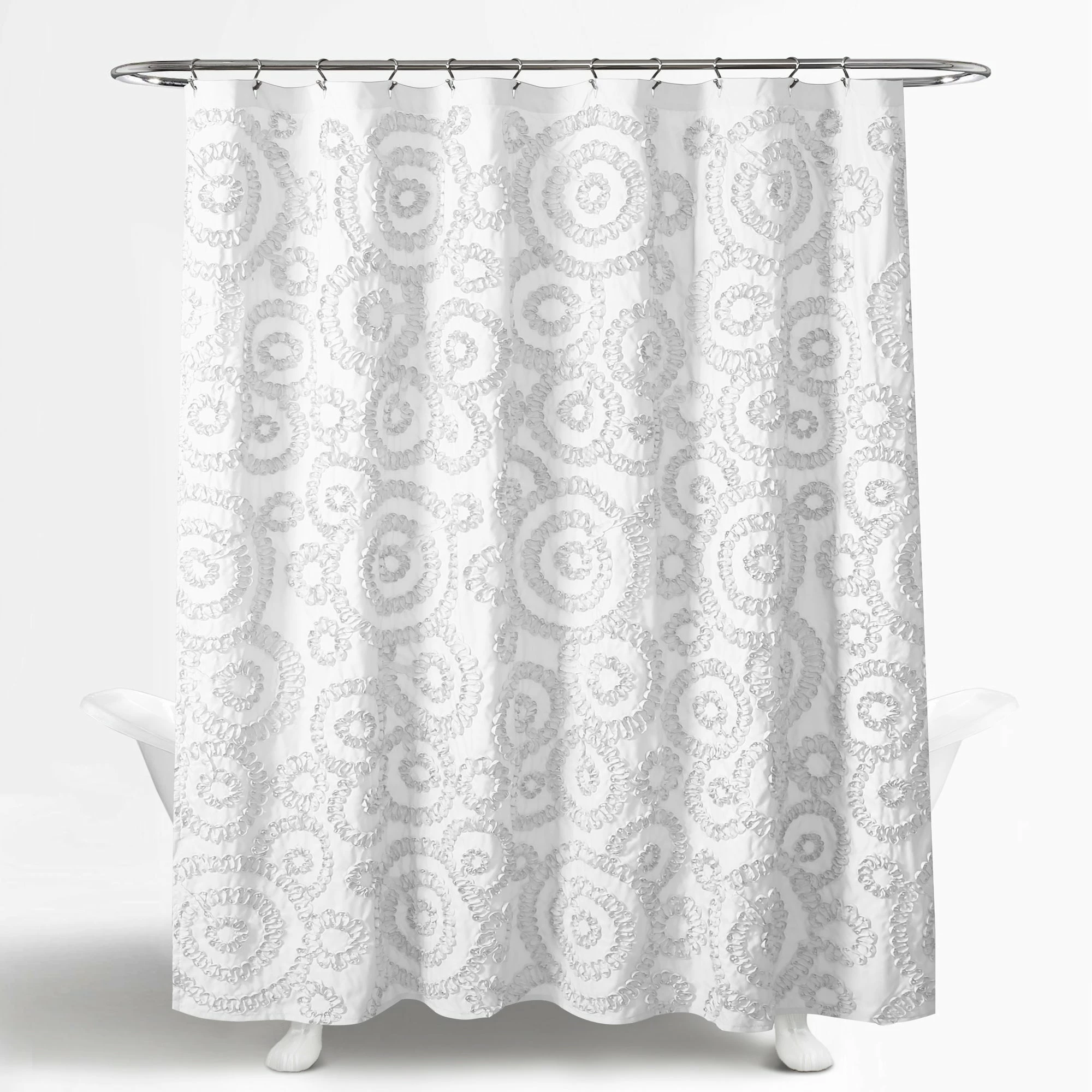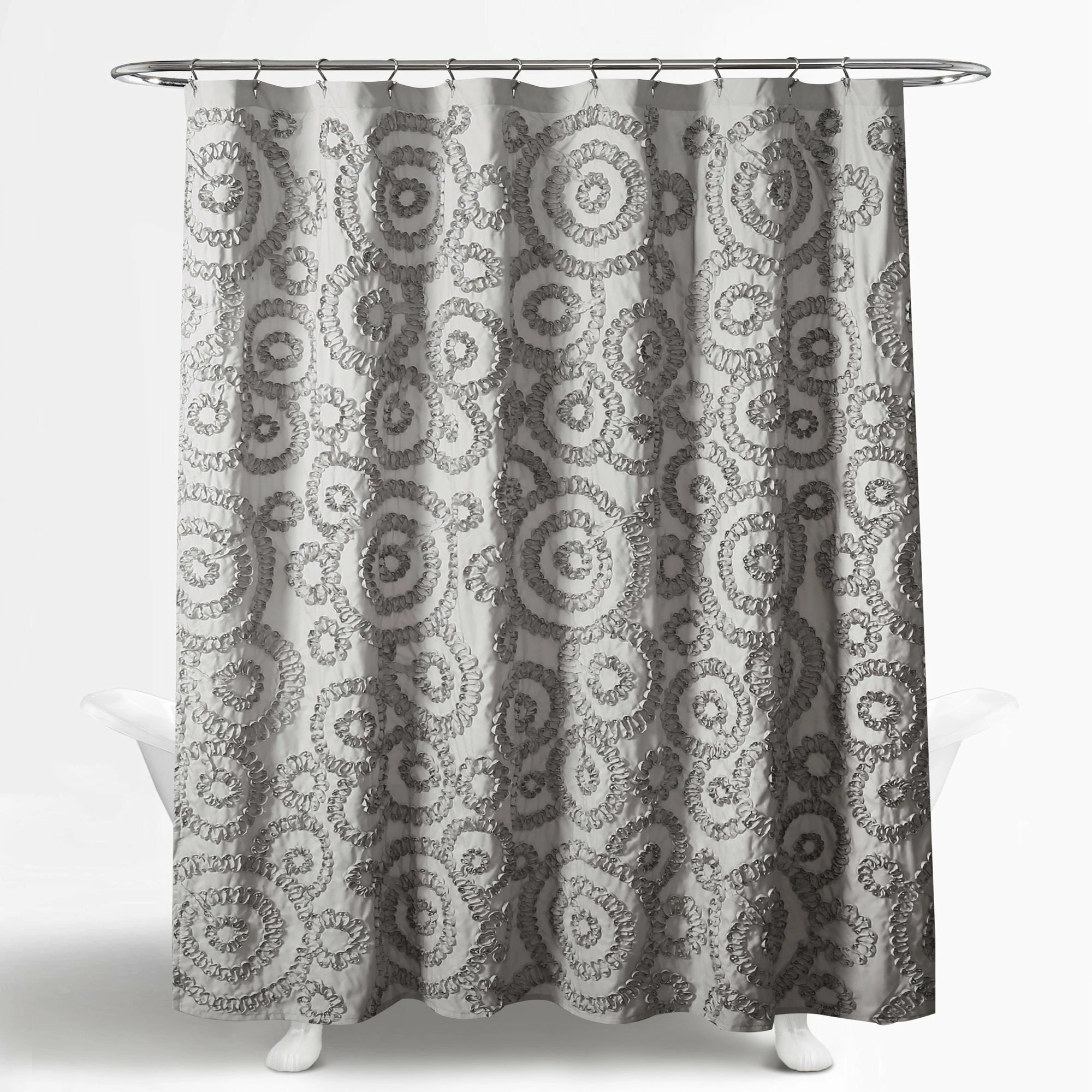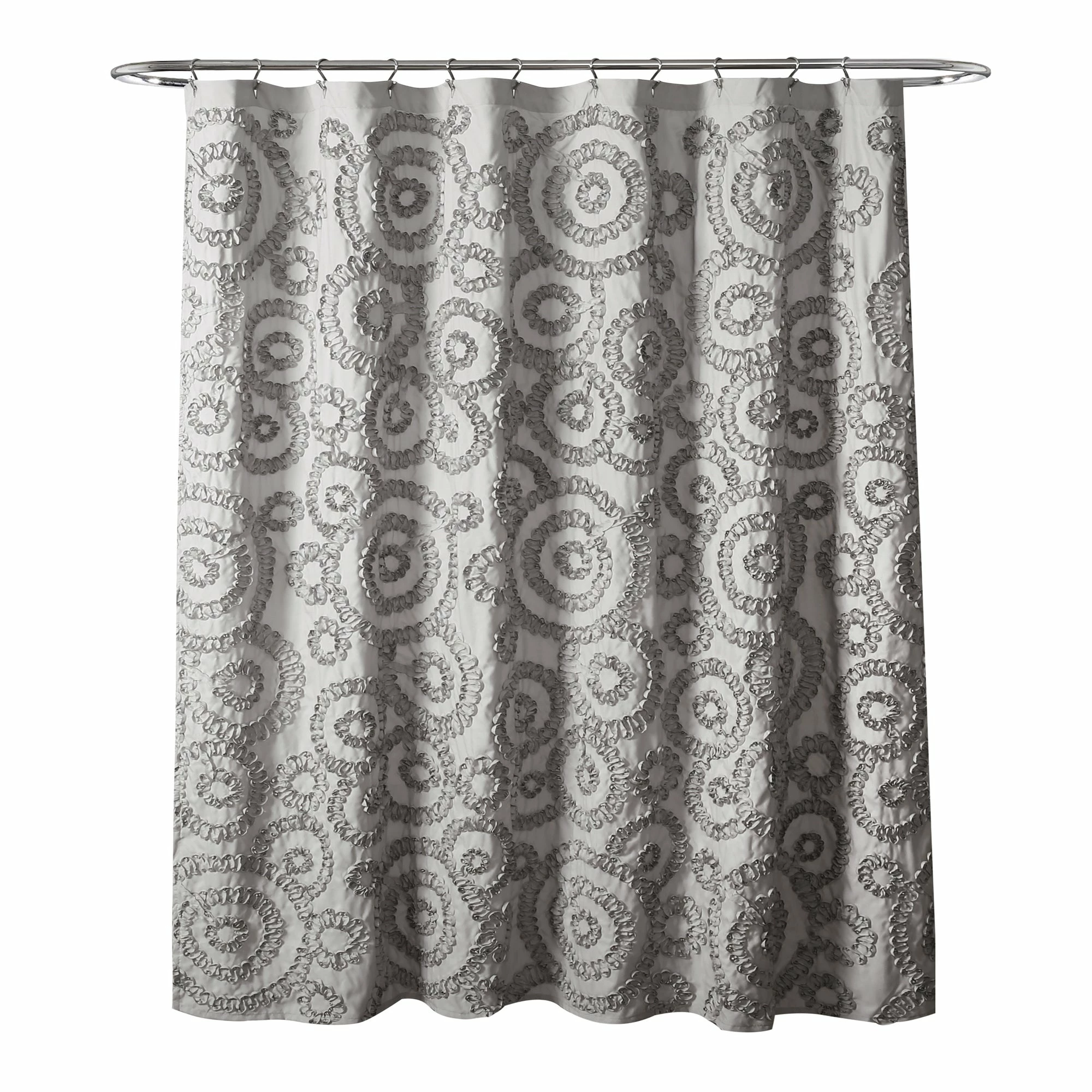 Adding dimension to your space makes it more comfortable and livable. With this ribbon embroidered shower curtain, your bathroom design will instantly become more inviting and stylish. The fun swirl pattern makes this curtain perfect for a guest, master or even kid’s bathroom. The style of this decorative piece brings a cheery look without grabbing too much attention. Please refer to label for full care instructions.