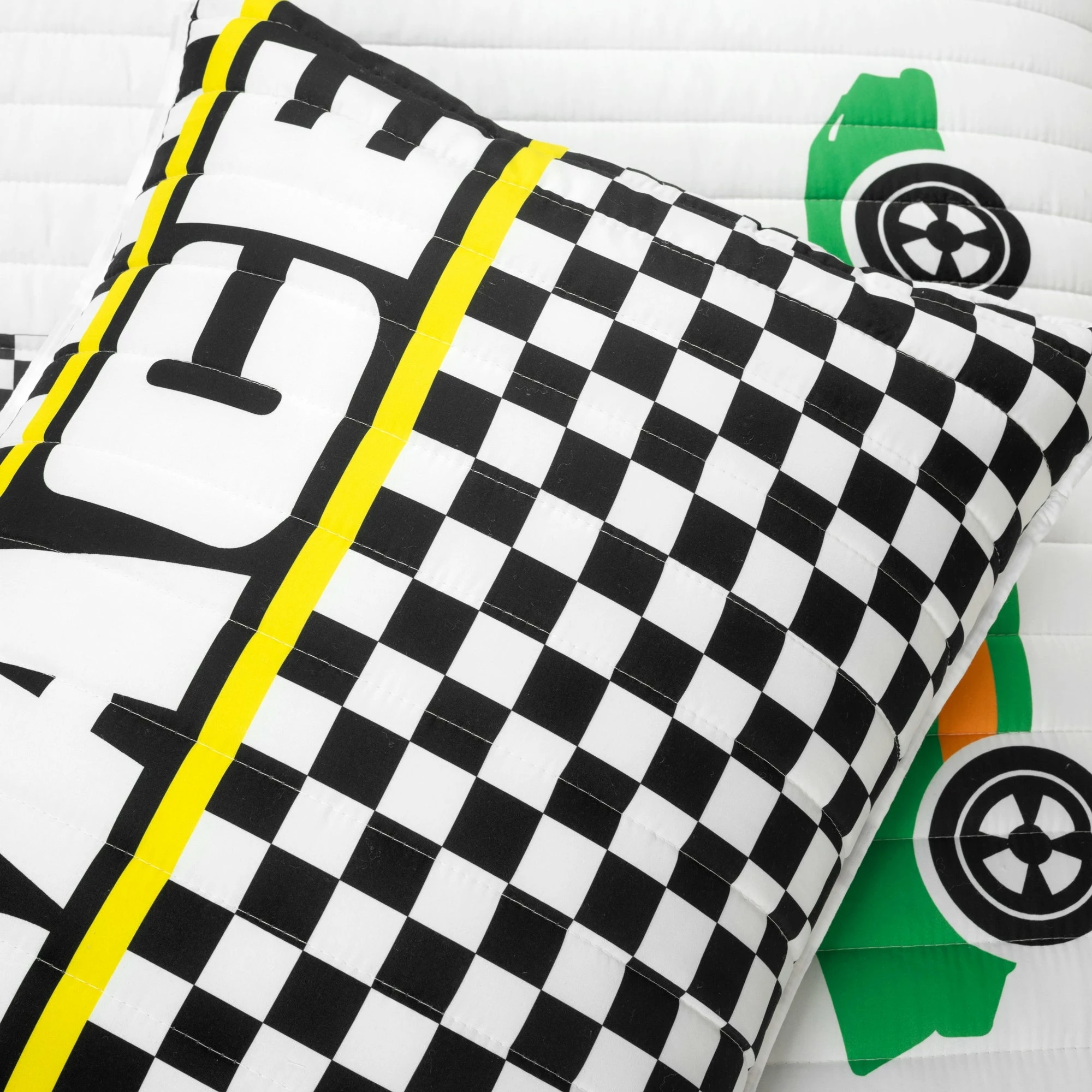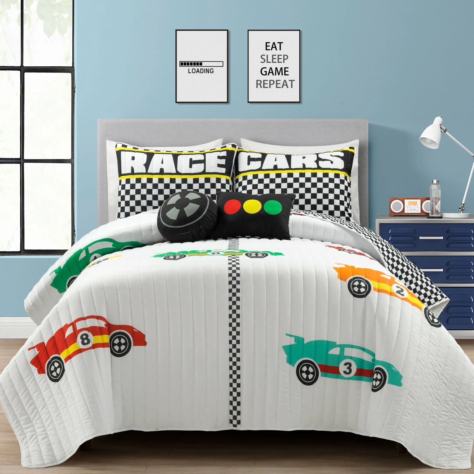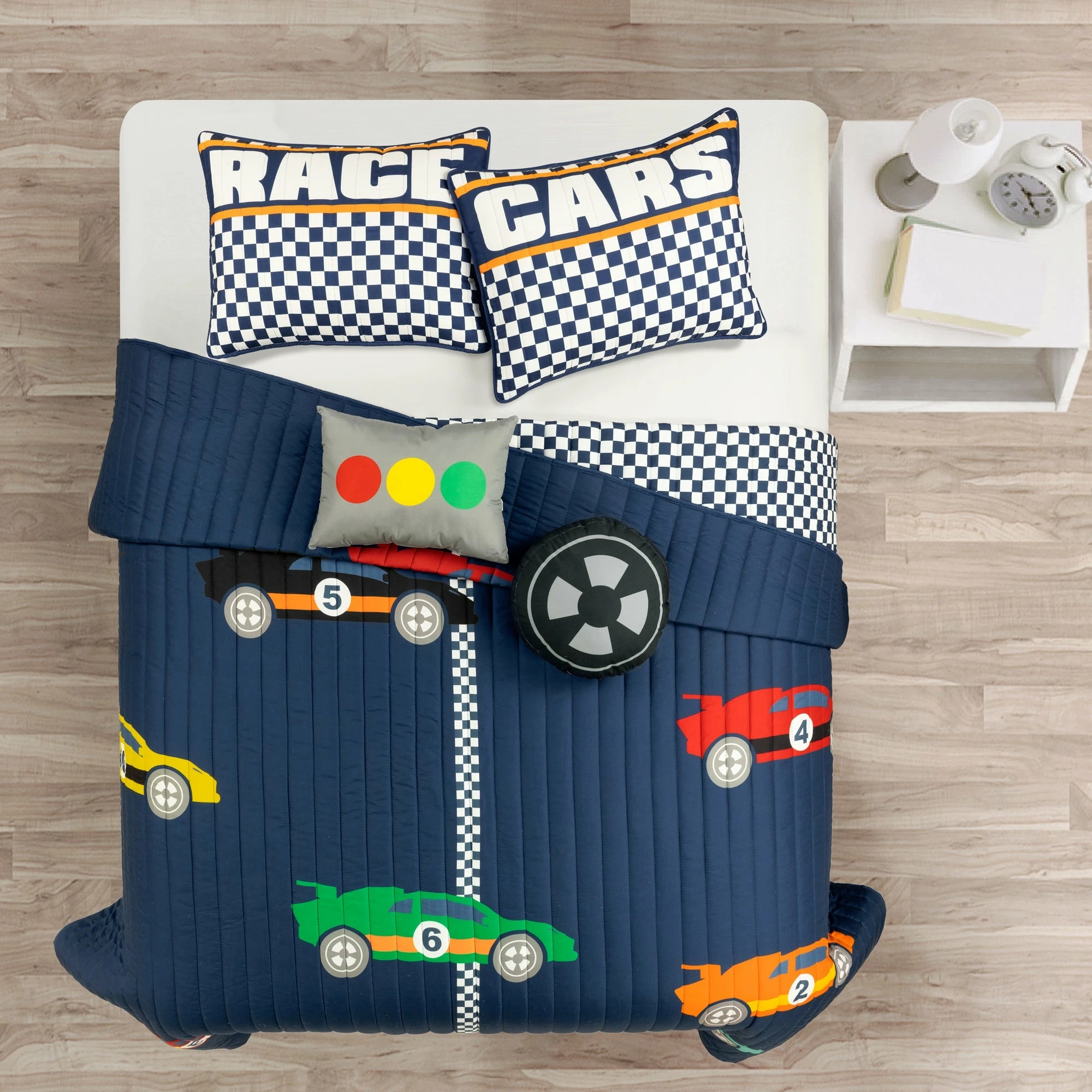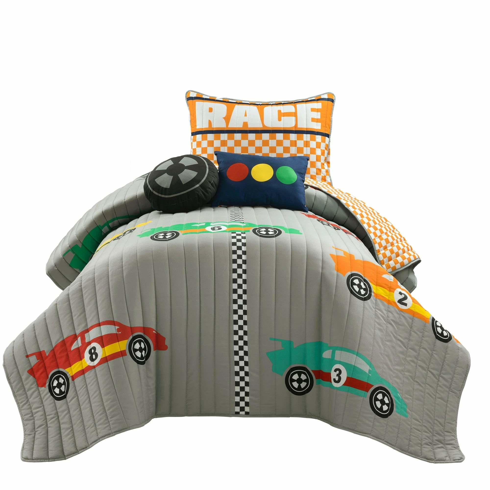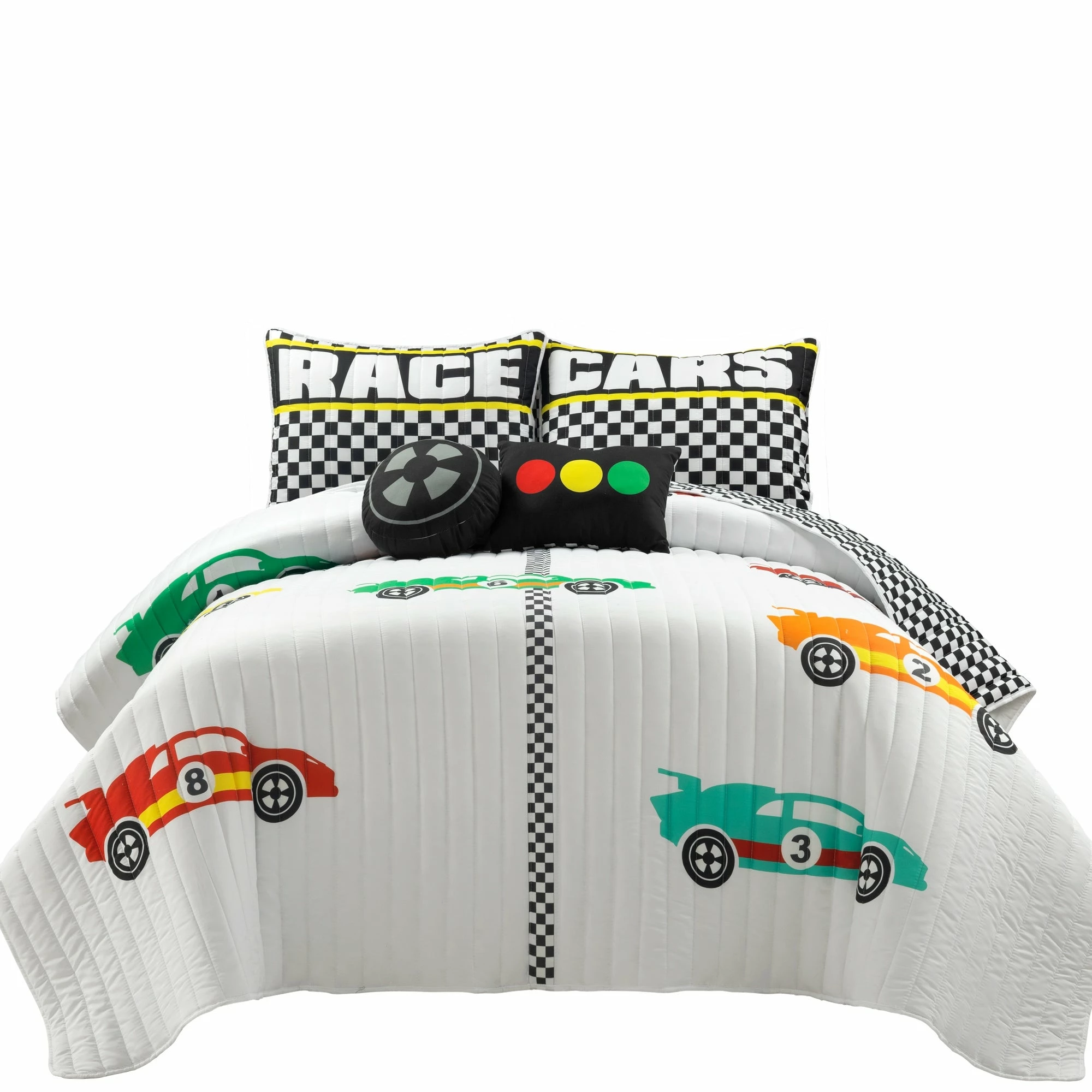 This quilt set is ideal for children and tweens. The cars racing across the finish line will ignite the imagination of anyone lucky enough to have this in his or her bedroom. This unique quilt set includes a soft reversible quilt, matching pillow shams (1 sham for twin, 2 shams for full/queen), and two decorative accent pillows. The two throw pillows compliment the design and give the set a complete and styled look. Conveniently, the quilt and shams are machine washable. The decorative pillows should be spot cleaned. Please refer to the product labels for full care instructions.