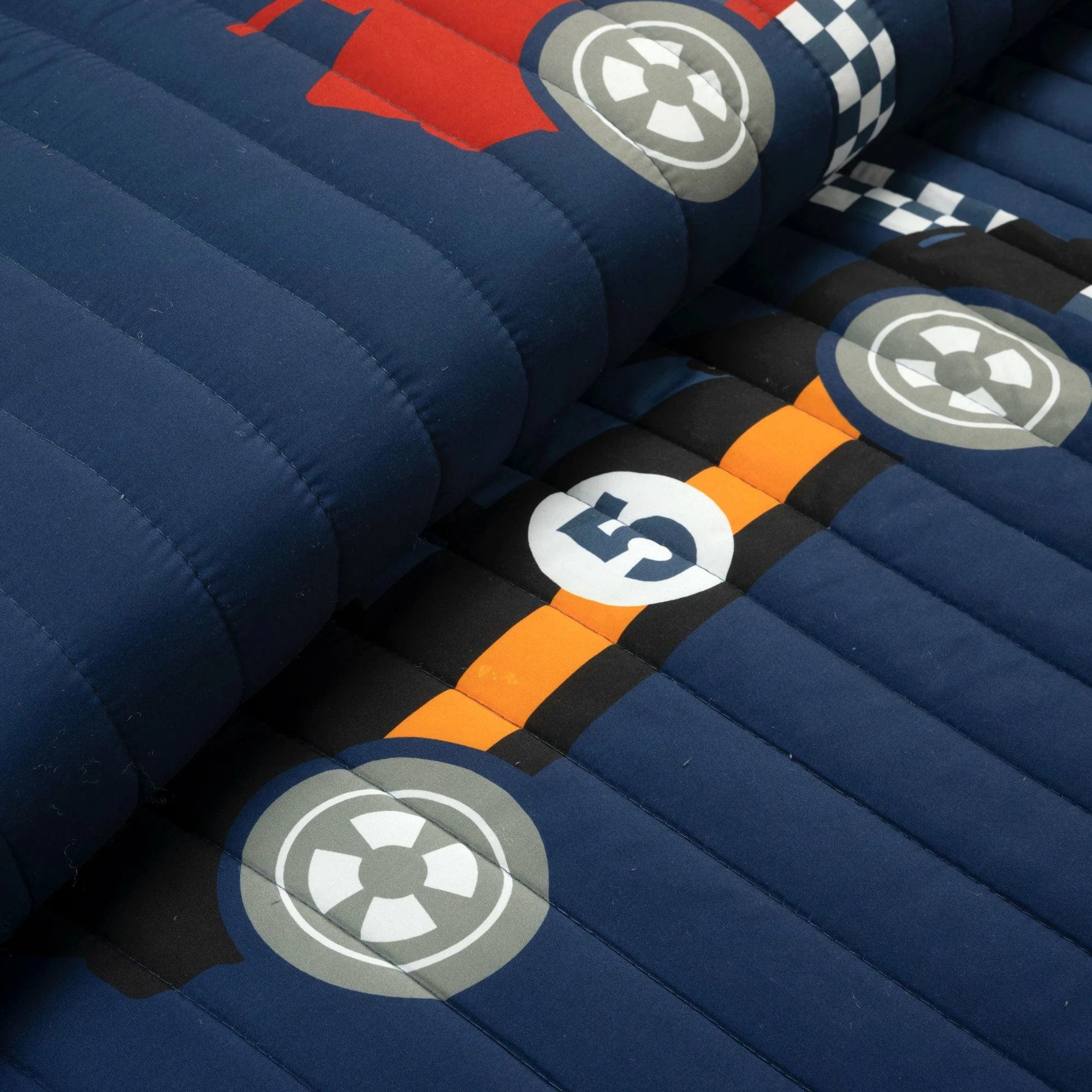 If your child loves to watch fast cars and play vintage car racing video games, this quilt set is perfect for their first big kid bedroom. The front features colorful cars crossing the finish line, while the reverse is the print on the checkered flag.