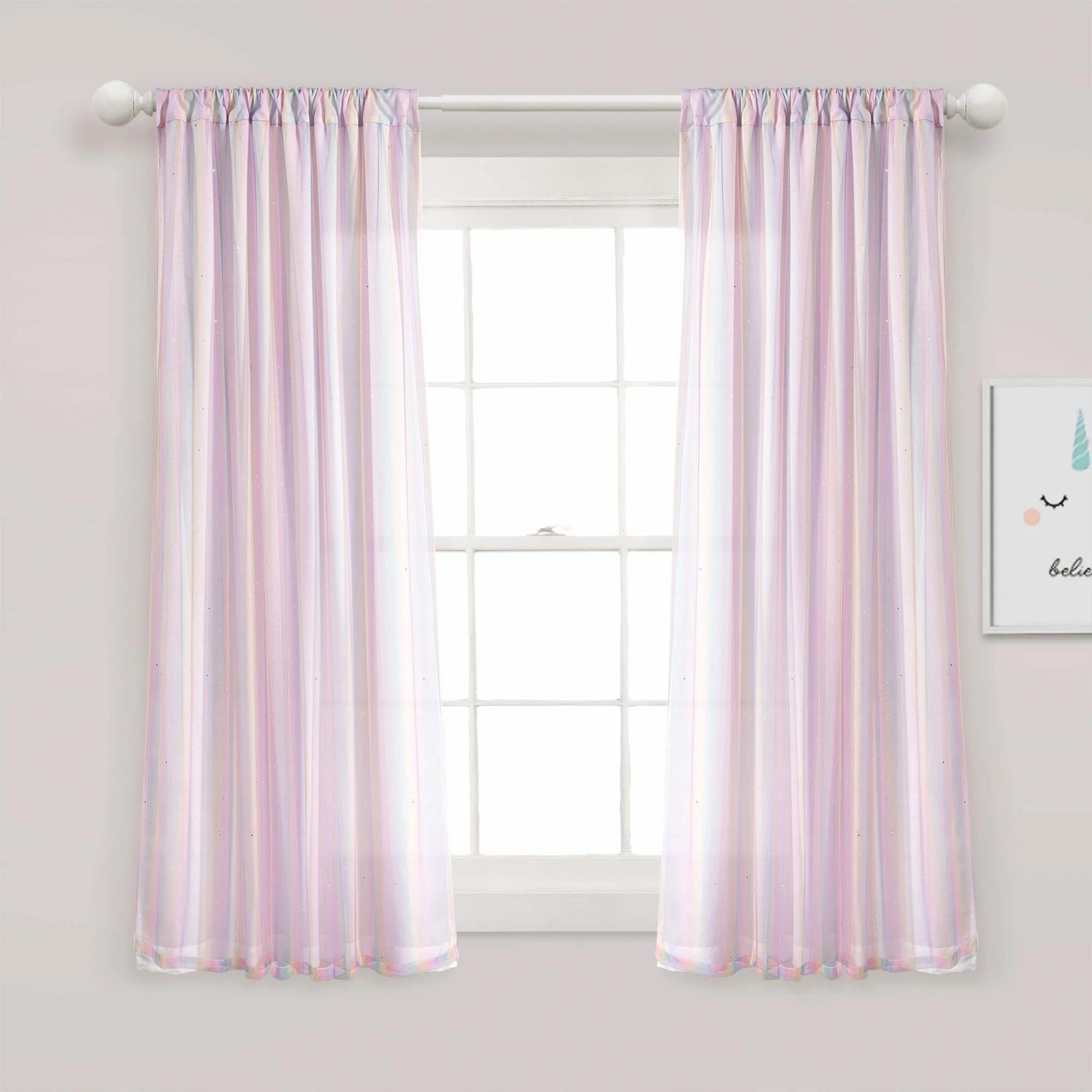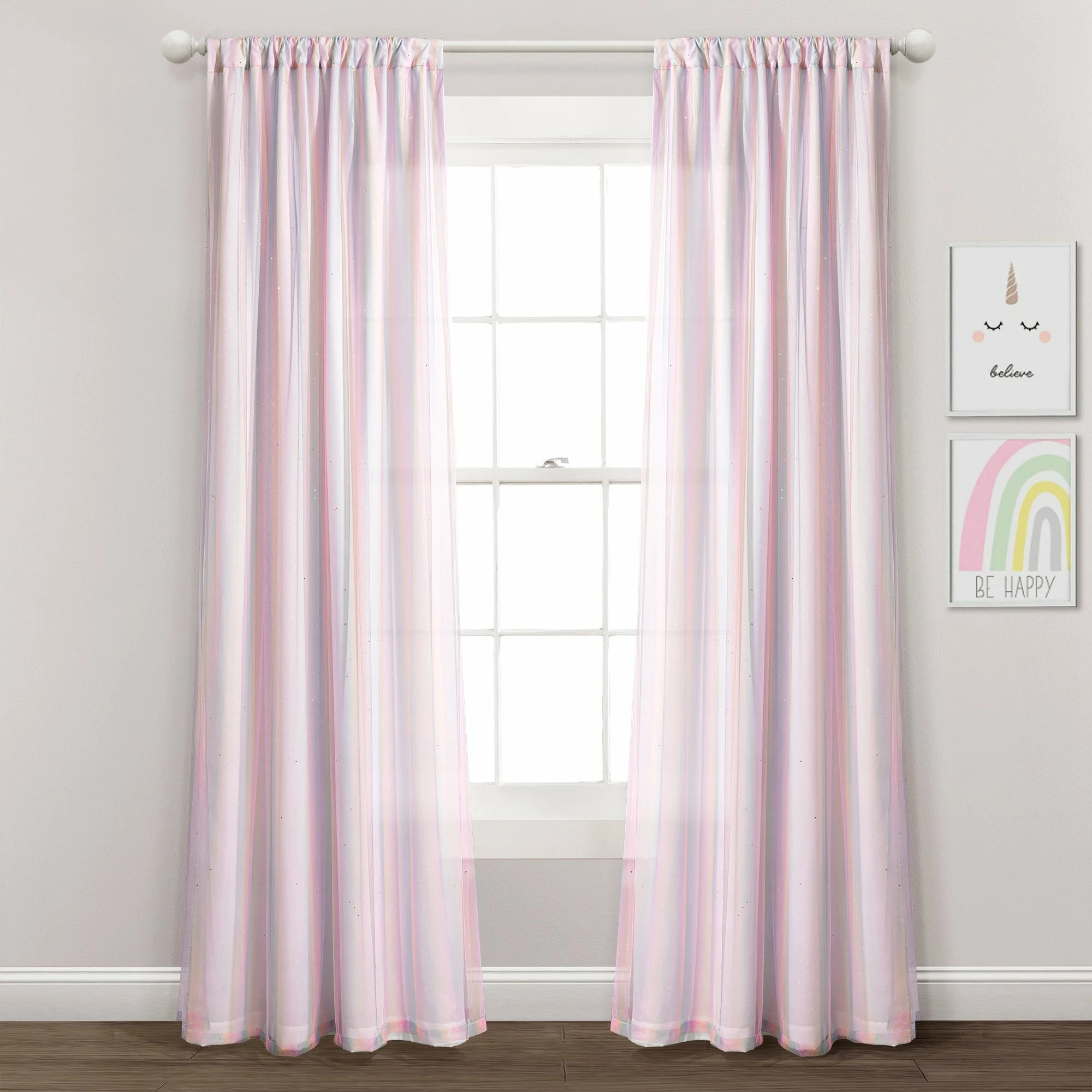 Decorate your child’s cheery, colorful bedroom with this rainbow curtain panel. The sheer overlay gives you the opportunity to style this curtain in various creative ways. The two layers are sewn together at the top of the panel. The airy rainbow fabric adds style, while the lining provides privacy. Simply hang this panel by sliding a curtain rod through the rod pocket. The width is 38 inches and this is sold as a single panel. Please refer to label for full care instructions.