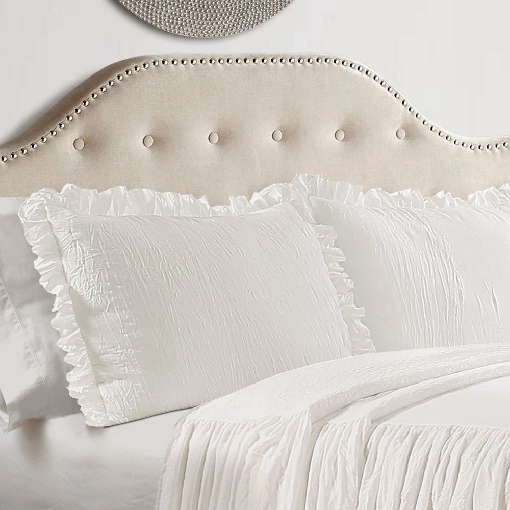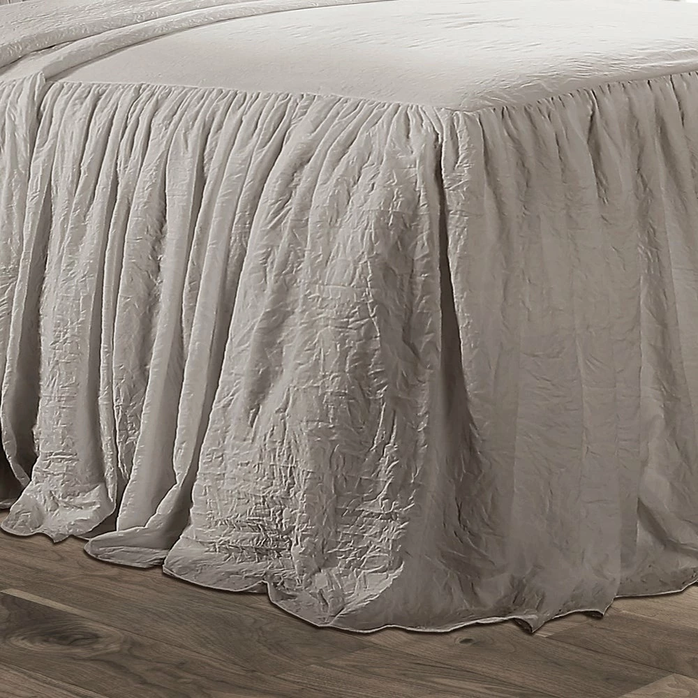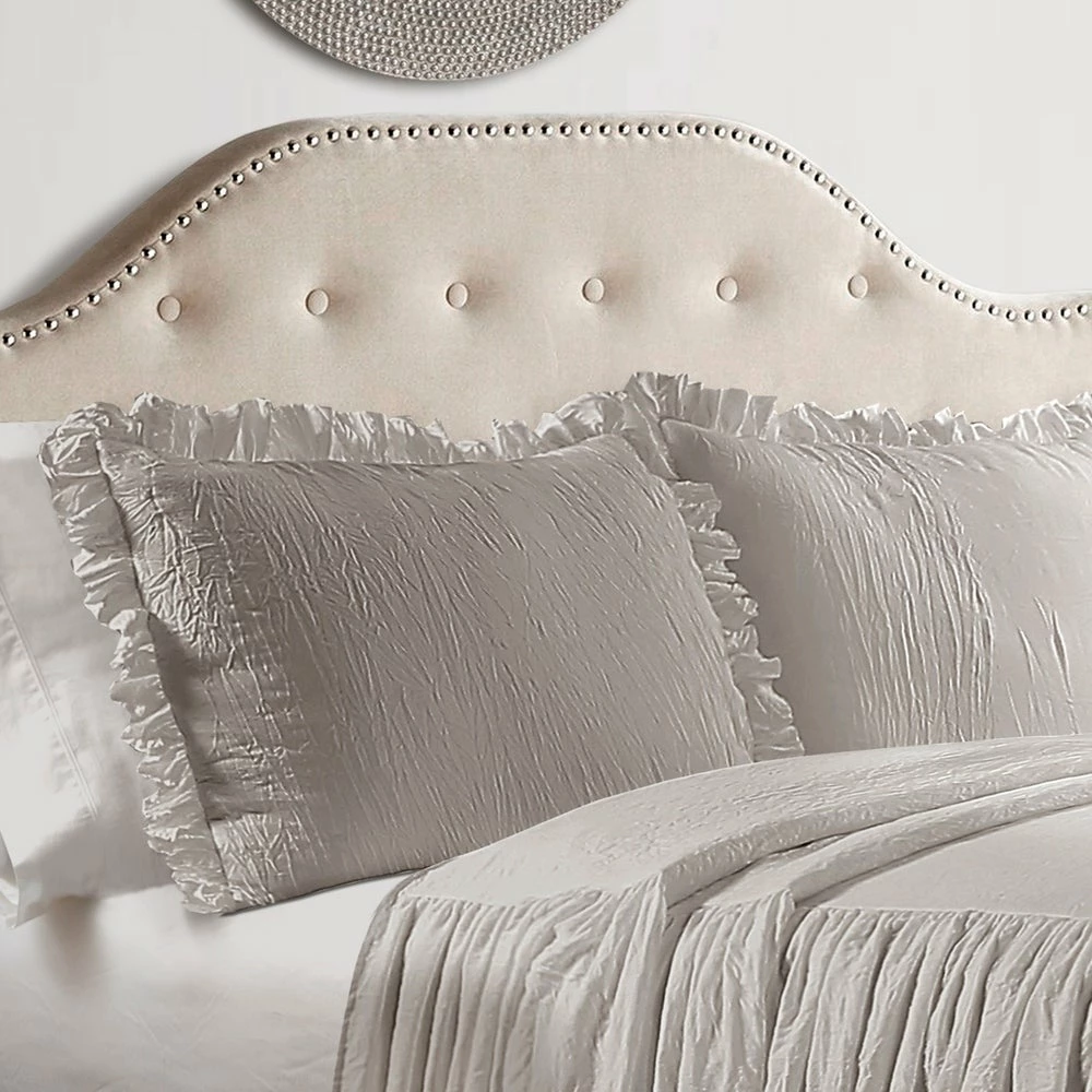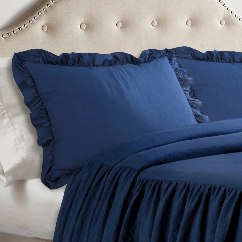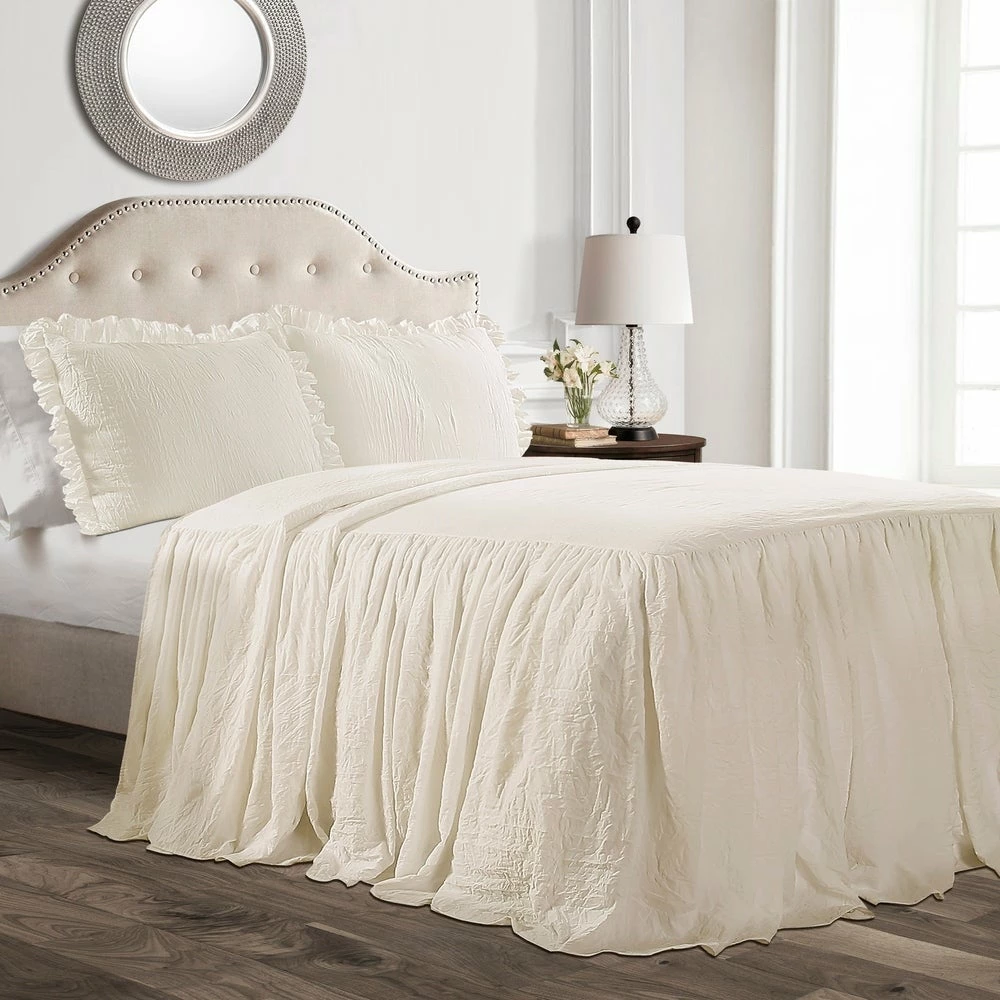 Add an airy, effortless look to your bedroom decor with this ruffled bedspread set. The set is crafted from lightweight polyester, and features a simple but stylish bedspread with an extra long, ruffled drop to create a finished look without the need for a bed skirt. Two matching shams (only one sham in twin set) complete the shabby-chic charm of this lovely set.