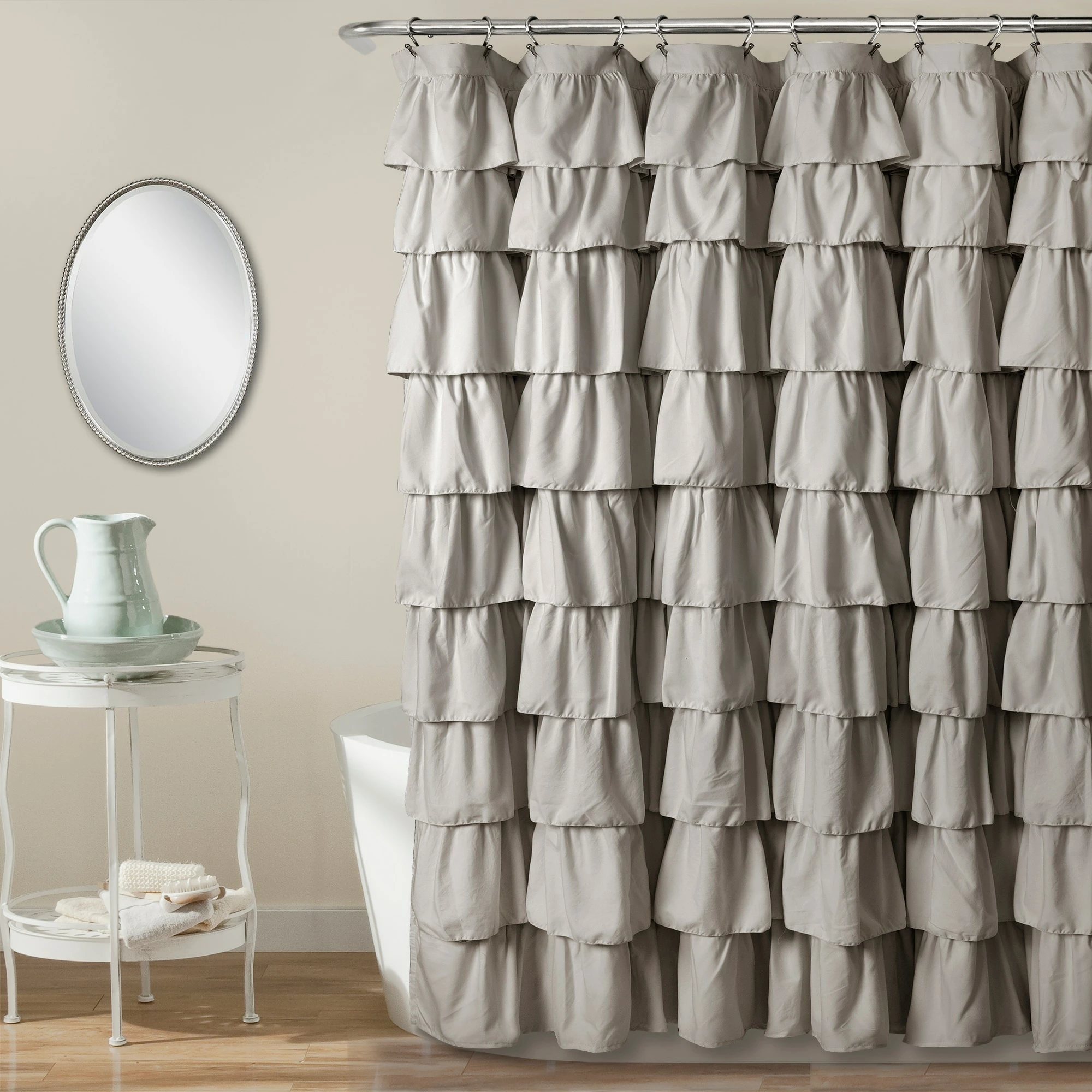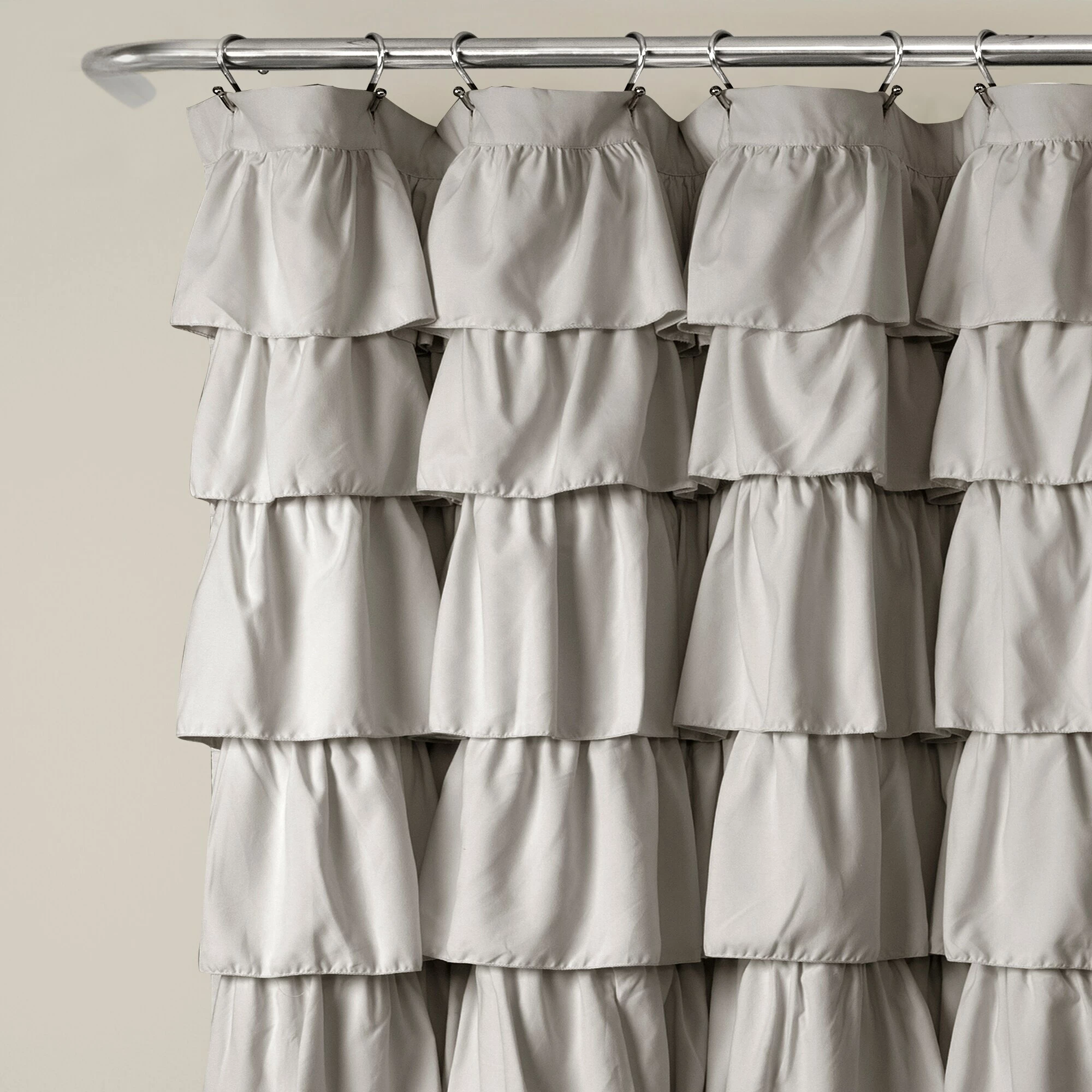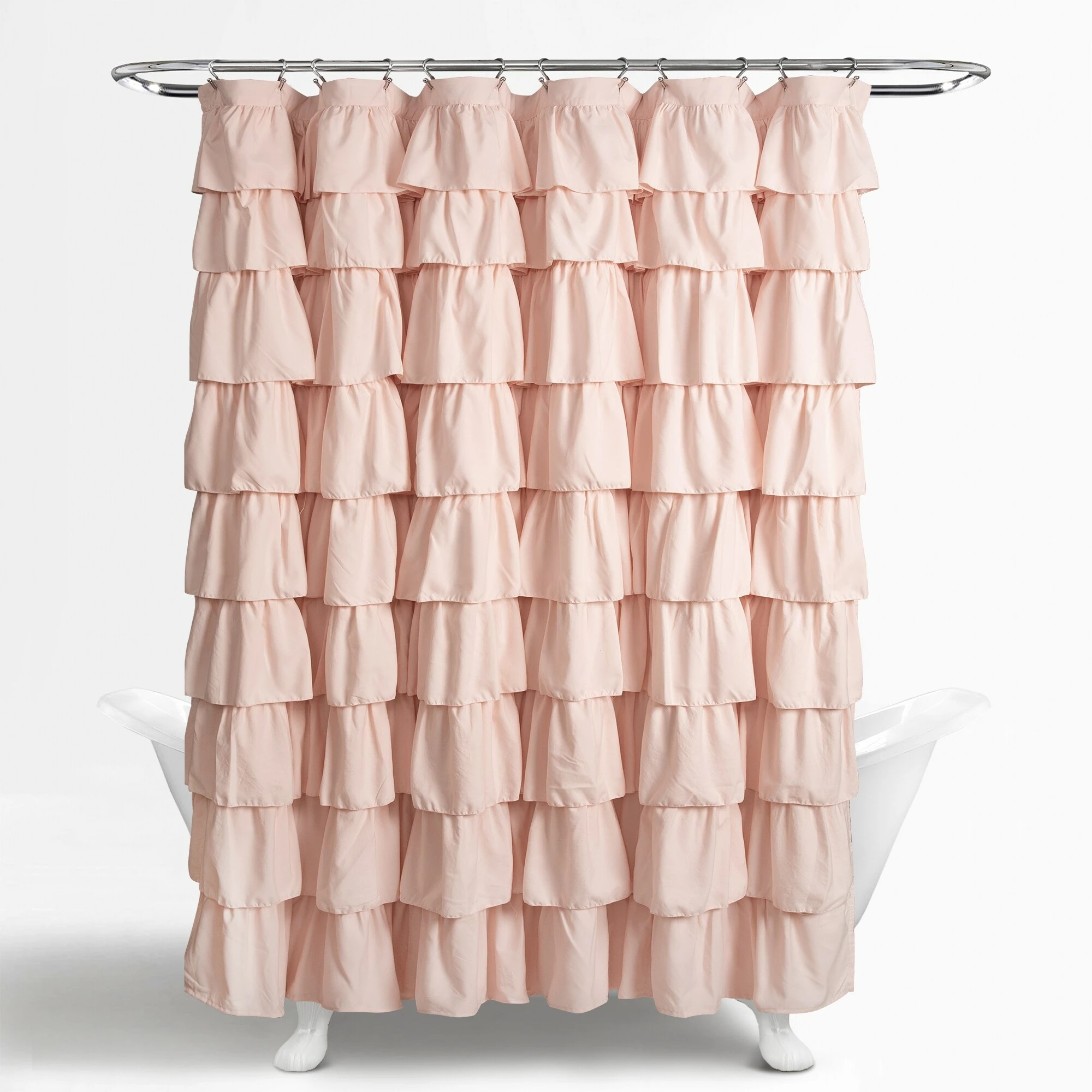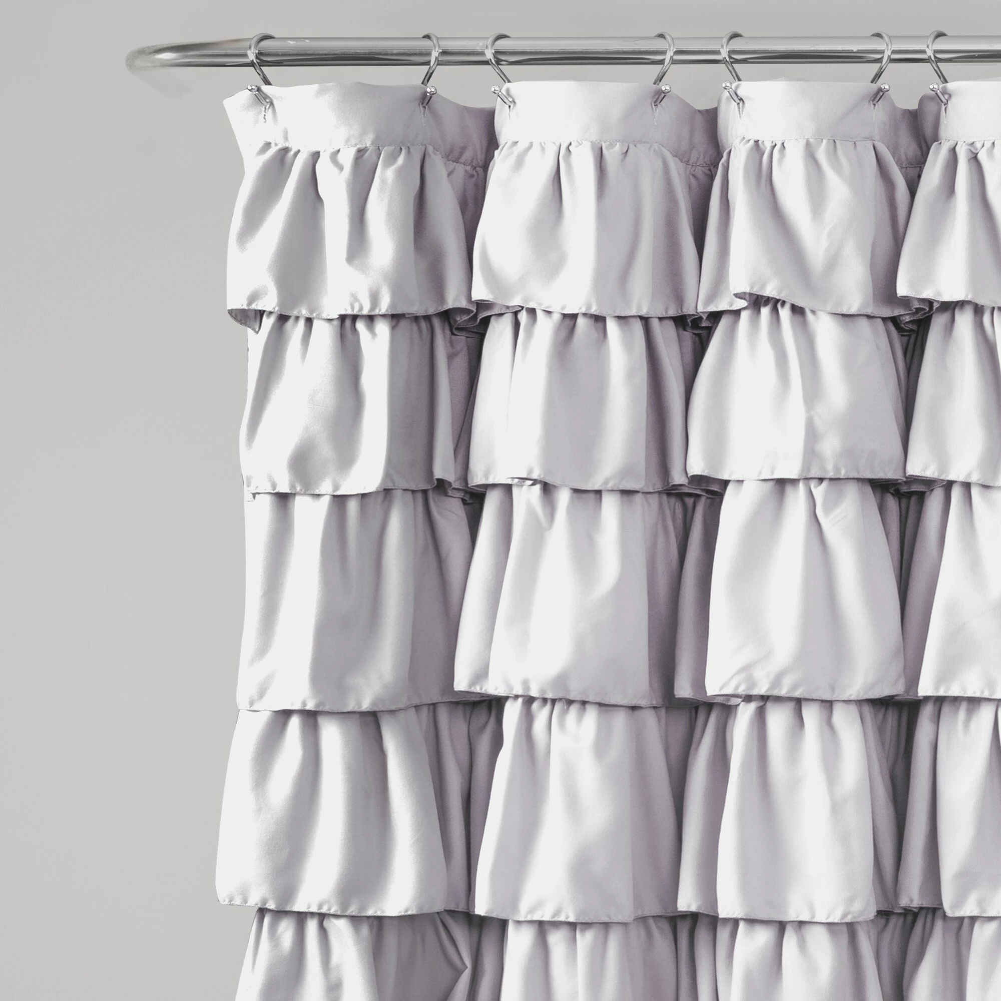 This shower curtain lends a graceful, elegant look to your bathroom. The solid-color microfiber fabric features layers of overlapping ruffles that add a cute aesthetic. Choose from blush, lilac, or light-grey to best pair with your existing decor.