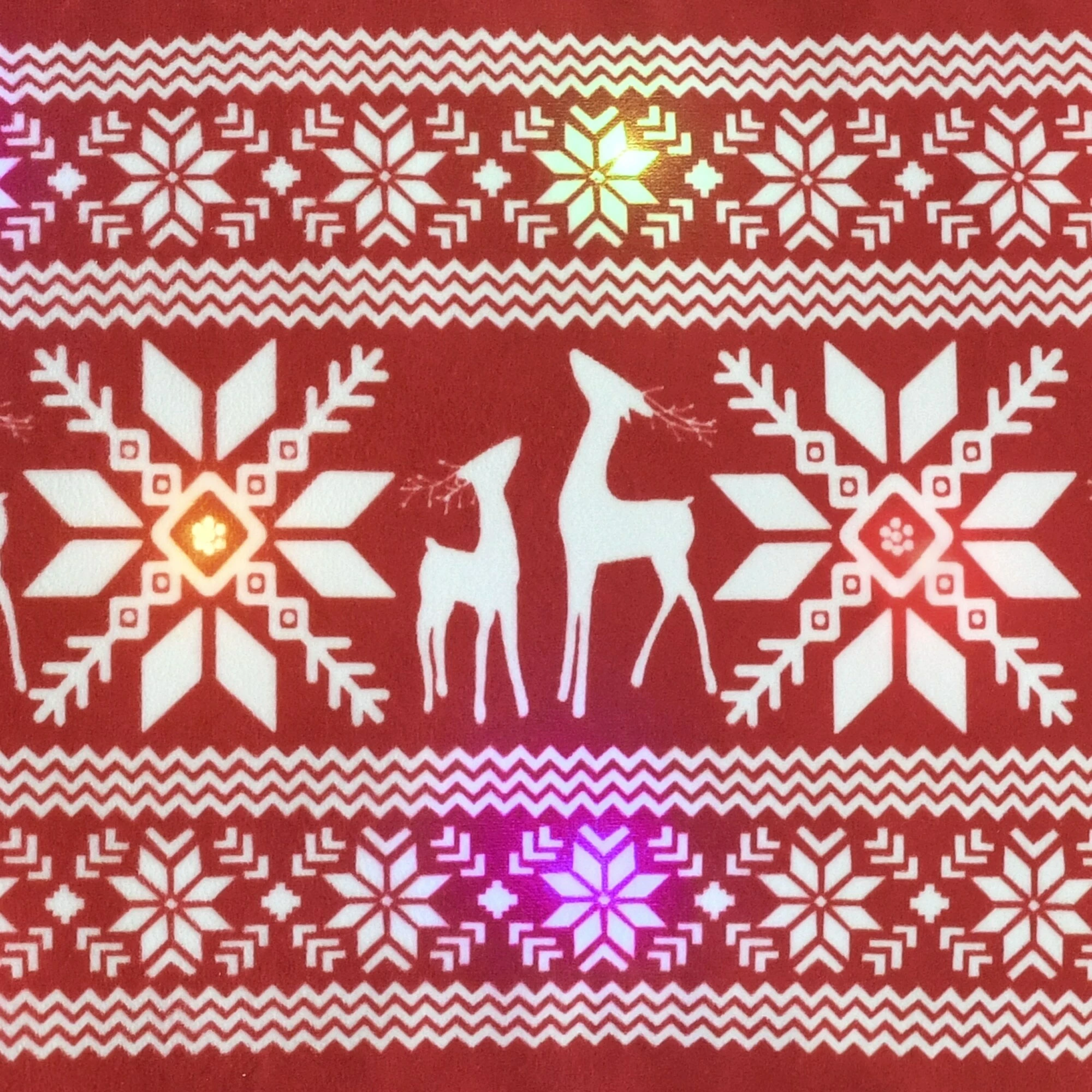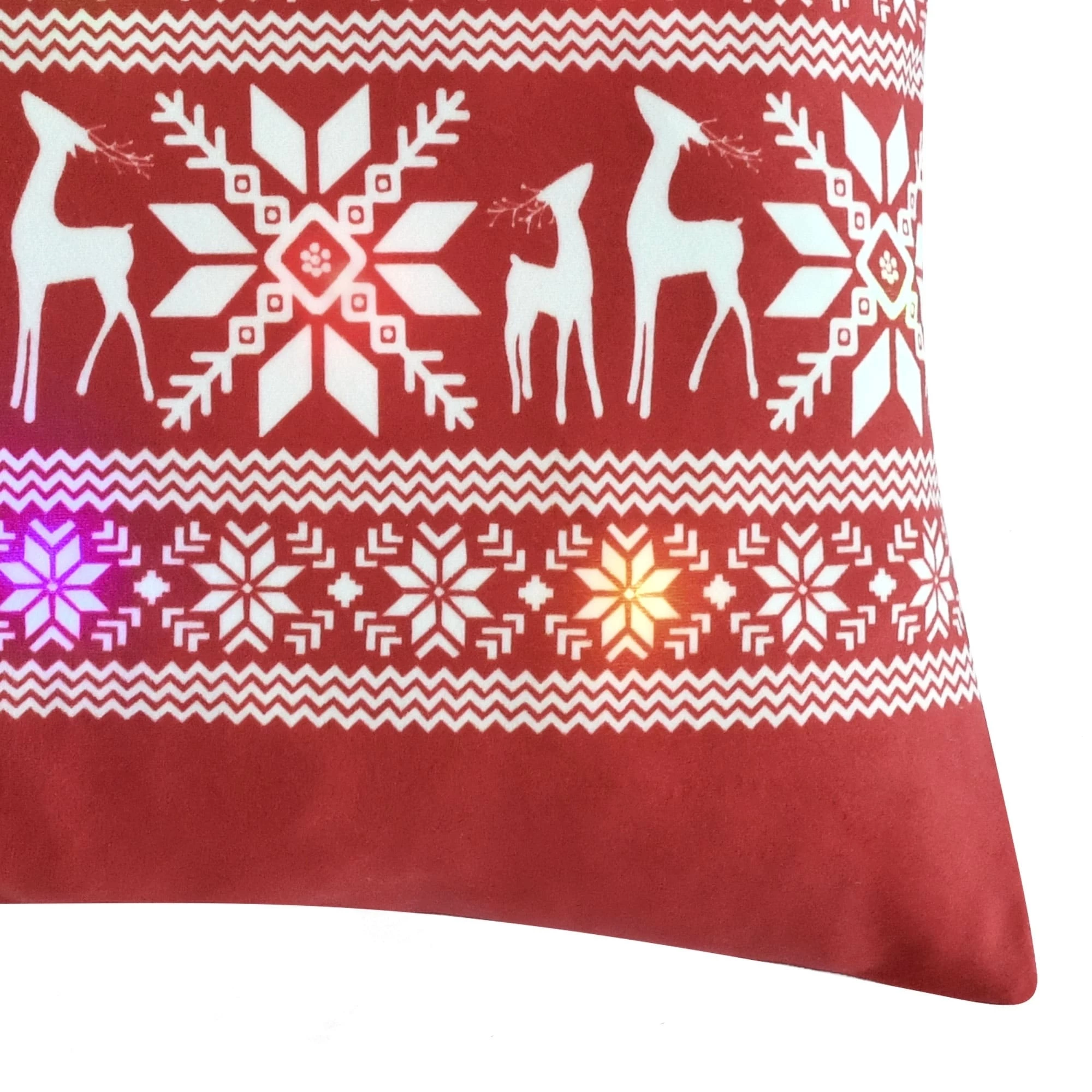 Make holiday decorating more fun with this throw pillow from Lush Decor. Crafted with a sweater-style cover patterned with adorable reindeer and geometric snowflakes, this red and white pillow amps up the Christmas vibes in your living room or bedroom. Hidden inside the cover, a variety of LED lights brings a burst of color and light for an extra-festive look. The polyester fill adds extra softness to your sofa, and the rectangular shape supports your lower back or head for maximum comfort.Features: