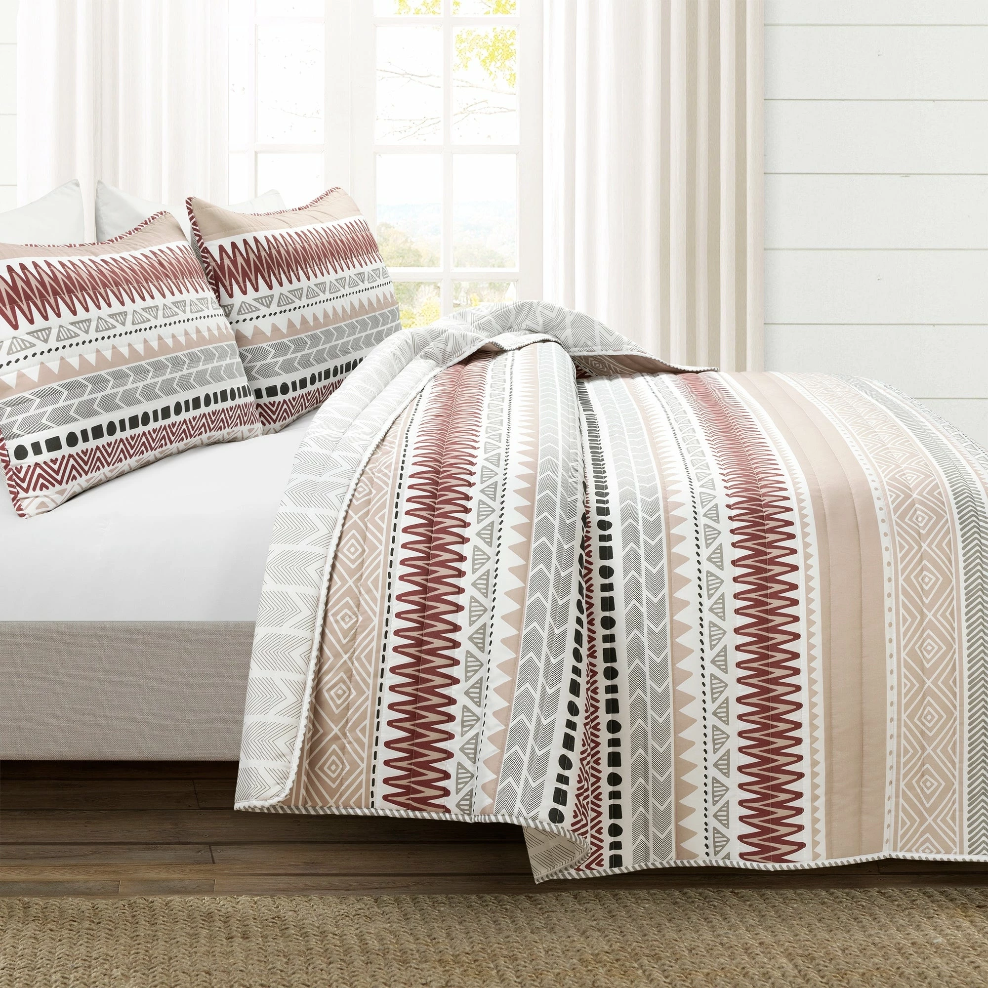 Bring warm and rustic southwest style to your bedroom with this STANDARD 100 by OEKO-TEXยฎ certified quilt set. Each piece is painted with Aztec inspired geometric stripes. The reverse of this 3-piece set features a pinstriped arrow design.