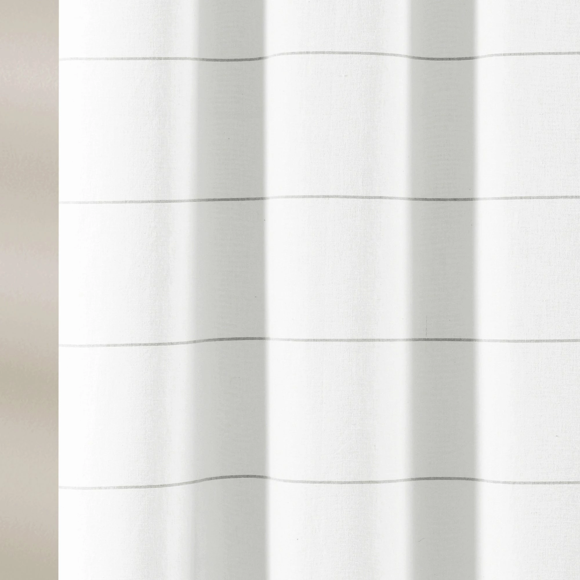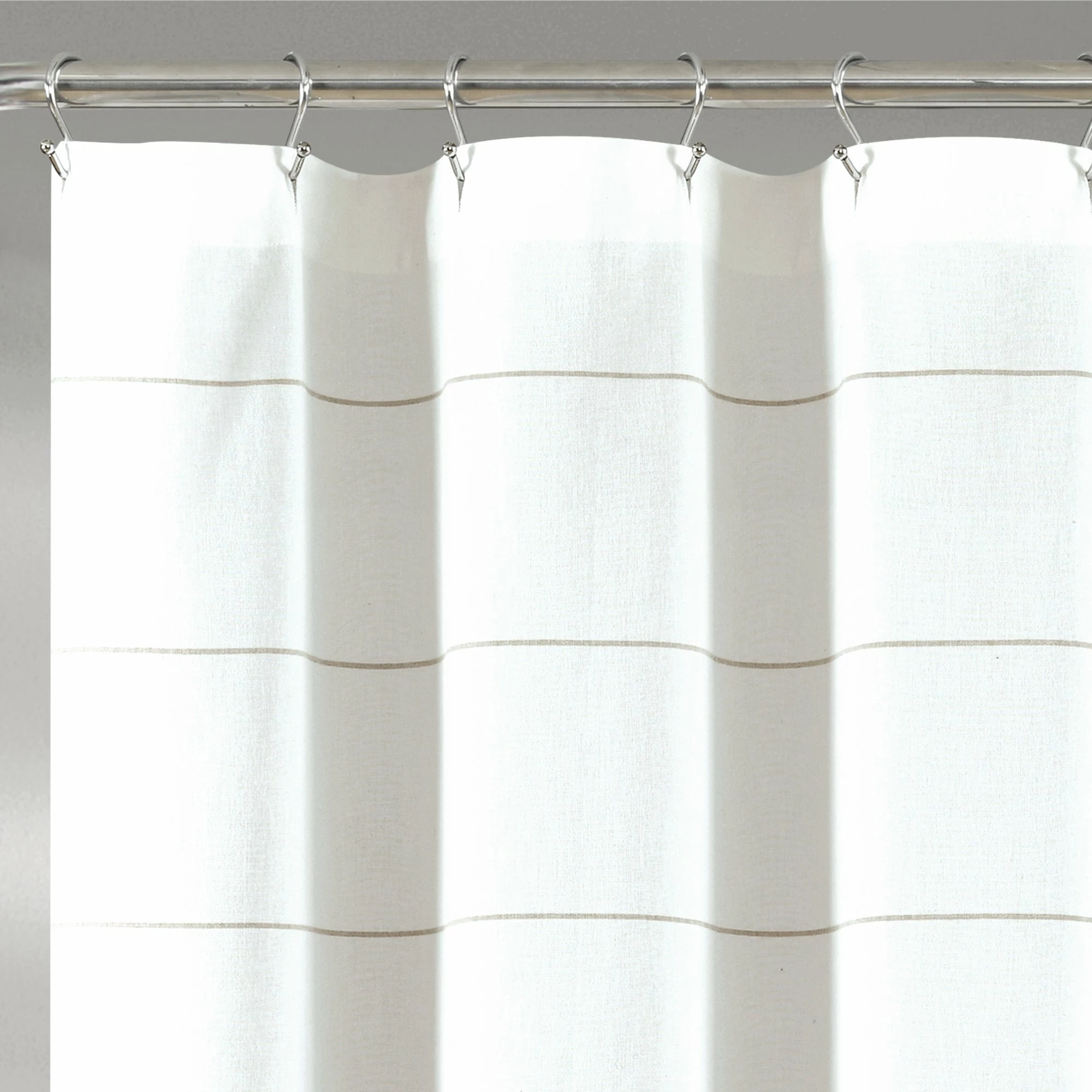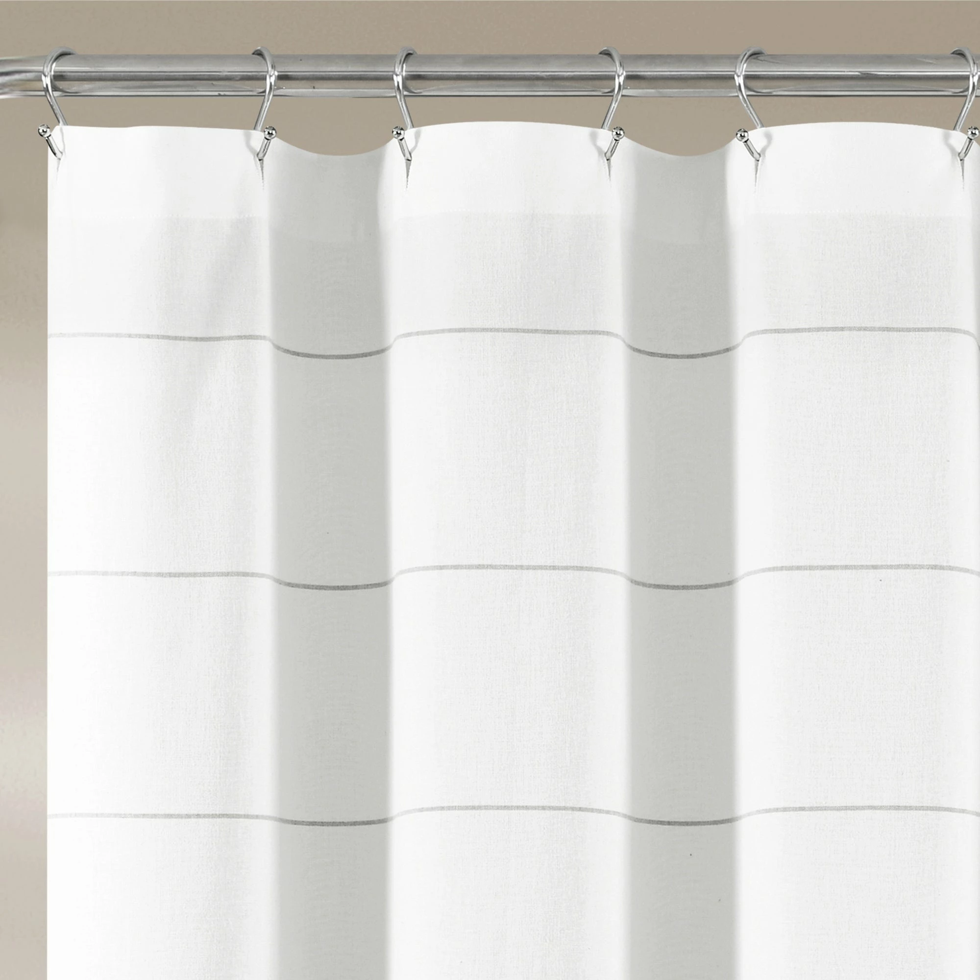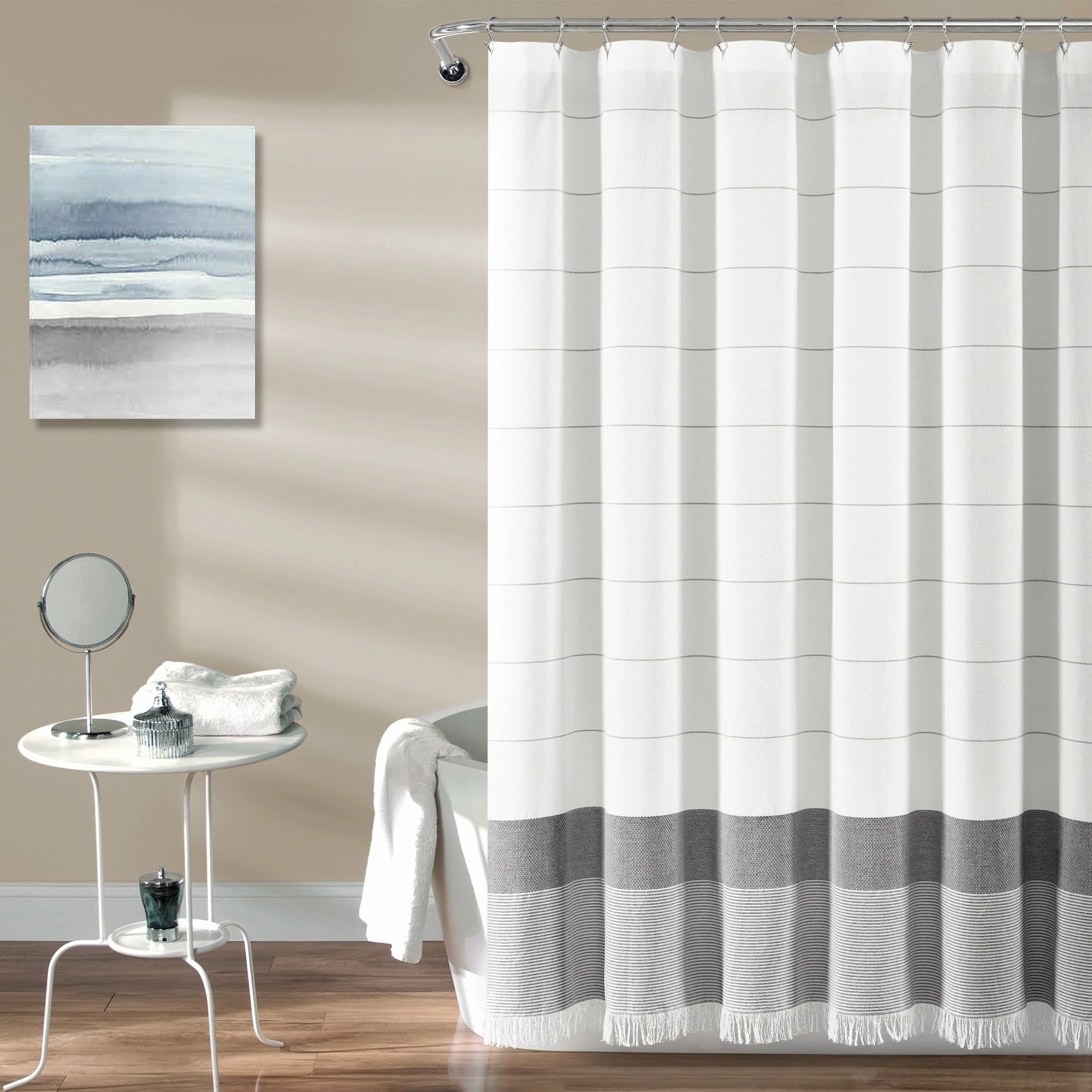 Update your master bathroom or guest bathroom with this yarn dyed woven cotton shower curtain which features horizontal stripes and tassel fringe detail across the bottom. This shower curtain would work great in a farmhouse or boho style design theme.