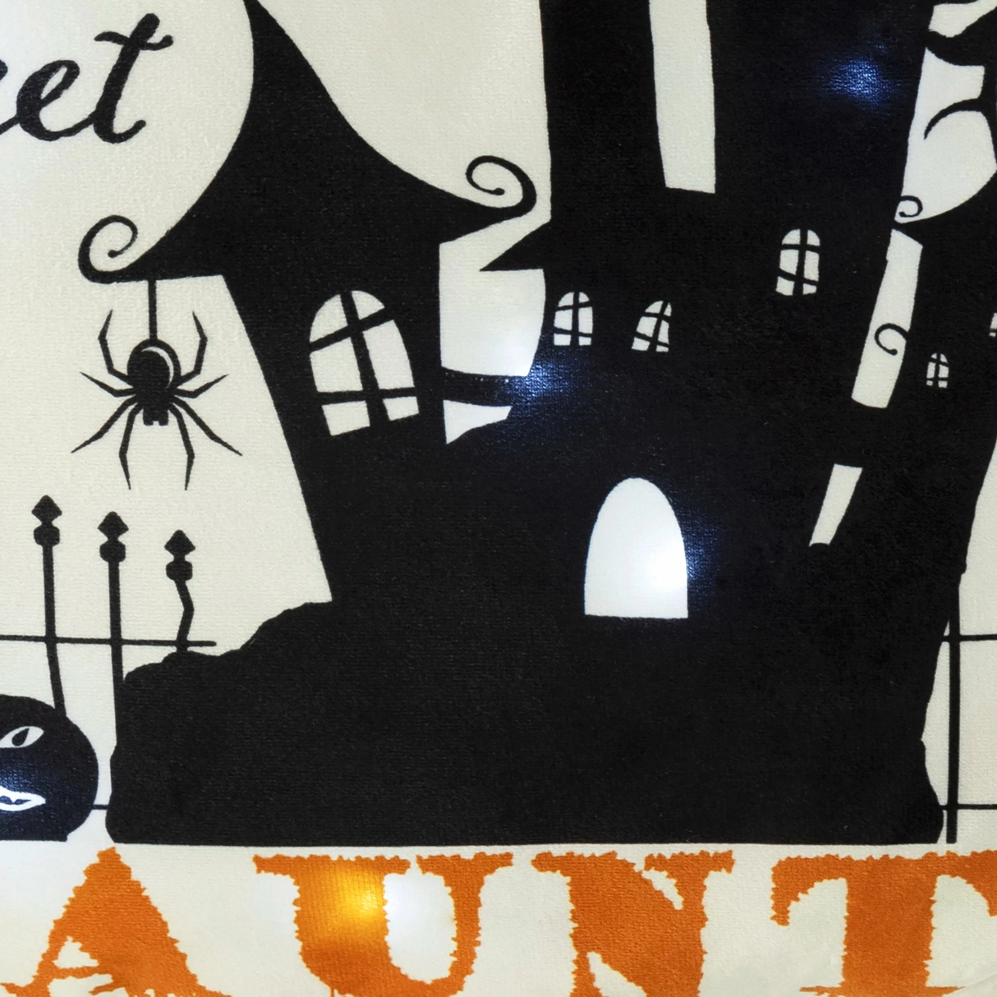 Add a playful spooky style to your home this Halloween with this haunted house themed decorative pillow. With a creative design and illuminating LED visual, this pillow is a must-have for the season.